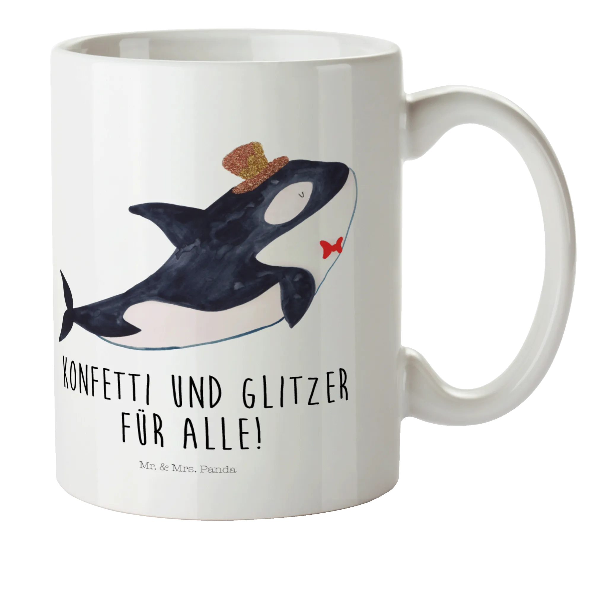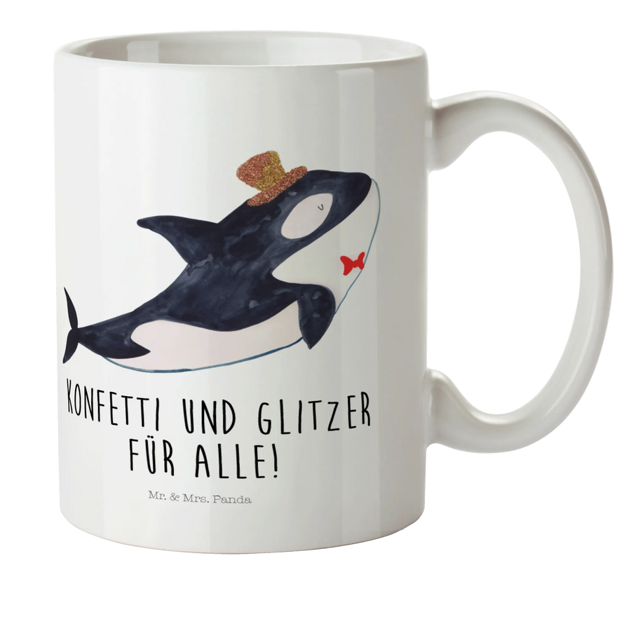 Our orca is here to bring a touch of playful elegance to your celebrations. With its glossy black and white design, accented by a vibrant cylinder hat embellished with flowers, this motif radiates charm and joy. Don't forget the adorable little red fish adding an extra hint of fun! 'Konfetti und Glitzer für alle!' perfectly captures the spirit of joy and celebration, making it ideal for birthdays or festive gatherings. It's all about letting loose, enjoying those confetti moments, and igniting a spirit of togetherness.