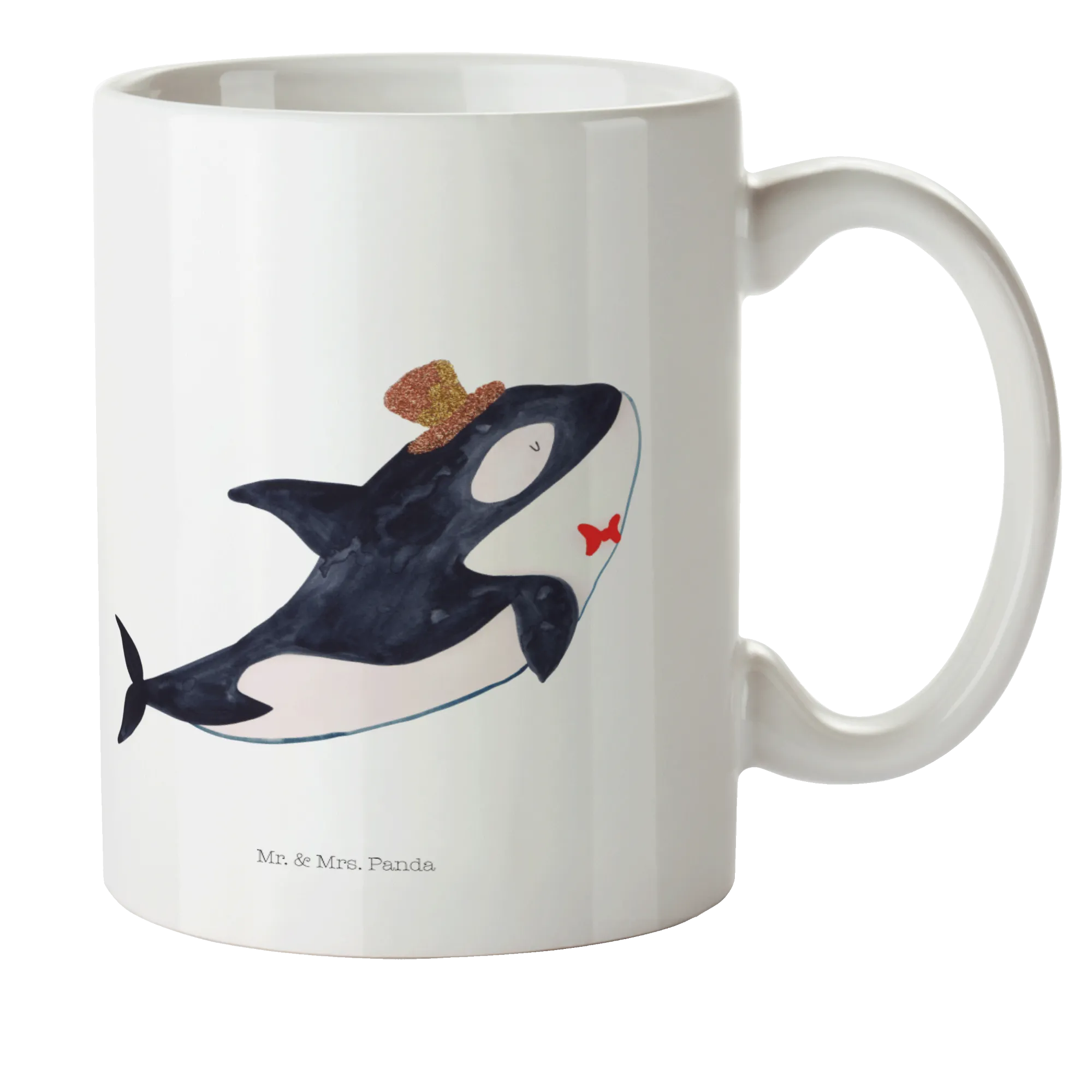 Picture this: your child grasping their new favorite coffee cup, giggling with joy as they spot the friendly orca wearing a stylish top hat, beautifully illustrated in a whimsical watercolor style. With shades of black and white, combined with a playful red fish, this cup adds a touch of fun and creativity to every sip.