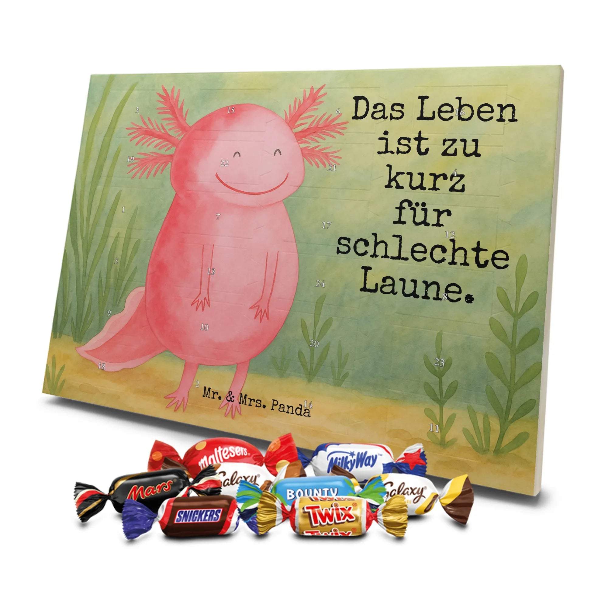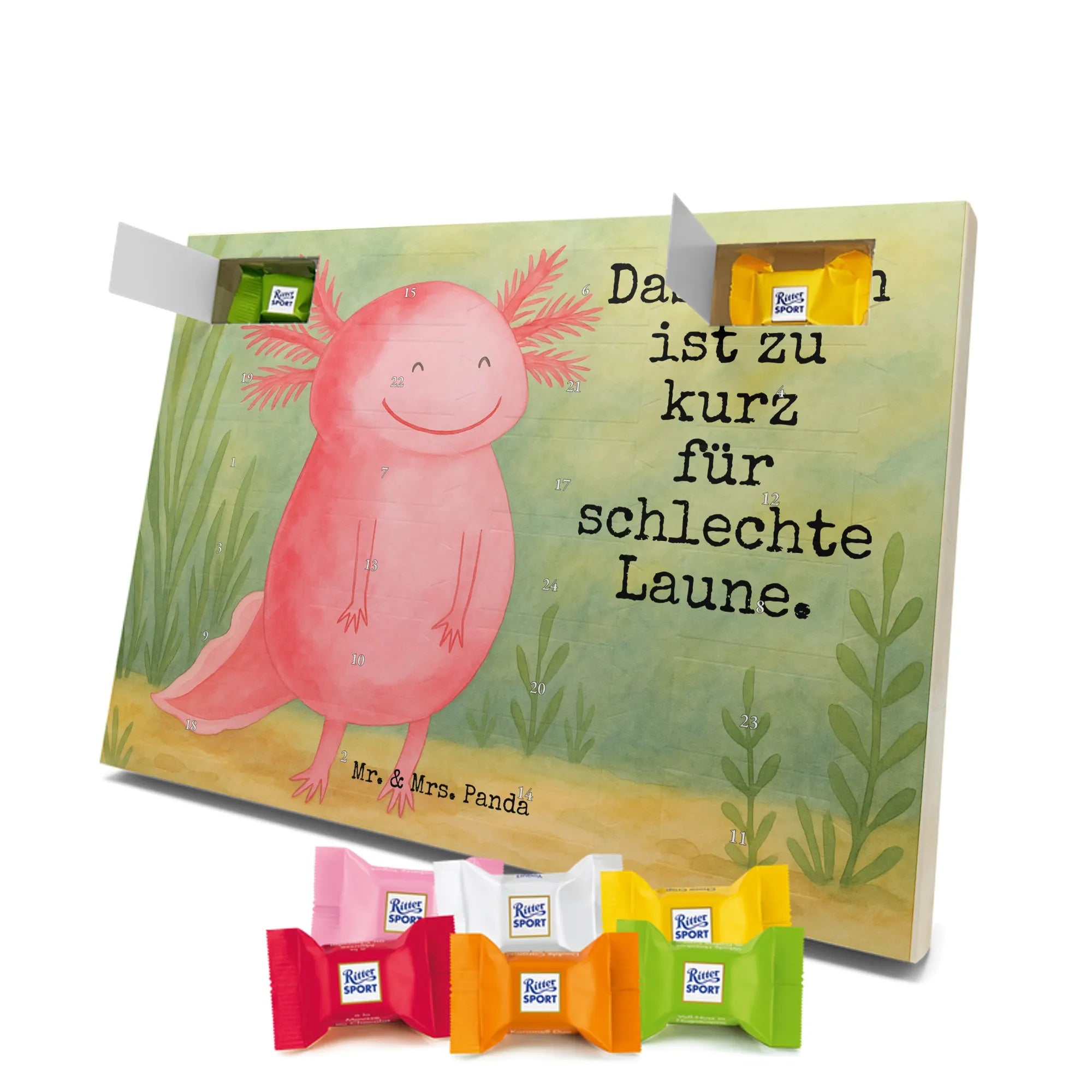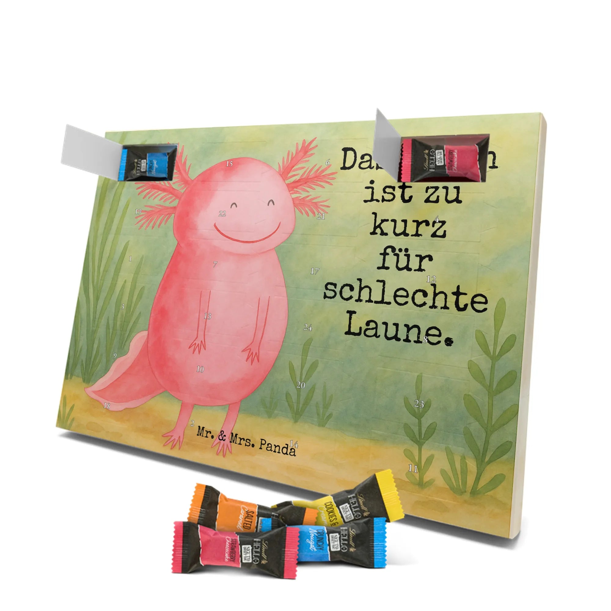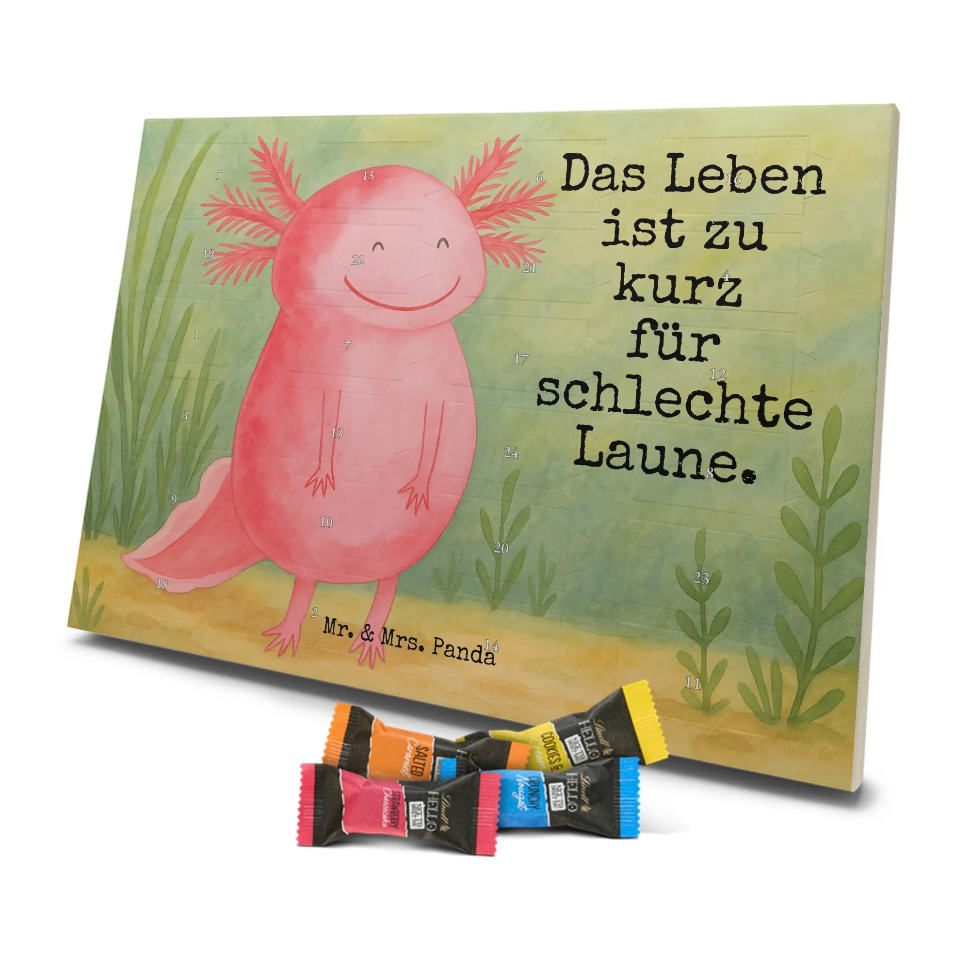Verschenke jeden Tag im Advent ein Lächeln: Unser Weihnachtskalender mit Schokolade vereint ein liebevoll gezeichnetes Axolotl-Motiv mit dem fröhlichen Slogan „Das Leben ist zu kurz
