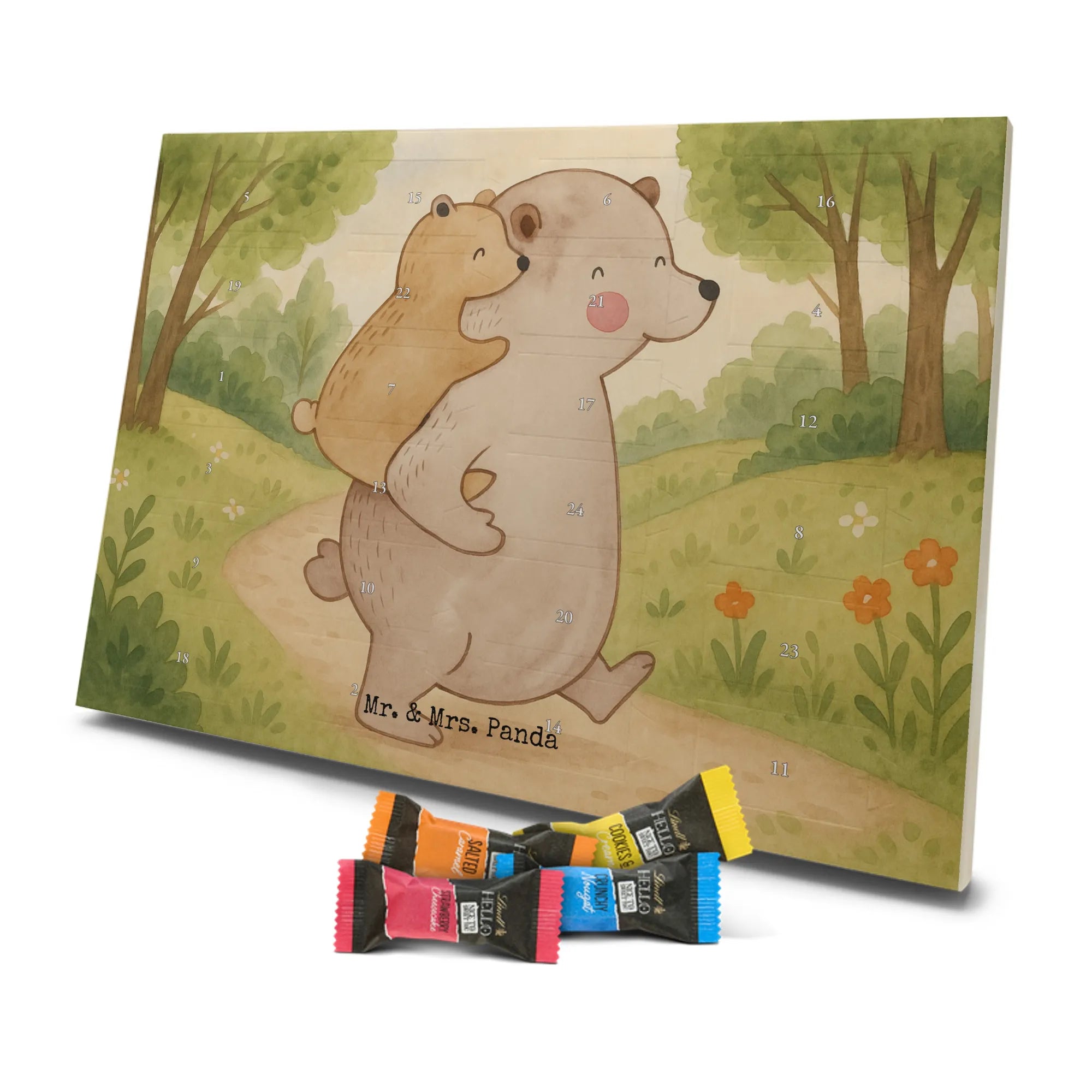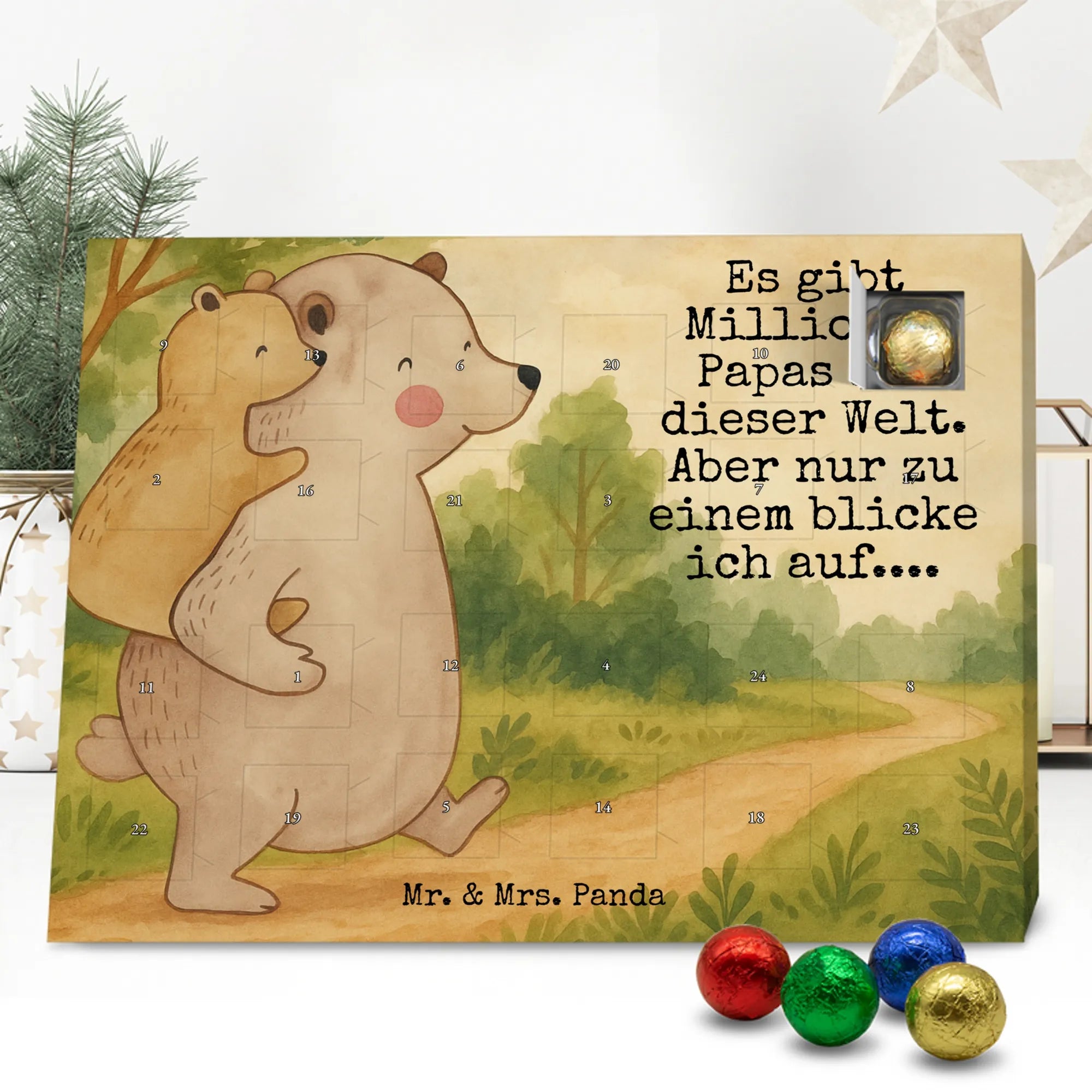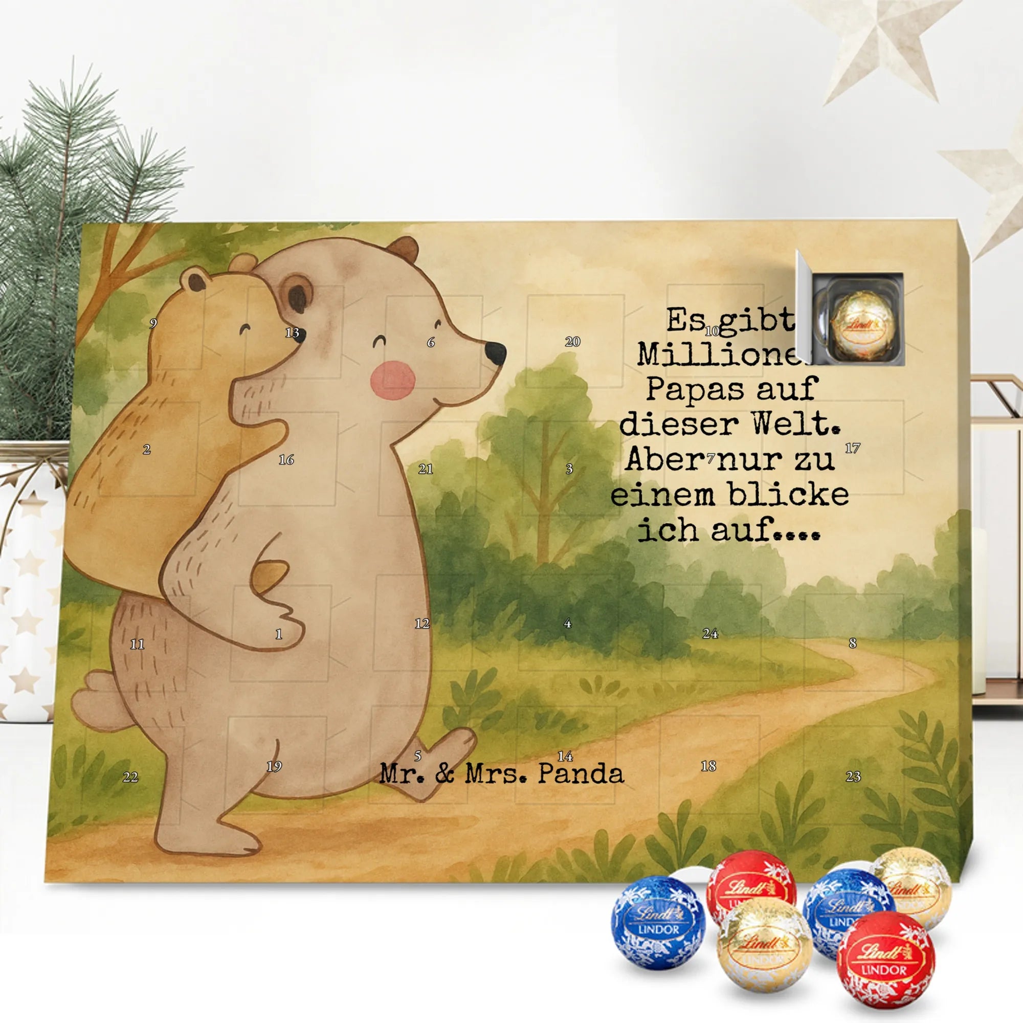 Mr. & Mrs. Panda Schoko Adventskalender „Papa Bär“ – ein Adventskalender, der Herz und Gaumen beschenkt. Das liebevoll illustrierte Motiv zeigt einen großen Bären, der einen kleineren Bären auf seinem Rücken trägt. Dieses Bild von Geborgenheit und Nähe wurde von Mrs. Panda mit Aquarell handgezeichnet und trägt den warmherzigen Slogan: „Es gibt Millionen Papas auf dieser Welt. Aber nur zu einem blicke ich auf....“
