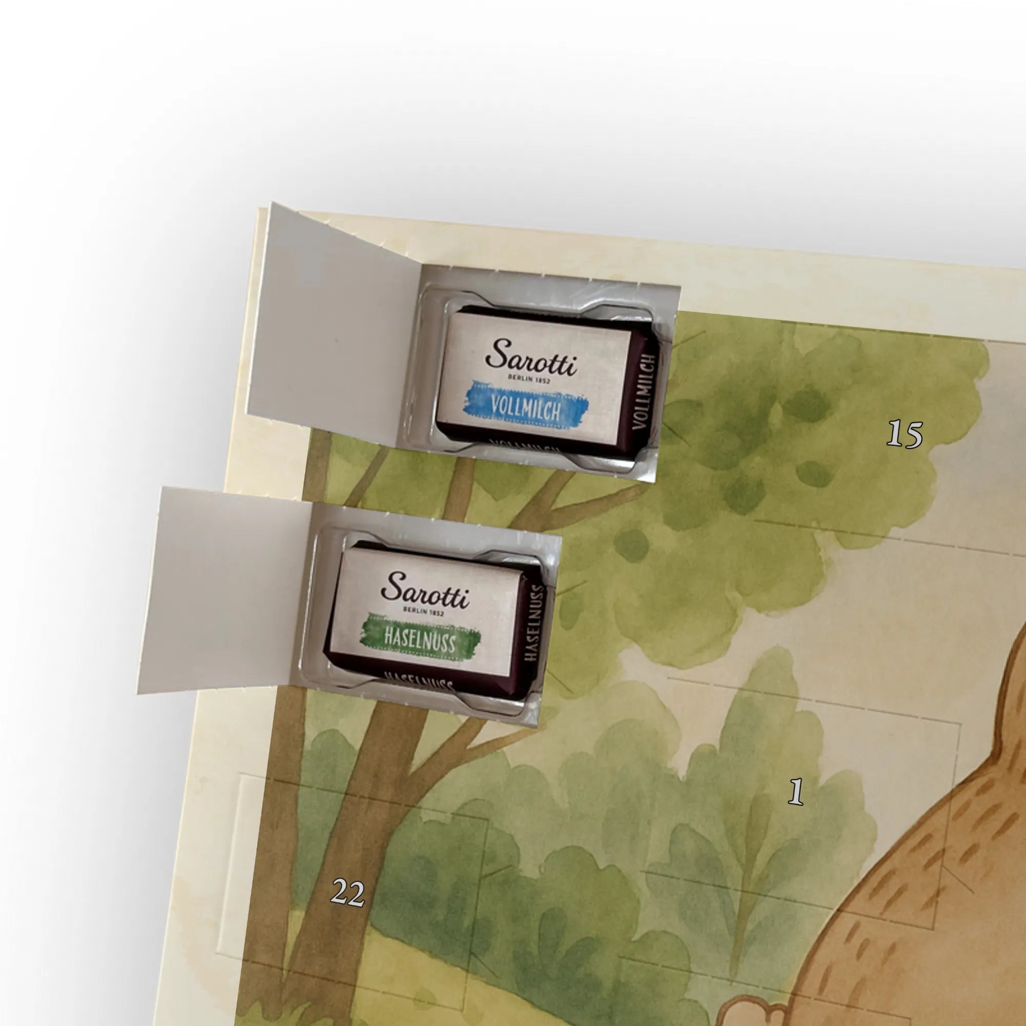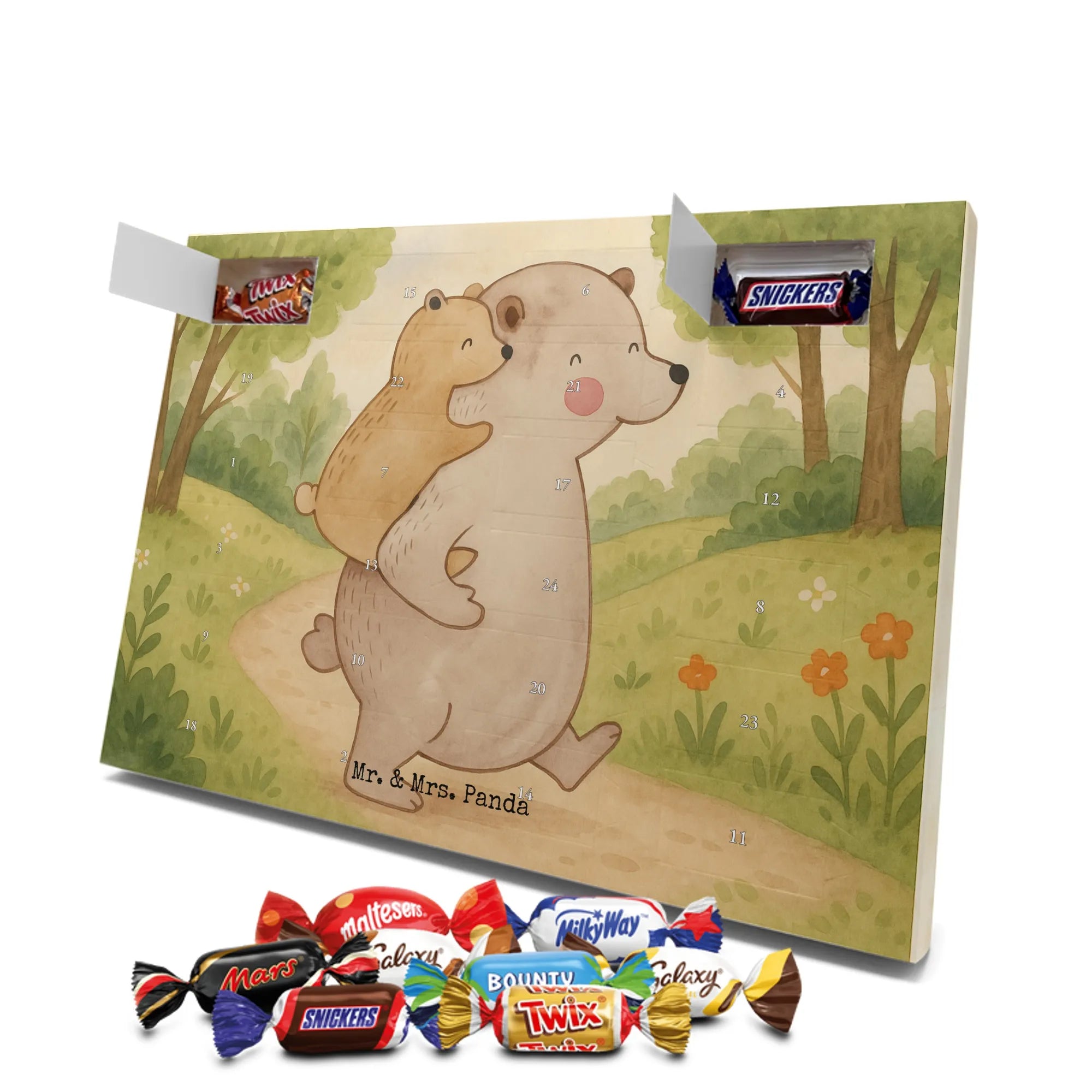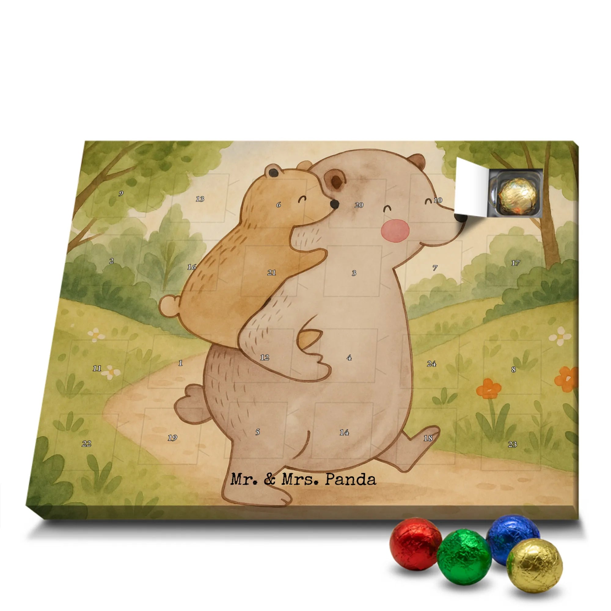 Mr. & Mrs. Panda Schoko Adventskalender „Papa Bär“ – ein Adventskalender, der Herz und Gaumen beschenkt. Das liebevoll illustrierte Motiv zeigt einen großen Bären, der einen kleineren Bären auf seinem Rücken trägt. Dieses Bild von Geborgenheit und Nähe wurde von Mrs. Panda mit Aquarell handgezeichnet und trägt den warmherzigen Slogan: „Es gibt Millionen Papas auf dieser Welt. Aber nur zu einem blicke ich auf....“