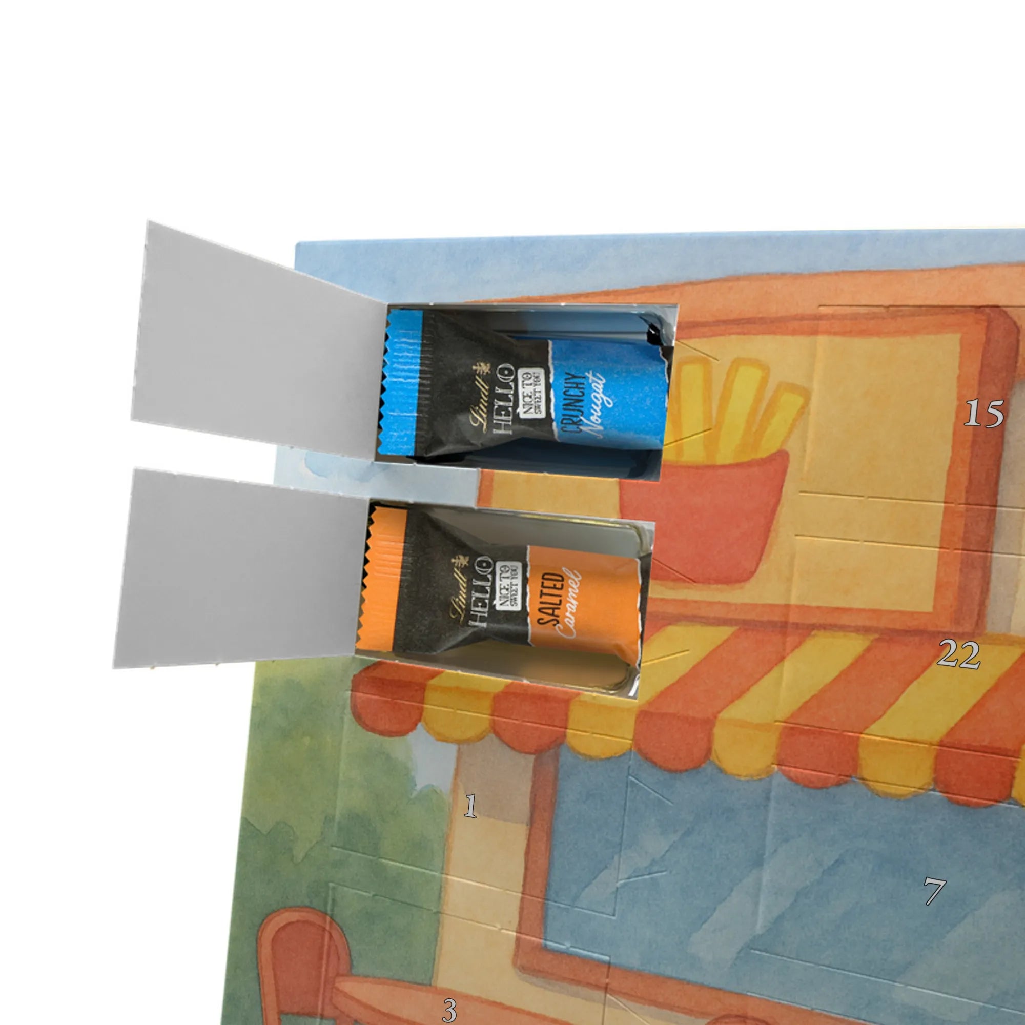 Gefüllt mit 24 einzeln verpackten Schokoladen Mini Sticks von Lindt Hello in vier köstlichen Sorten: Karamell-Schokoladenkuchen, Kekse, Knuspriger Nougat und Erdbeer-Cheesecake. Jeden Tag eine neue Nascherei, die das Warten auf Weihnachten versüßt. Bitte achte auf die Allergene: Milcheiweiß, Milchzucker, Soja, Weizen, Haselnüsse; kann Mandeln und andere Schalenfrüchte enthalten.