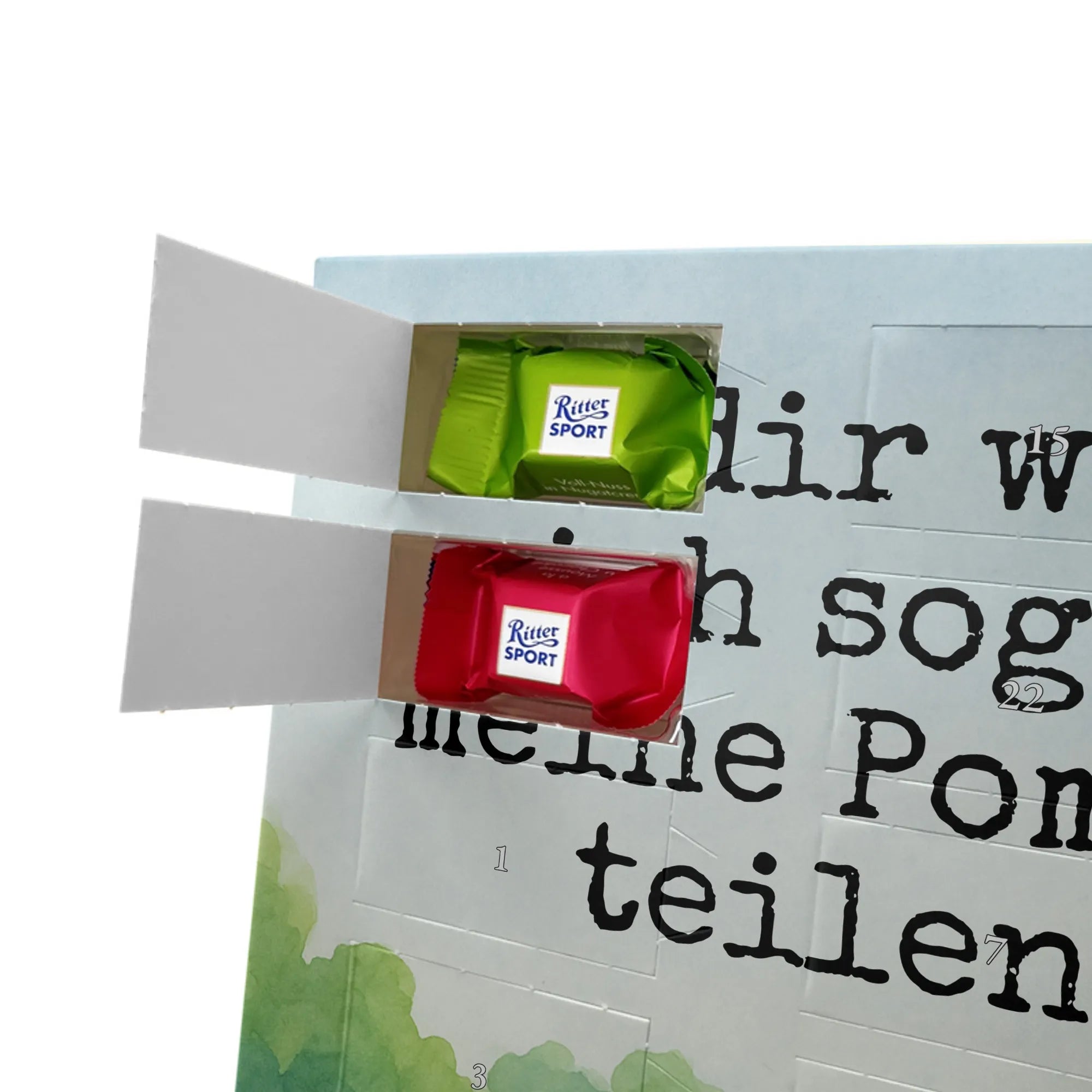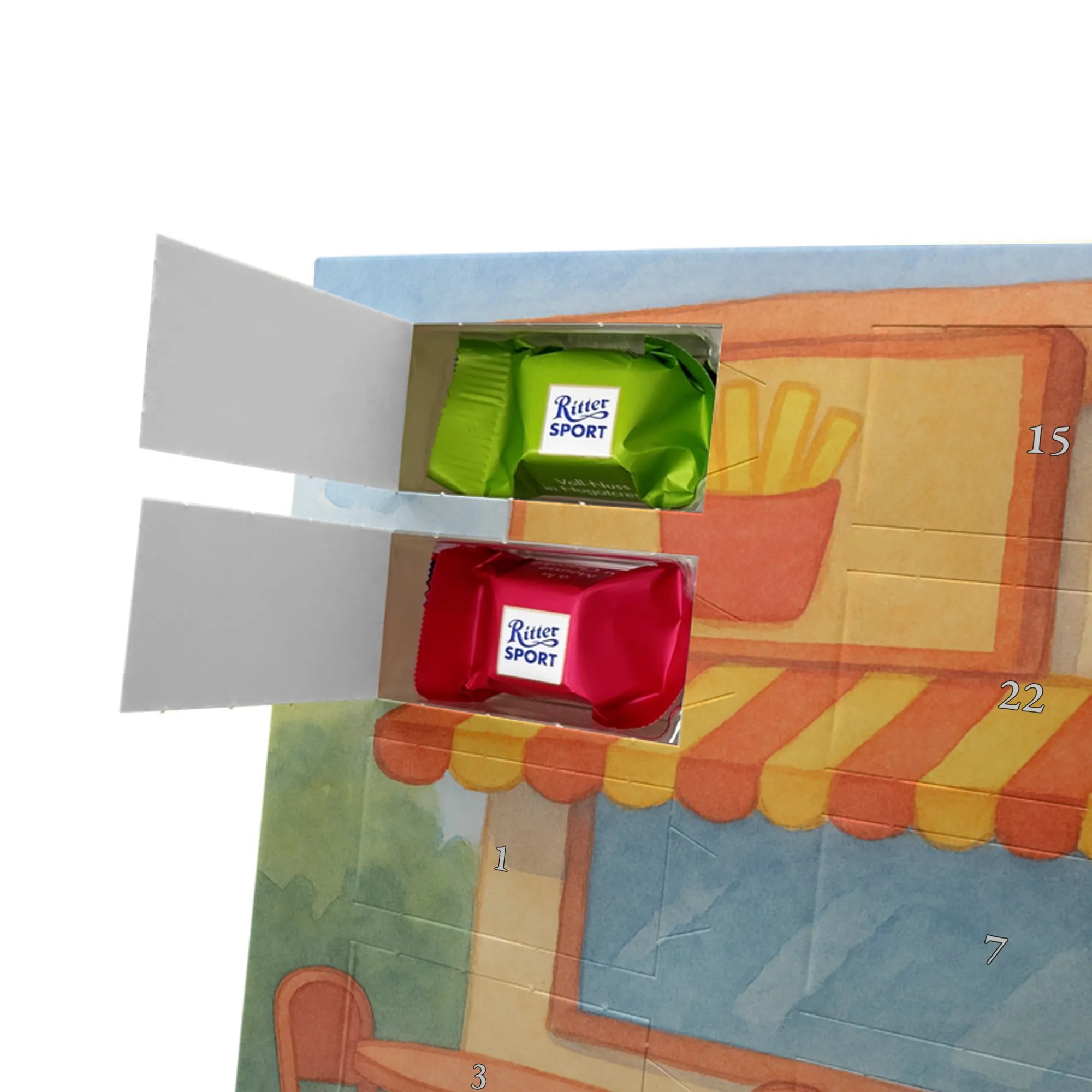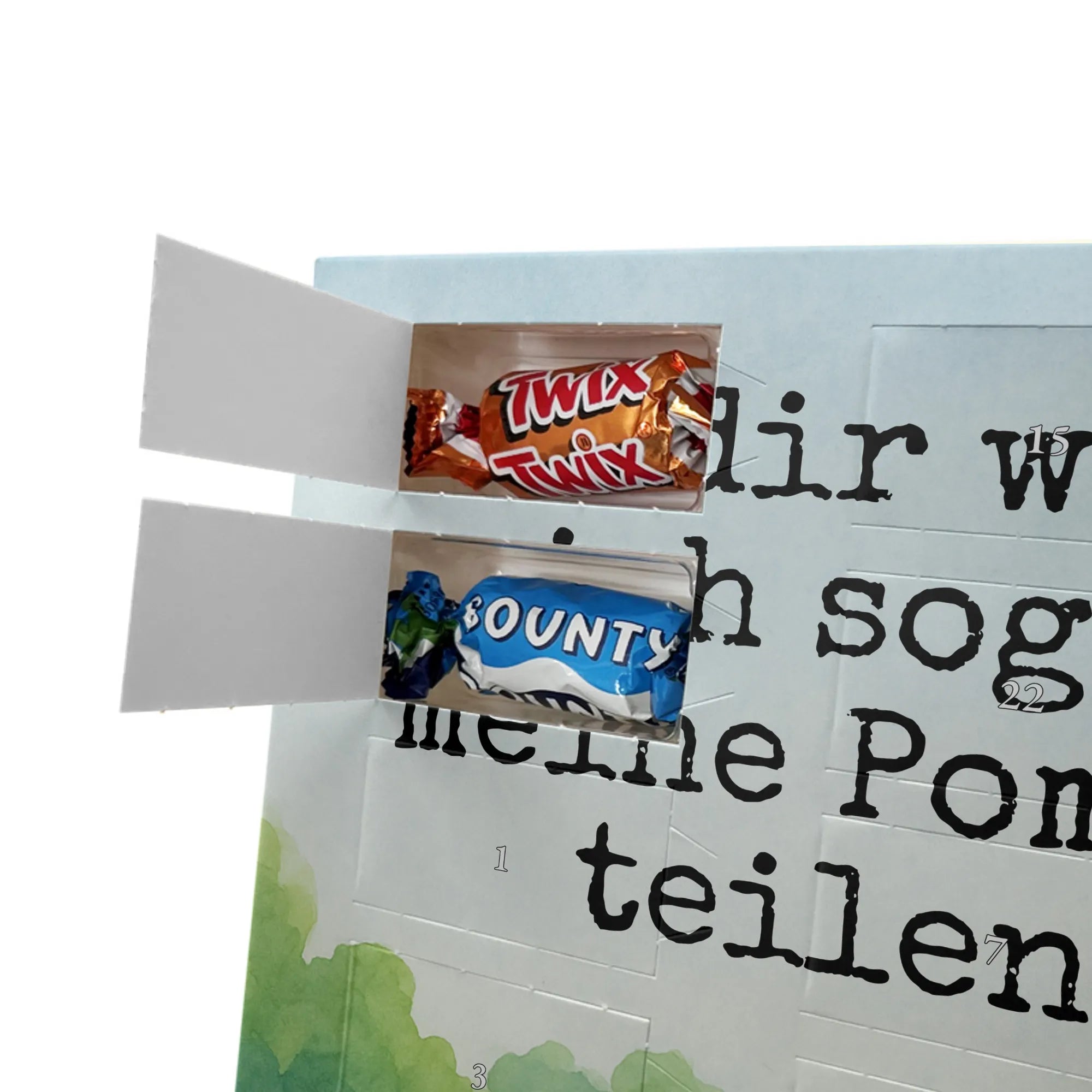 Besonderheiten: Gefüllt mit Lindt Hello Mini Sticks, 24 Stück, vier Sorten. Nicht personalisierbar. Bedruckte Seitenflächen. Kann aufgehängt oder aufgestellt werden.