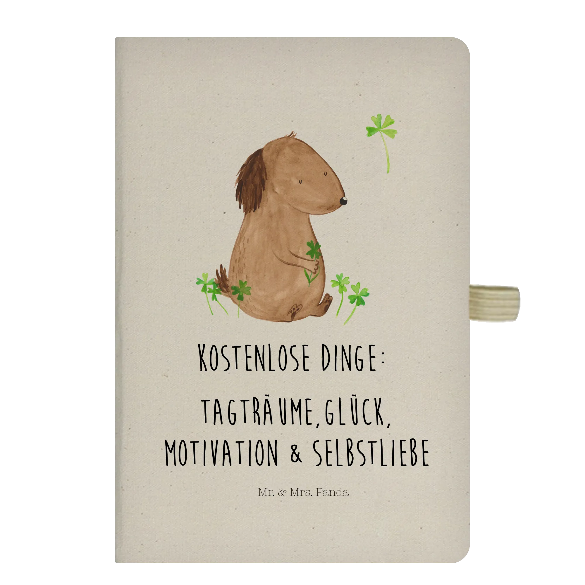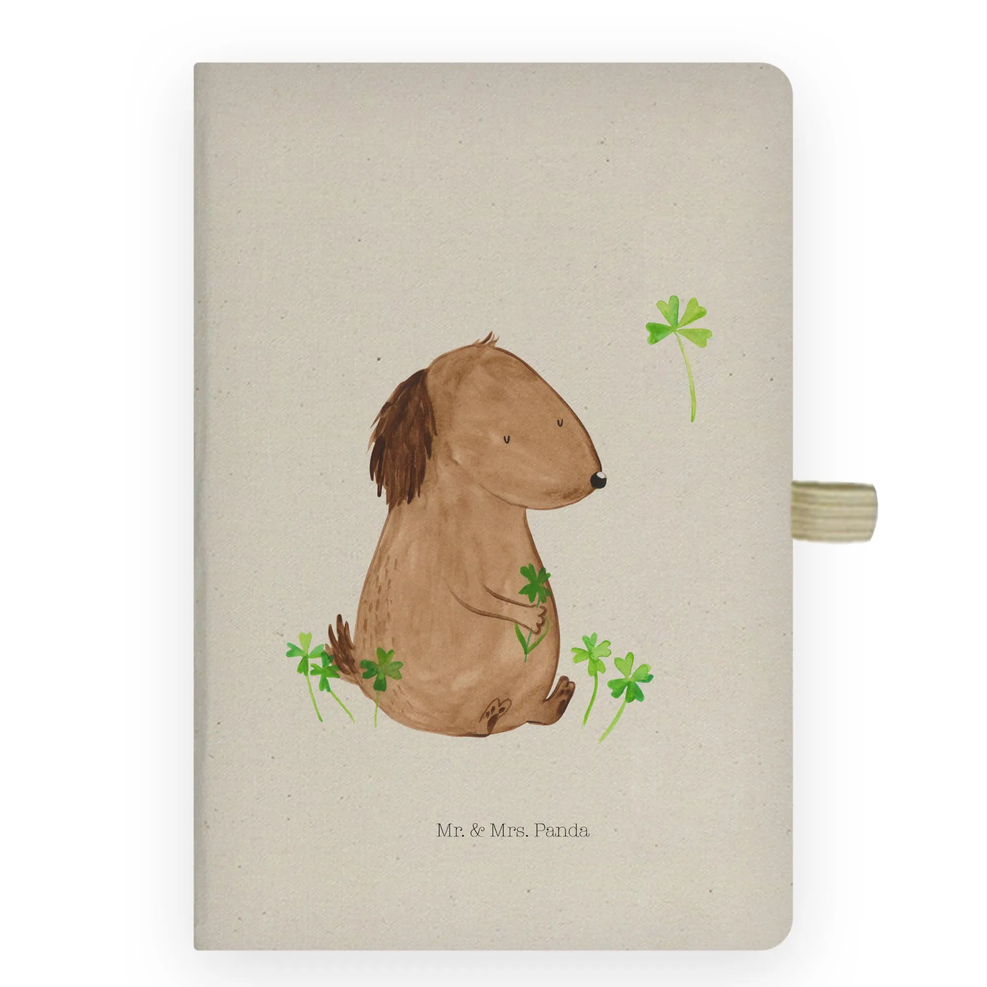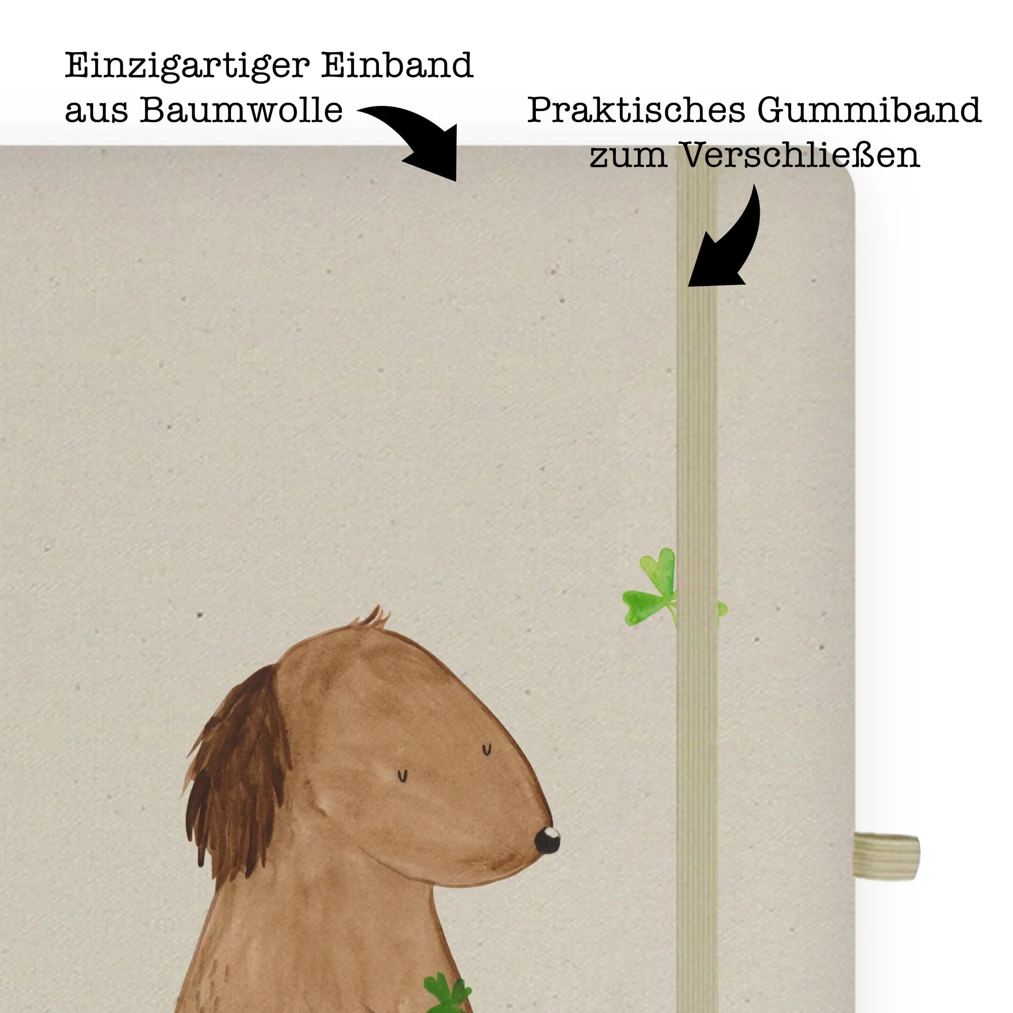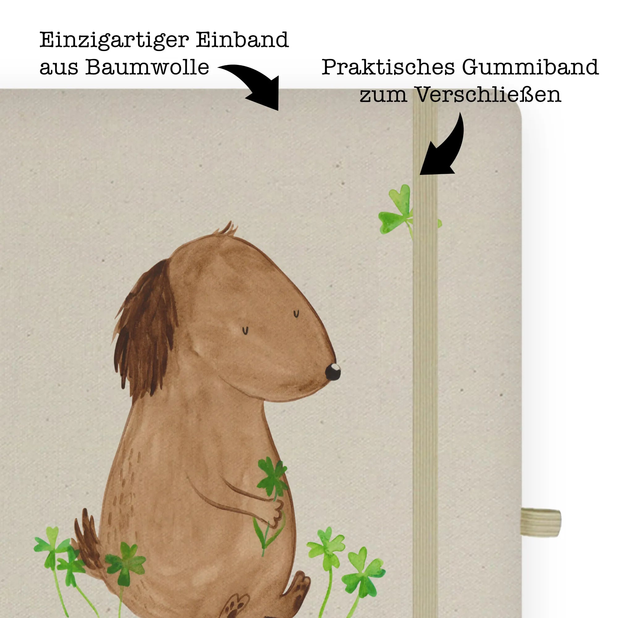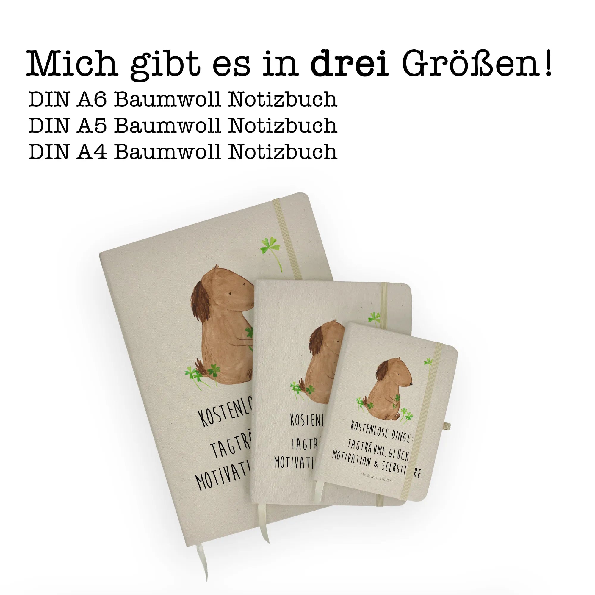 Ein wunderschönes und edles Baumwollnotizbuch von Mr. & Mrs. Panda: Das Motiv „Hund Kleeblatt" aus unserer Hunde Kollektion bringt ein Lächeln in deinen Alltag. Ein süßer Hund mit einem Kleeblatt in der Pfote steht für Glück, Tagträume und Neuanfänge – ideal als Geschenk für Hundebesitzer oder als persönliches Journal.