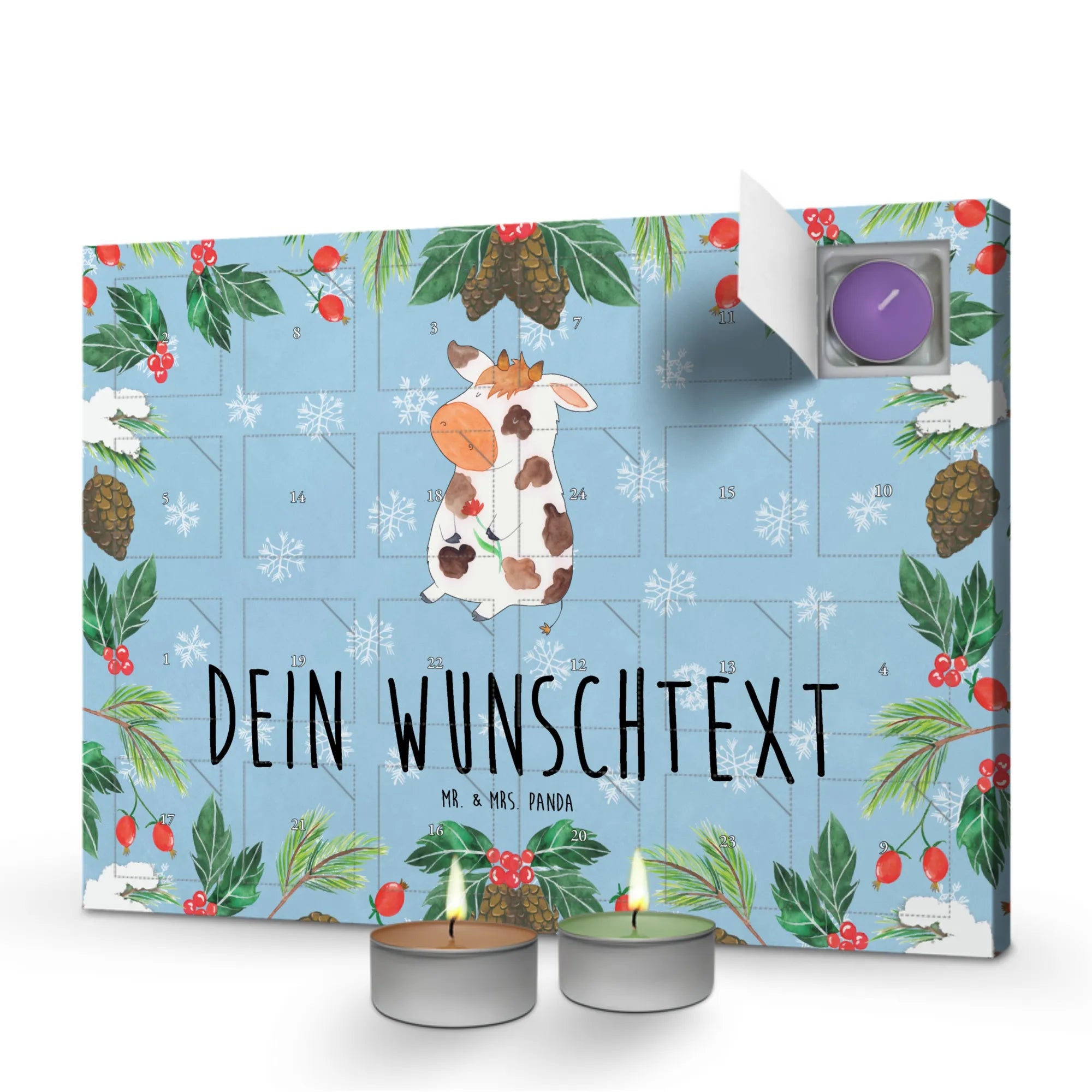 Discover the magic of the pre-Christmas season with our 'Personalized Scented Candle Advent Calendar' from Mr. & Mrs. Panda. Enchantingly adorned with beautiful quotes and motifs, this unique Advent calendar can be personalized with a message or name of your choice. Be captivated by Mrs. Panda's charming drawings on the front and a new festive scent behind every door, including vanilla, lavender, and apple-cinnamon. A sturdy box that can be hung up or displayed completes the experience.