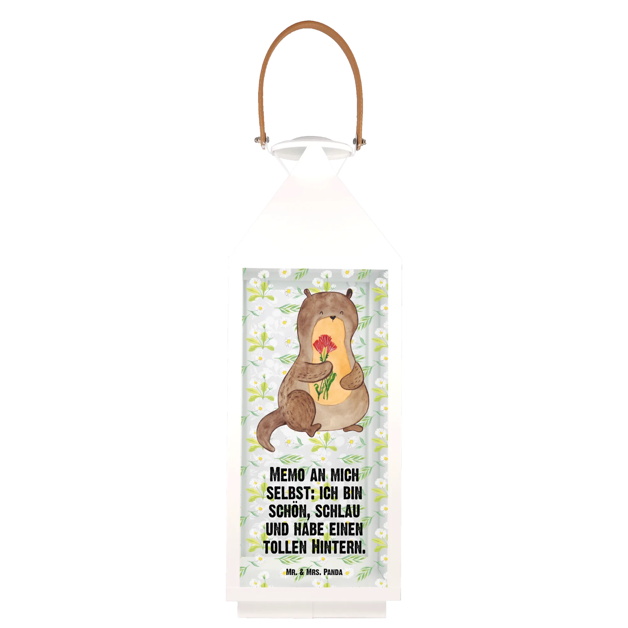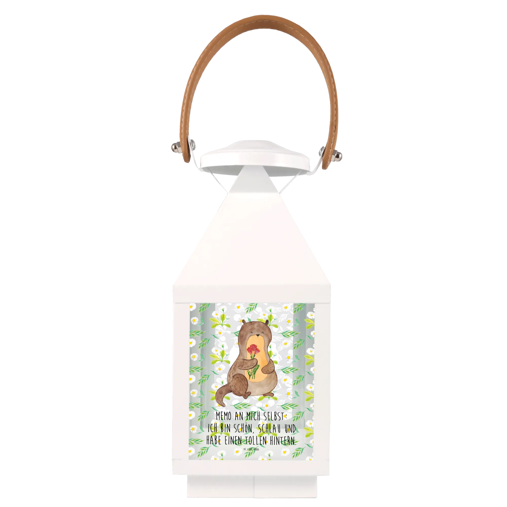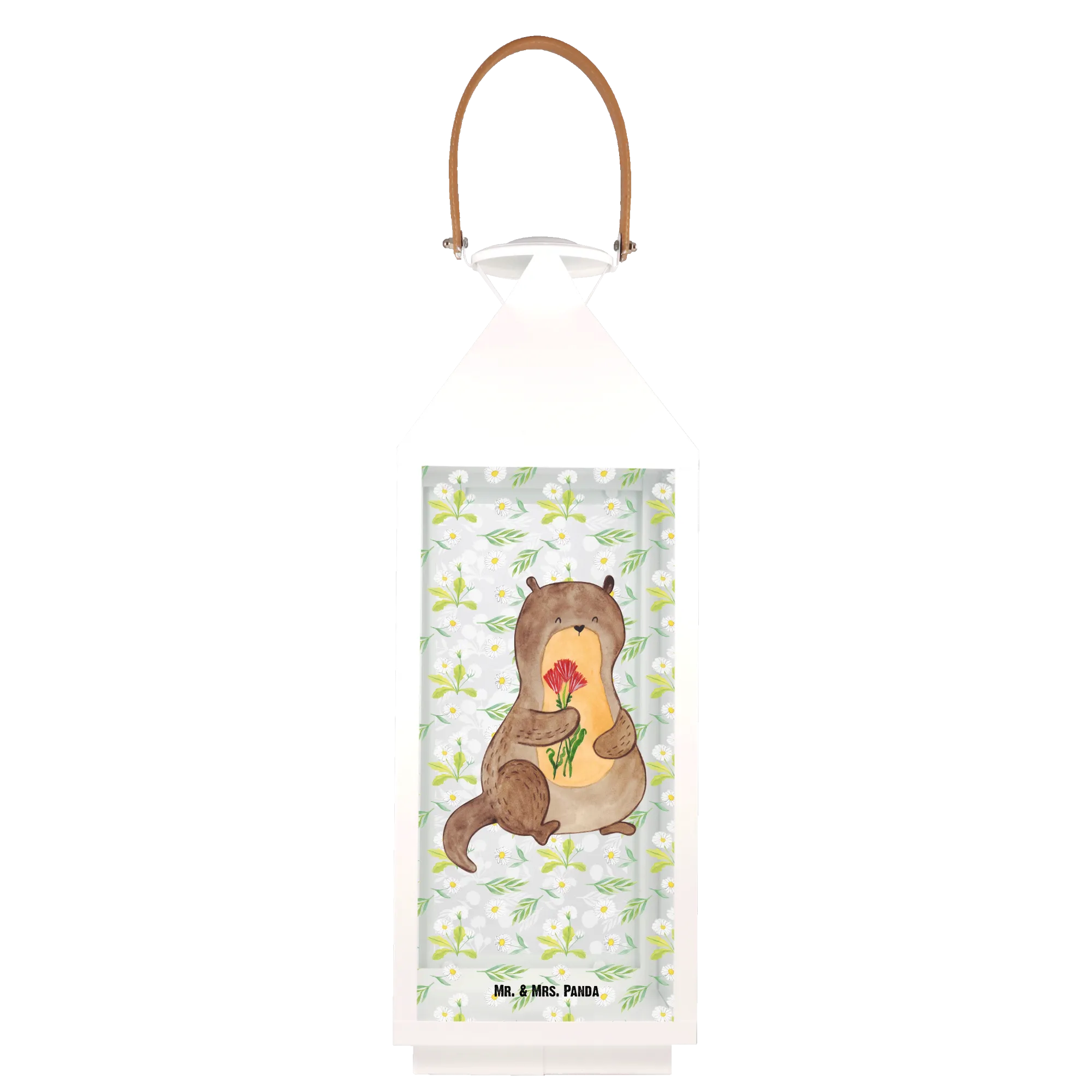Introducing the delightful Decorative Lantern featuring an enchanting otter with flowers, part of the exclusive Otter - Collection from Mr. & Mrs. Panda! This charming garden lantern is perfect for bringing a unique touch of whimsy to your outdoor or indoor spaces. Hand-drawn with love, our otter design is not just a gift but a heartfelt statement for any animal lover in your life.