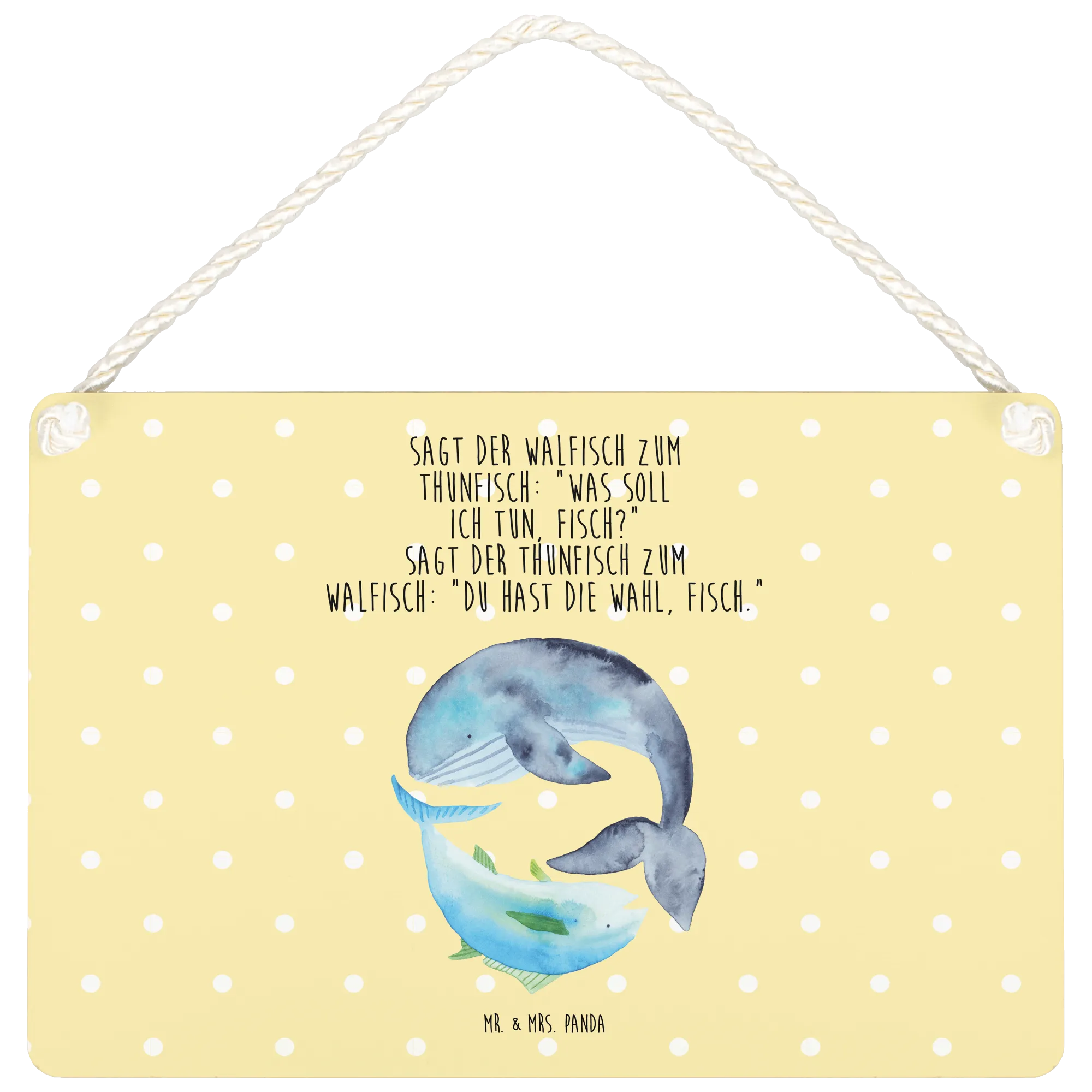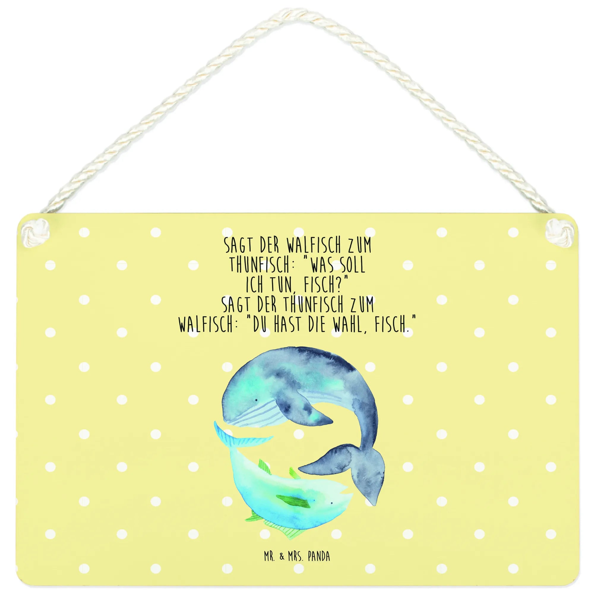 This beautiful wooden sign features a whimsical design of a whale and a tuna, perfectly capturing the spirit of joy and laughter. Every glance at this cute sign will surely brighten your day and remind you of life's playful moments. The playful slogan adds an extra touch of humor: "Sagt der Walfisch zum Thunfisch: 'Was soll ich tun, Fisch?' Sagt der Thunfisch zum Walfisch: 'Du hast die Wahl, Fisch.'" This quirky wordplay adds character and is bound to tickle the funny bones of animal lovers and anyone who appreciates a good pun.