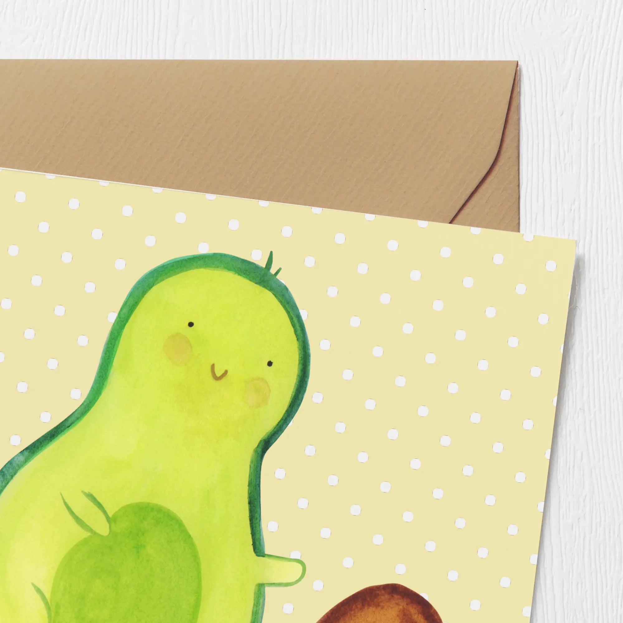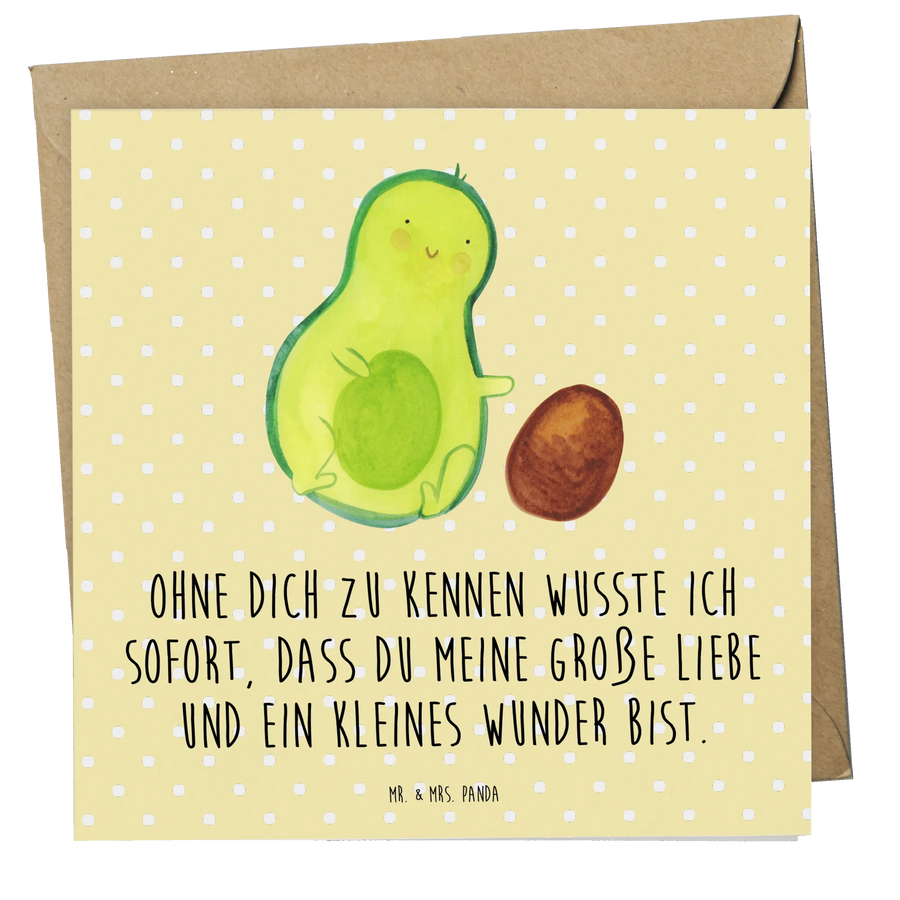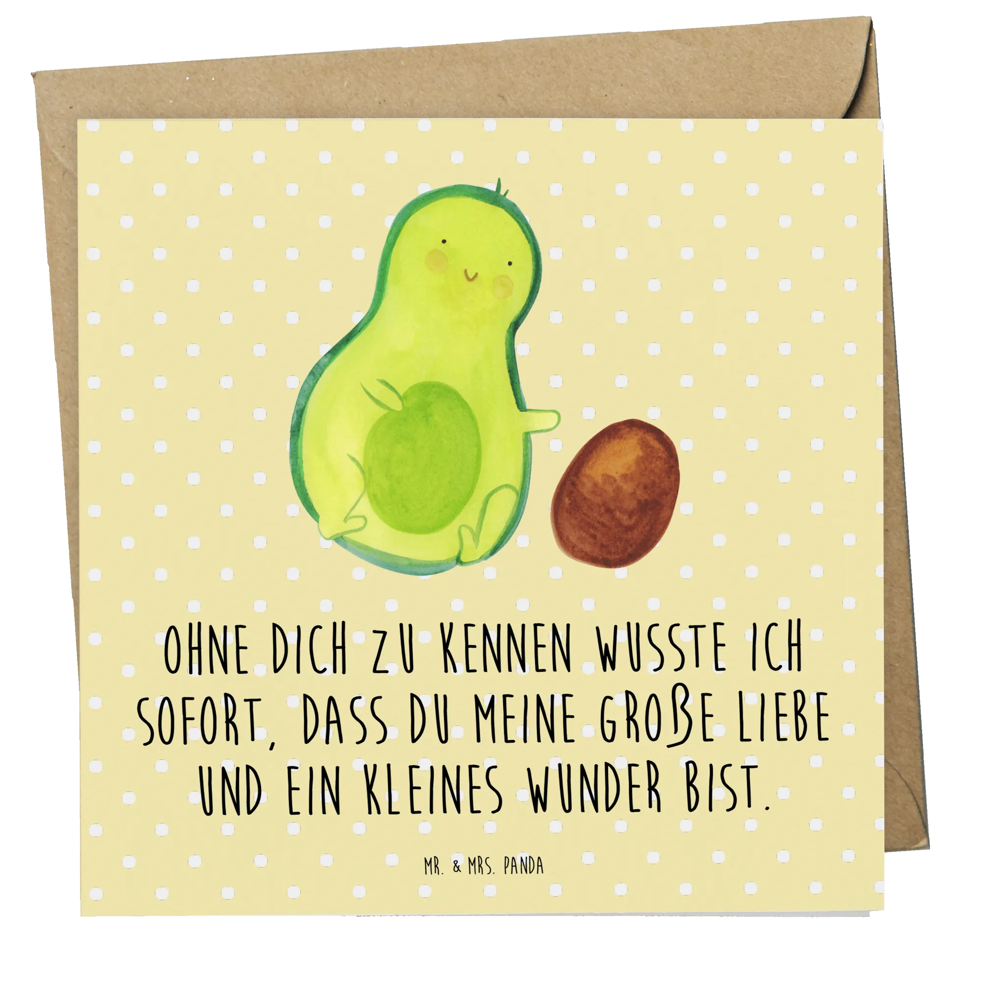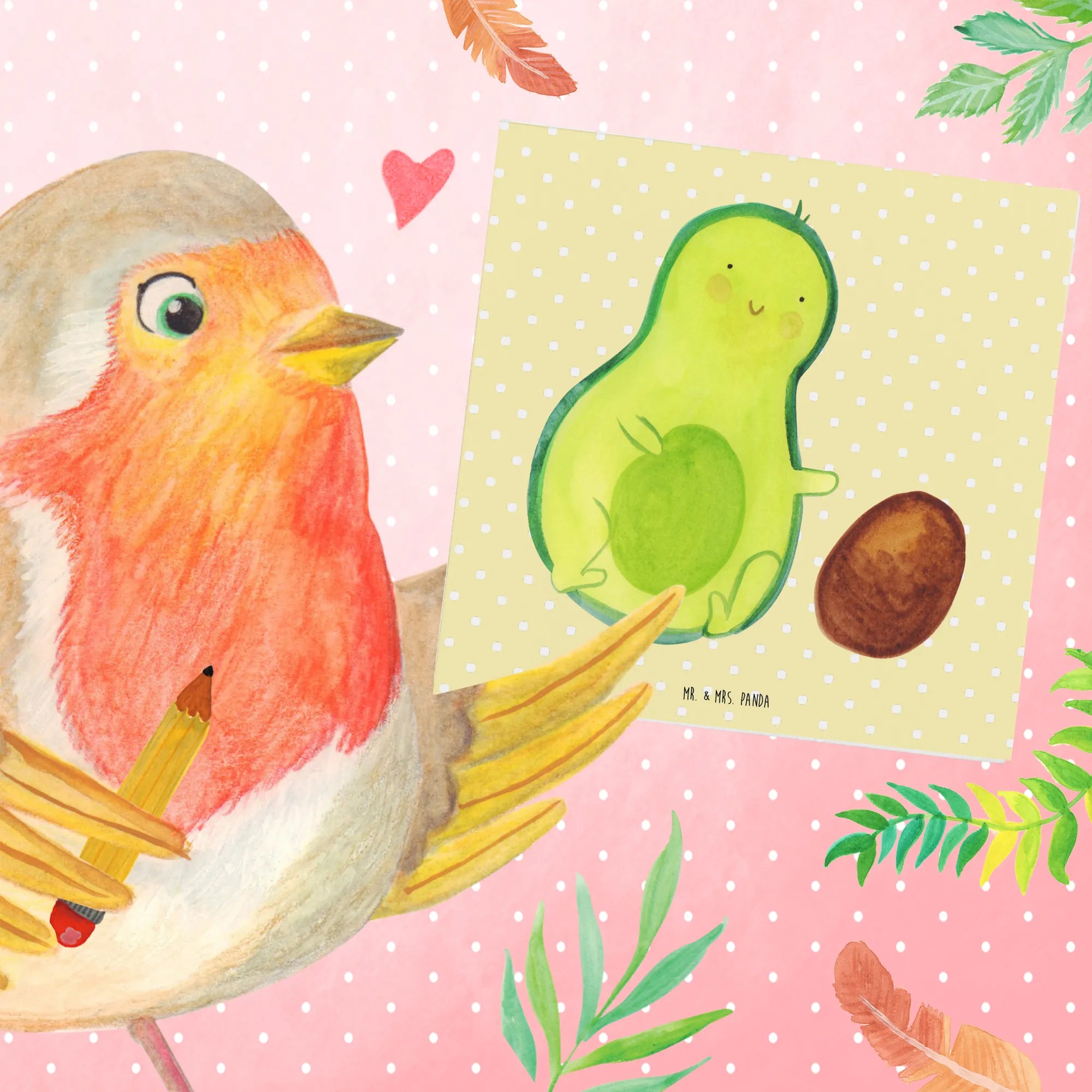 Introducing the delightful Deluxe Card with the charming motif of an avocado rolling its pit! This stunning, high-quality square card from Mr. & Mrs. Panda is the perfect expression of love and joy for various occasions. Hand-drawn with love and care, the cute avocado illustrates not only a healthy, delicious fruit but also conveys the essence of big love and the wonders of life. Whether you want to celebrate a birthday, send warm wishes for a baby birth, or simply say 'I care,' this card is an ideal choice.