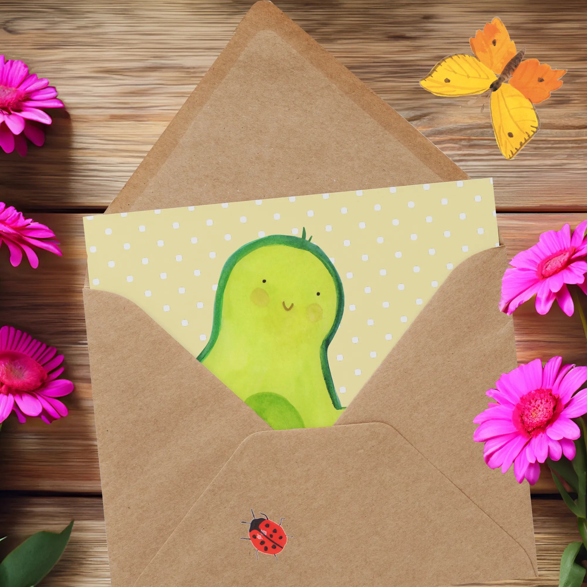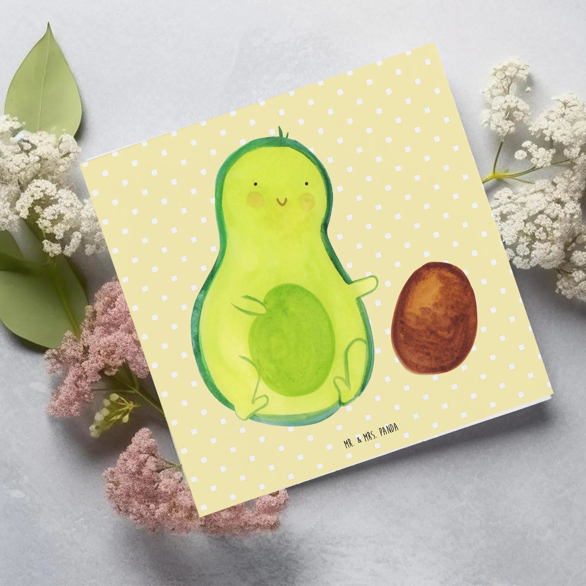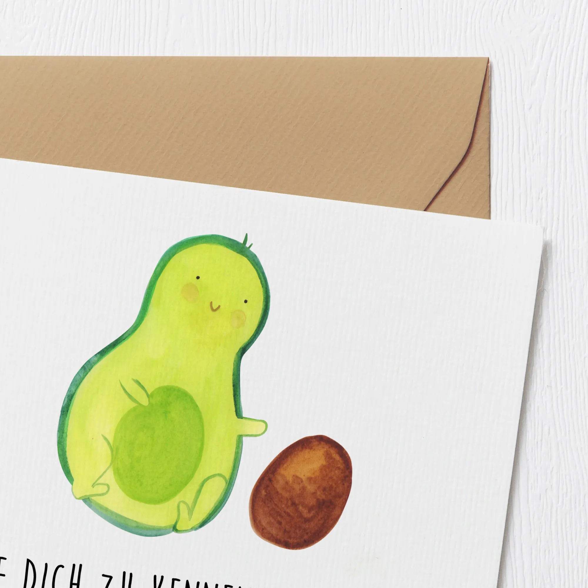 Introducing the delightful Deluxe Card with the charming motif of an avocado rolling its pit! This stunning, high-quality square card from Mr. & Mrs. Panda is the perfect expression of love and joy for various occasions. Hand-drawn with love and care, the cute avocado illustrates not only a healthy, delicious fruit but also conveys the essence of big love and the wonders of life. Whether you want to celebrate a birthday, send warm wishes for a baby birth, or simply say 'I care,' this card is an ideal choice.