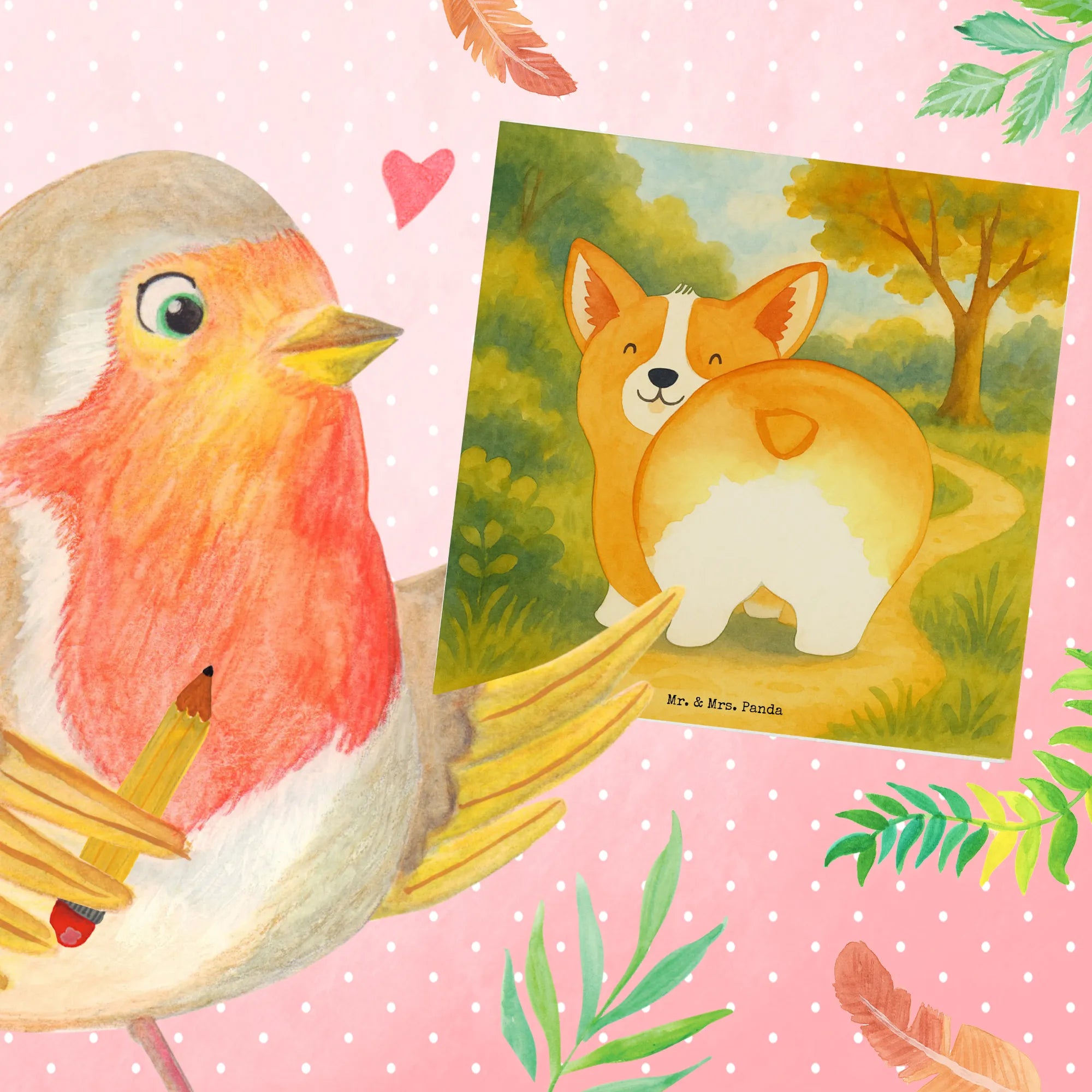 Unsere quadratische Deluxe Karte aus der Hunde Kollektion von Mr. & Mrs. Panda zeigt einen frechen Corgi, der seinen Po stolz in die Kamera hält. Das liebevoll von Mrs. Panda gezeichnete Aquarellmotiv zaubert jedem ein Lächeln ins Gesicht und macht die Karte zur perfekten Wahl für alle, die Hunde, Humor und schöne Papeterie lieben. 😊