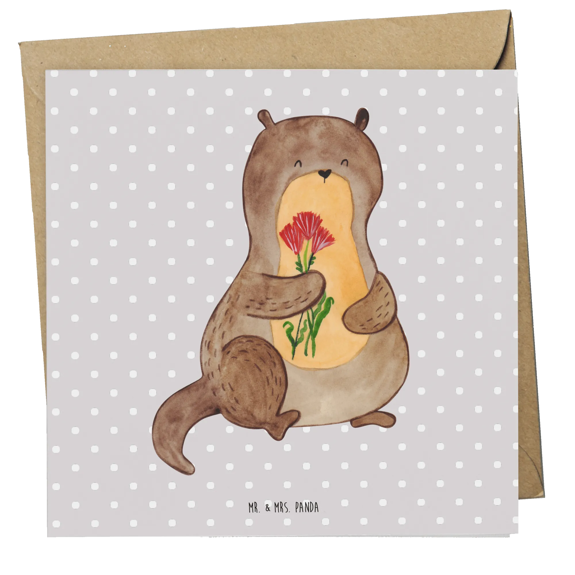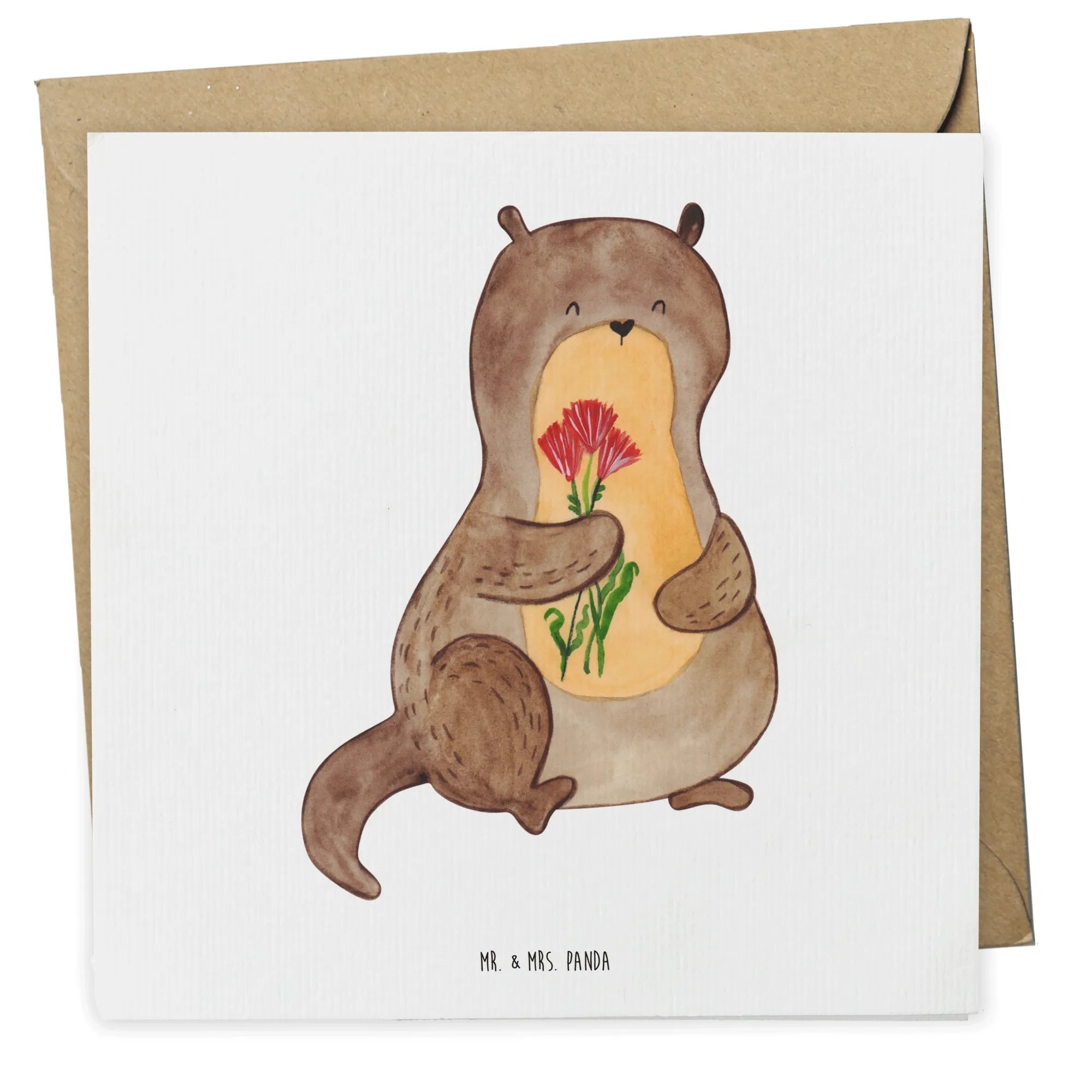Looking for a delightful way to share your heartfelt sentiments? The Deluxe Card featuring an adorable otter holding a bouquet of flowers from the Mr. & Mrs. Panda Otter Collection is your perfect solution!