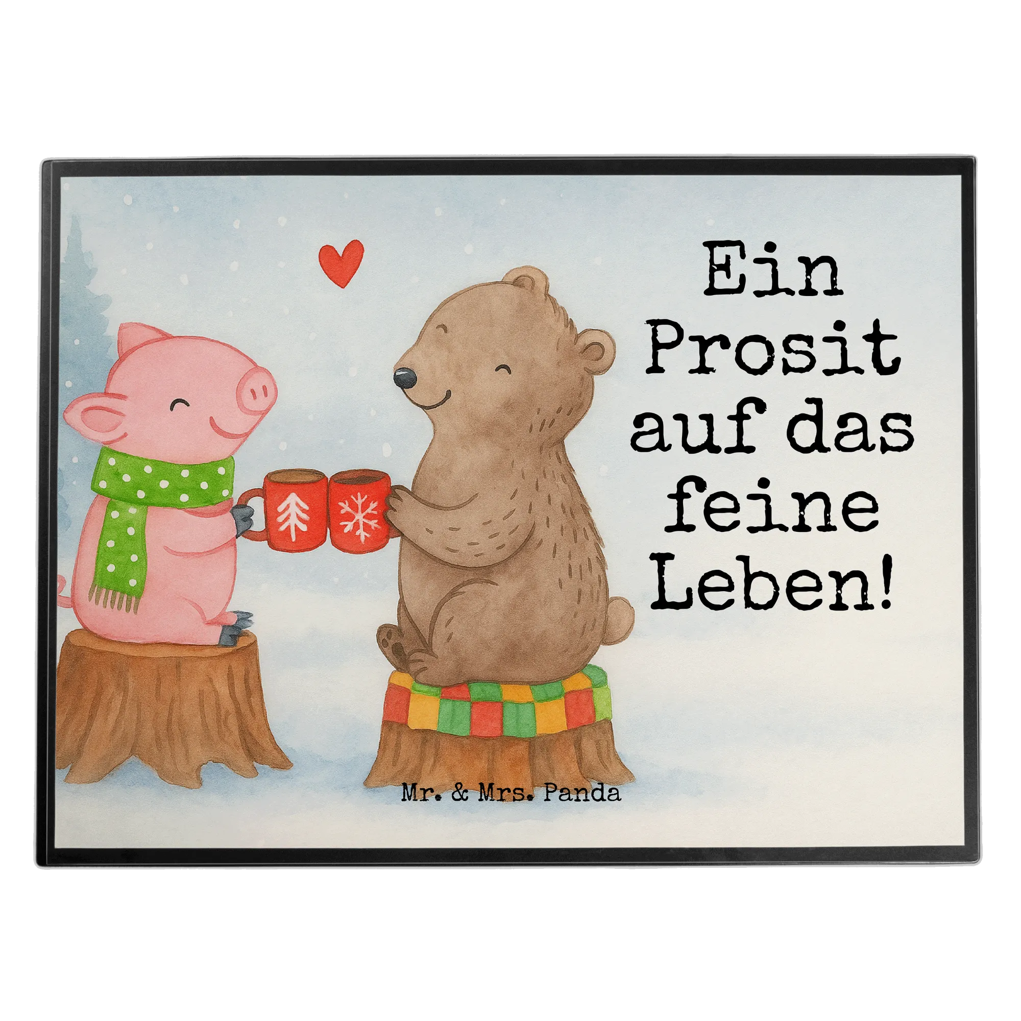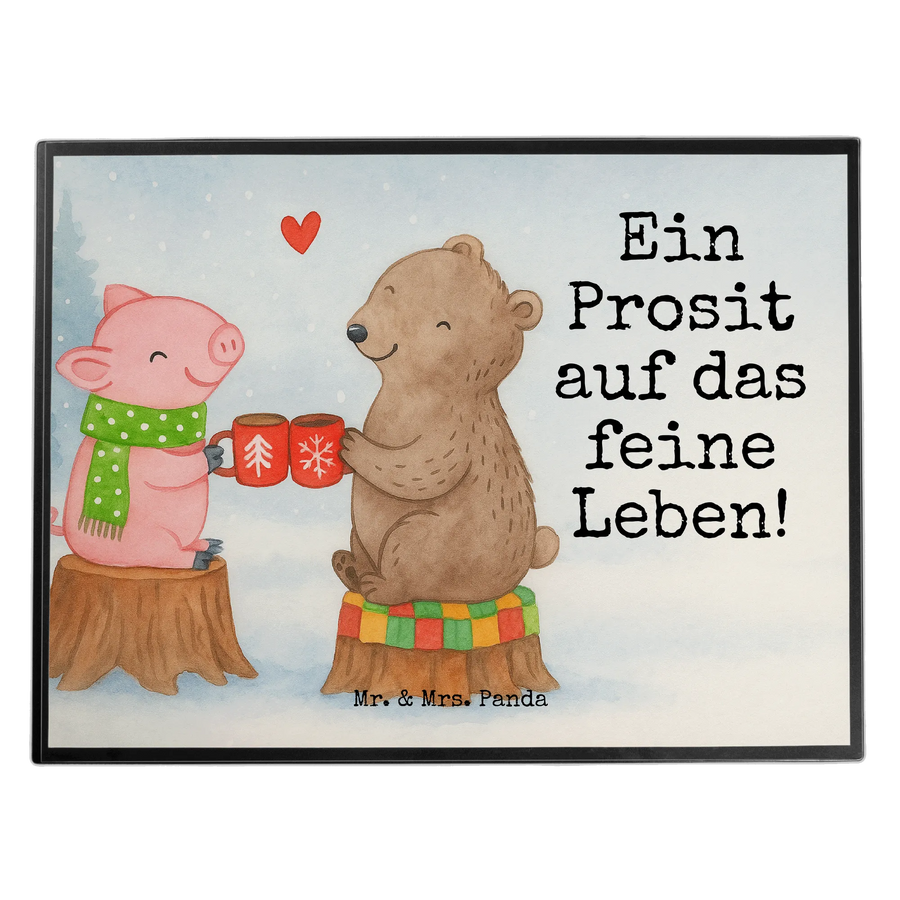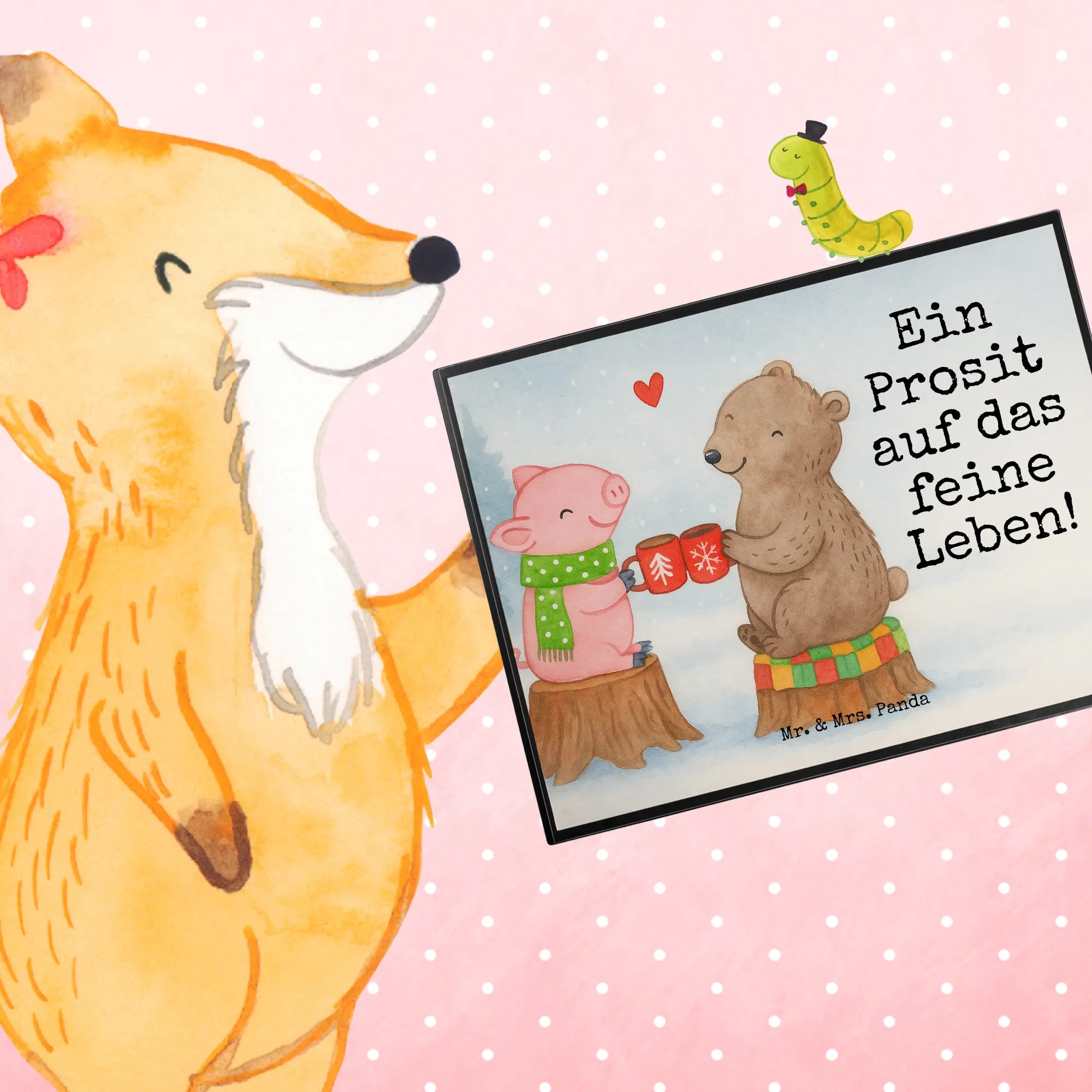Imagine a charming scene where friendship sparkles in the air—our adorable pig is cozily wrapped in a scarf, clinking cups with a joyful bear! Seated on a sturdy tree stump, their cheerful gathering radiates warmth and laughter. The little heart between them is a gentle reminder that love is what truly makes life shine bright. 'Ein Prosit auf das feine Leben!' captures this spirit perfectly, encouraging us to embrace the festive moments, especially during the Christmas season. Each sip of cheer not only celebrates the good life but also symbolizes the beautiful bonds we share, making our hearts glow with joy. Whether it’s a casual meet-up or a holiday feast, let’s always find an excuse to toast to happiness!