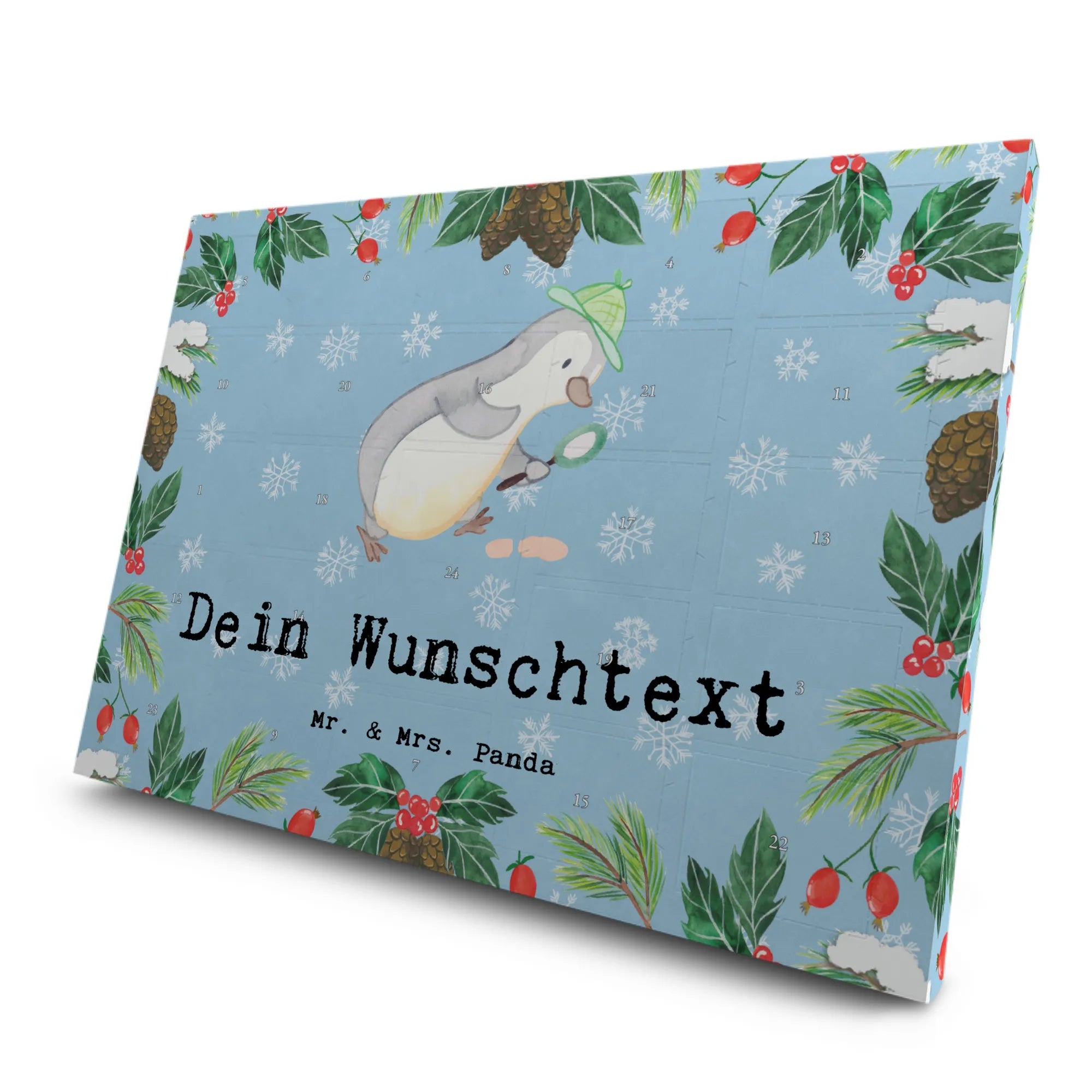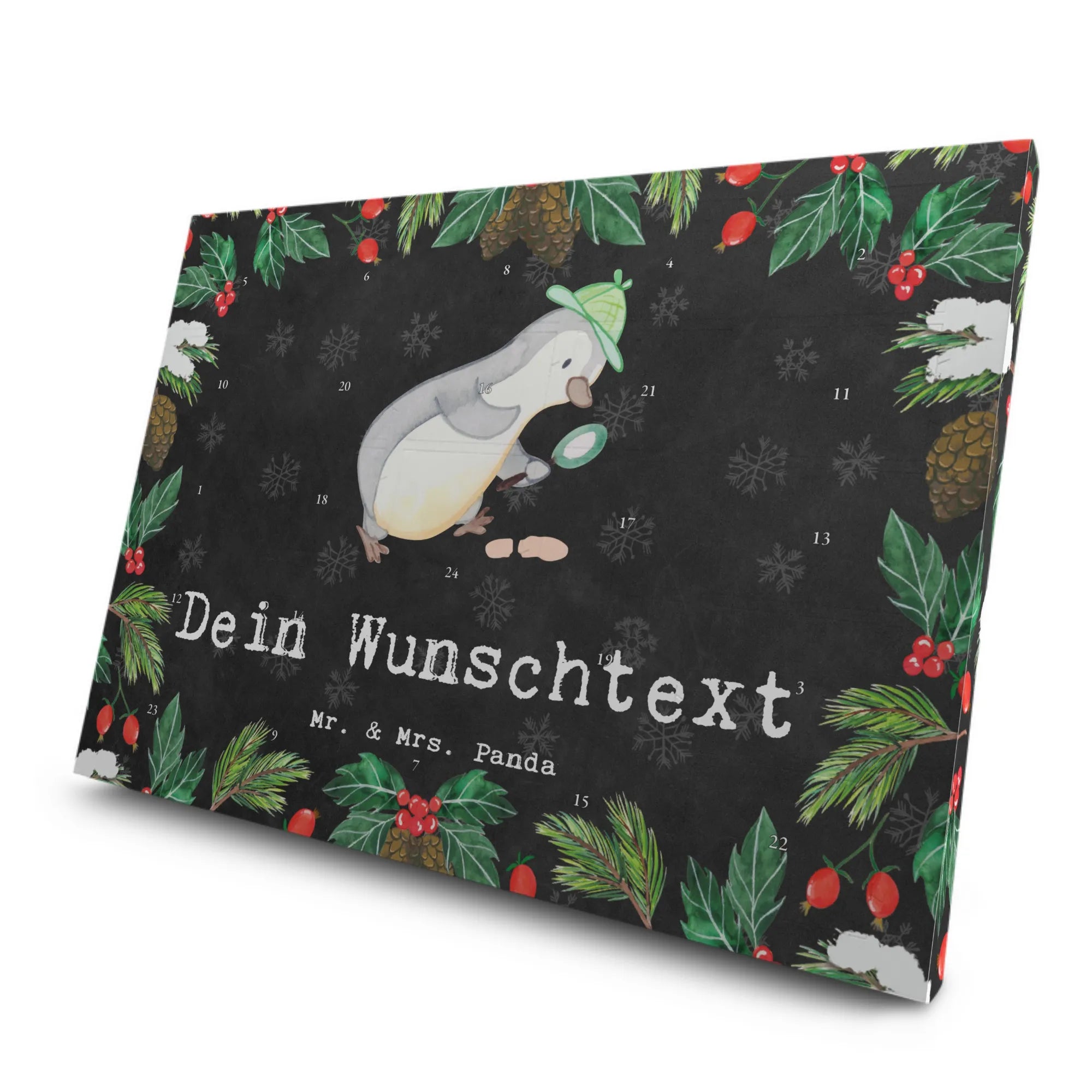 Das bezaubernde Motiv mit dem kleinen Detektiv-Pinguin, der mit einer Lupe Fußspuren folgt, erinnert daran, wie spannend der Alltag eines Detektivs sein kann. Er wird durch den Slogan "Detektiv aus Leidenschaft" begleitet, was ihn zu einem perfekten Geschenk für Berufstätige in der Detektivbranche macht. Wenn du also jemanden kennst, der als Ermittler oder in einer Privatdetektei arbeitet, ist dies ein ideales Adventsgeschenk zum Berufsjubiläum, zum Abschied oder einfach nur, um "Danke" zu sagen.