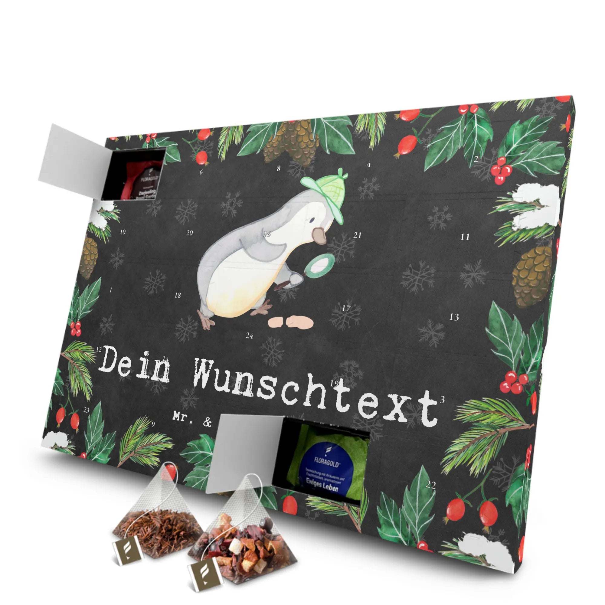 Der personalisierte Tee Adventskalender "Detektiv aus Leidenschaft" von Mr. & Mrs. Panda ist das perfekte Geschenk für alle Detektiv-Fans! Dieser liebevoll gestaltete Adventskalender ist nicht nur ein Blickfang in jeder Wohnung, sondern auch eine wunderbare Möglichkeit, die Vorweihnachtszeit zu verschönern. Egal, ob du ihn für einen Kollegen, einen Freund oder einen Familienmitglied kaufst, dieser Kalender zaubert jedem ein Lächeln ins Gesicht. Mit 24 einzeln verpackten Teesorten, die in hochwertigen Pyramidenbeuteln verpackt sind, wird jeder Tag im Advent zum kleinen Genuss. Der Kalender enthält eine bunte Auswahl an Früchtetees, Schwarztees und Kräutertees – bestens geeignet für alle Geschmäcker!