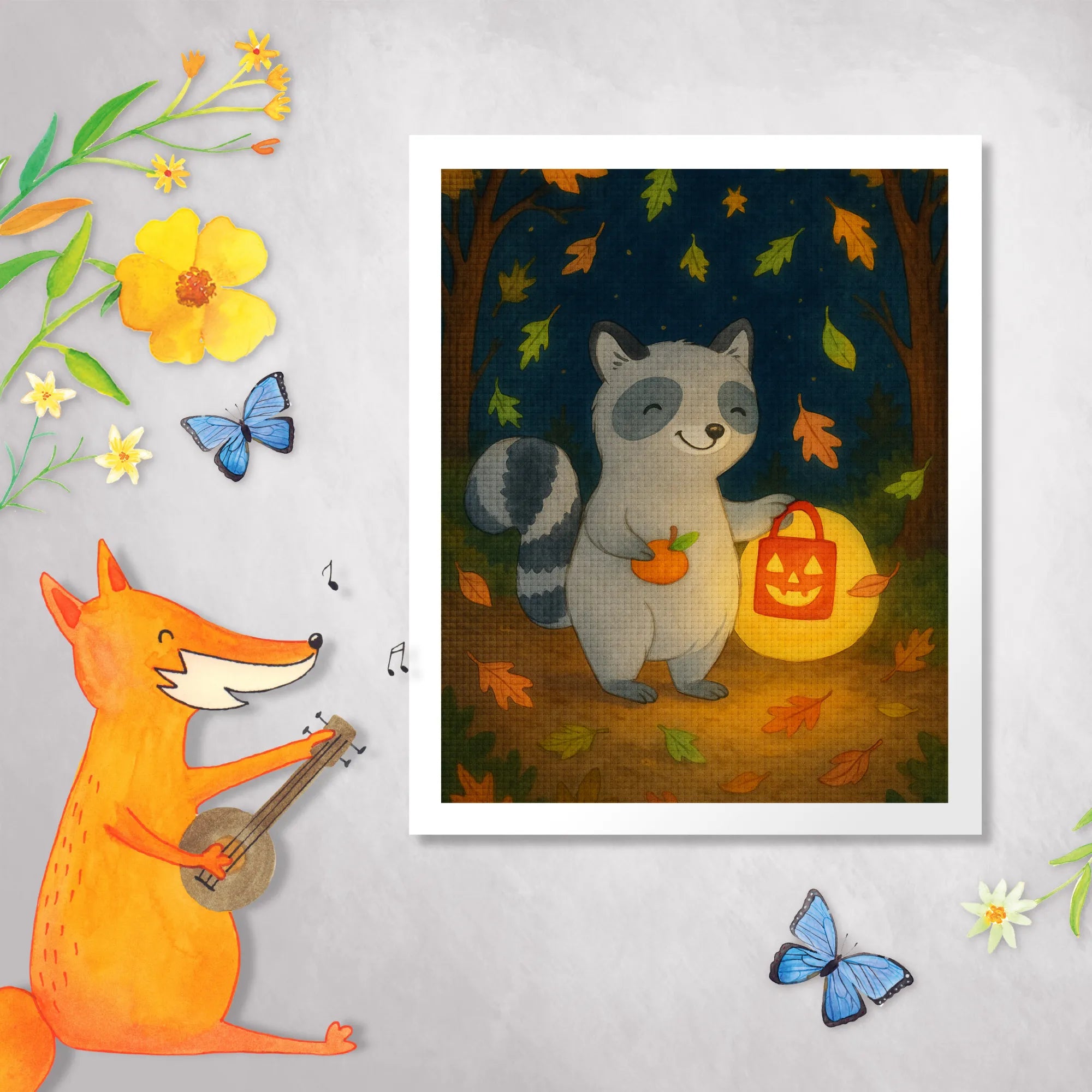 Welcome the season with our delightful raccoon, holding a glowing lantern that captures the heart of Halloween! Surrounded by autumn’s colorful leaves, this little rascal brings a splash of joy to your Trick or Treat preparations. He invites laughter and sweet memories as he lights up the cool fall nights. Imagine him as the centerpiece of your Halloween decor, casting a warm glow that draws everyone into a world of playful fun and enchanting surprises. This charming raccoon is more than just a motif; he represents the joy of gathering together with loved ones, creating moments that stay with us long after the season ends. Let him remind you that the best things in life often come with a little sparkle and a lot of heart.