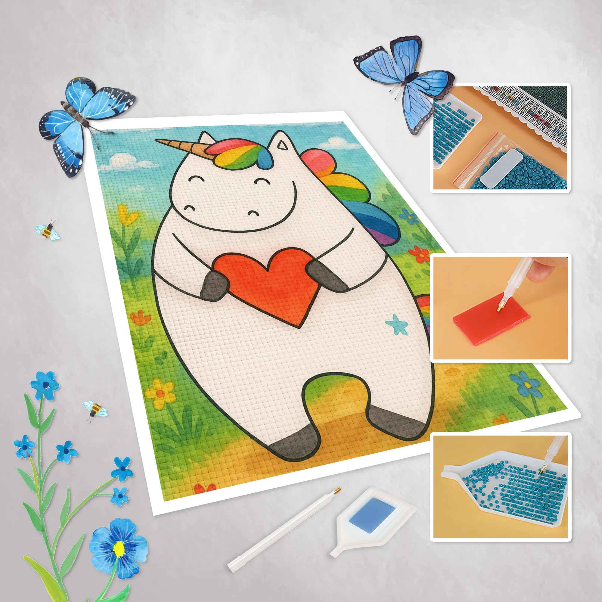- Complete Set: Canvas (self-adhesive), colored resin diamonds (square), pen, wax, sorting tray & instructions