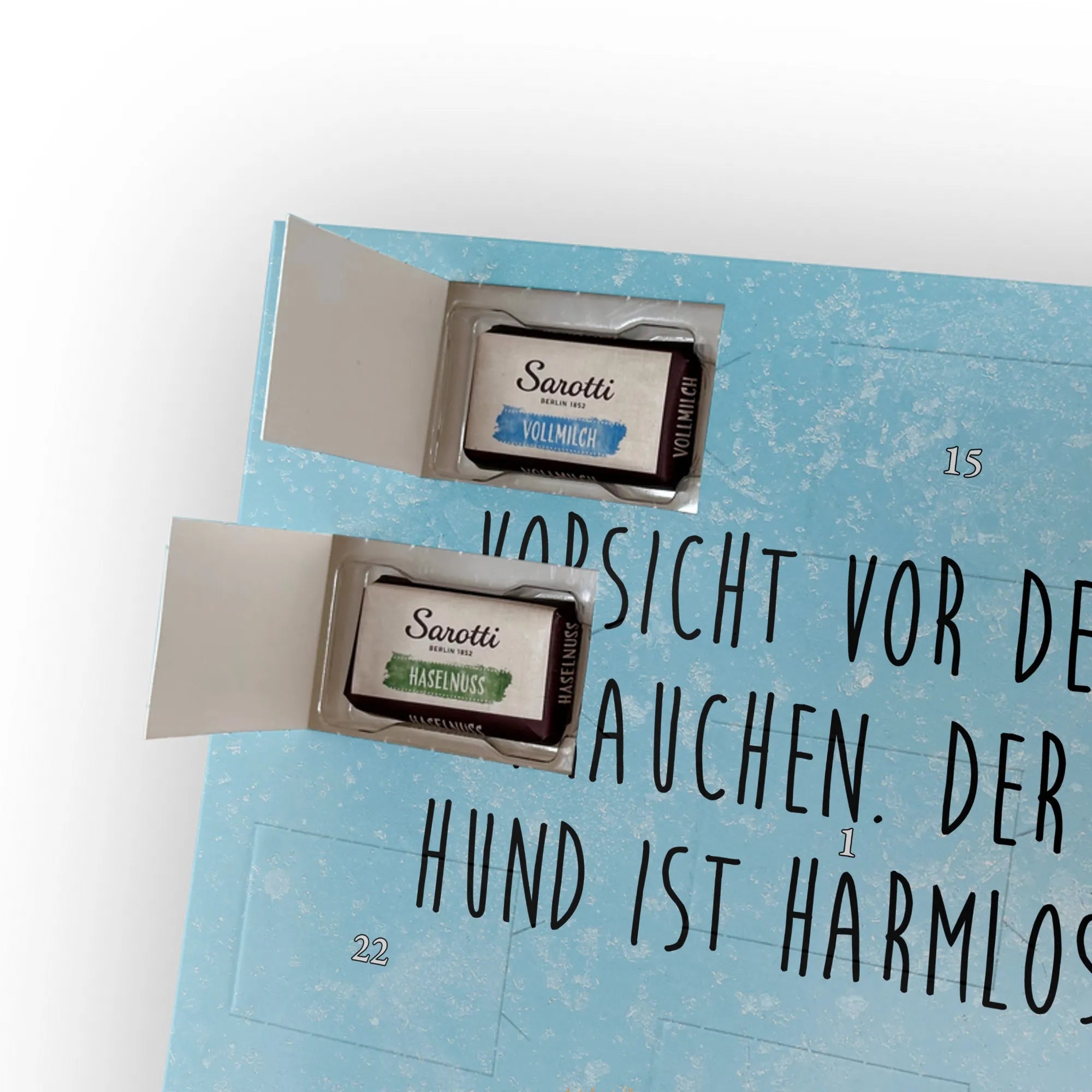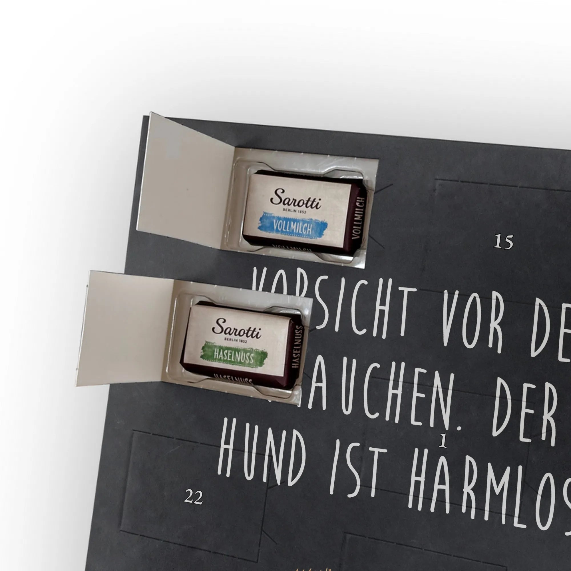 🐼 LECKERE FÜLLUNG: 24 Täfelchen, 107 g Markenschokolade (Sarotti® & Confiserie Heidel®) in vier Sorten.