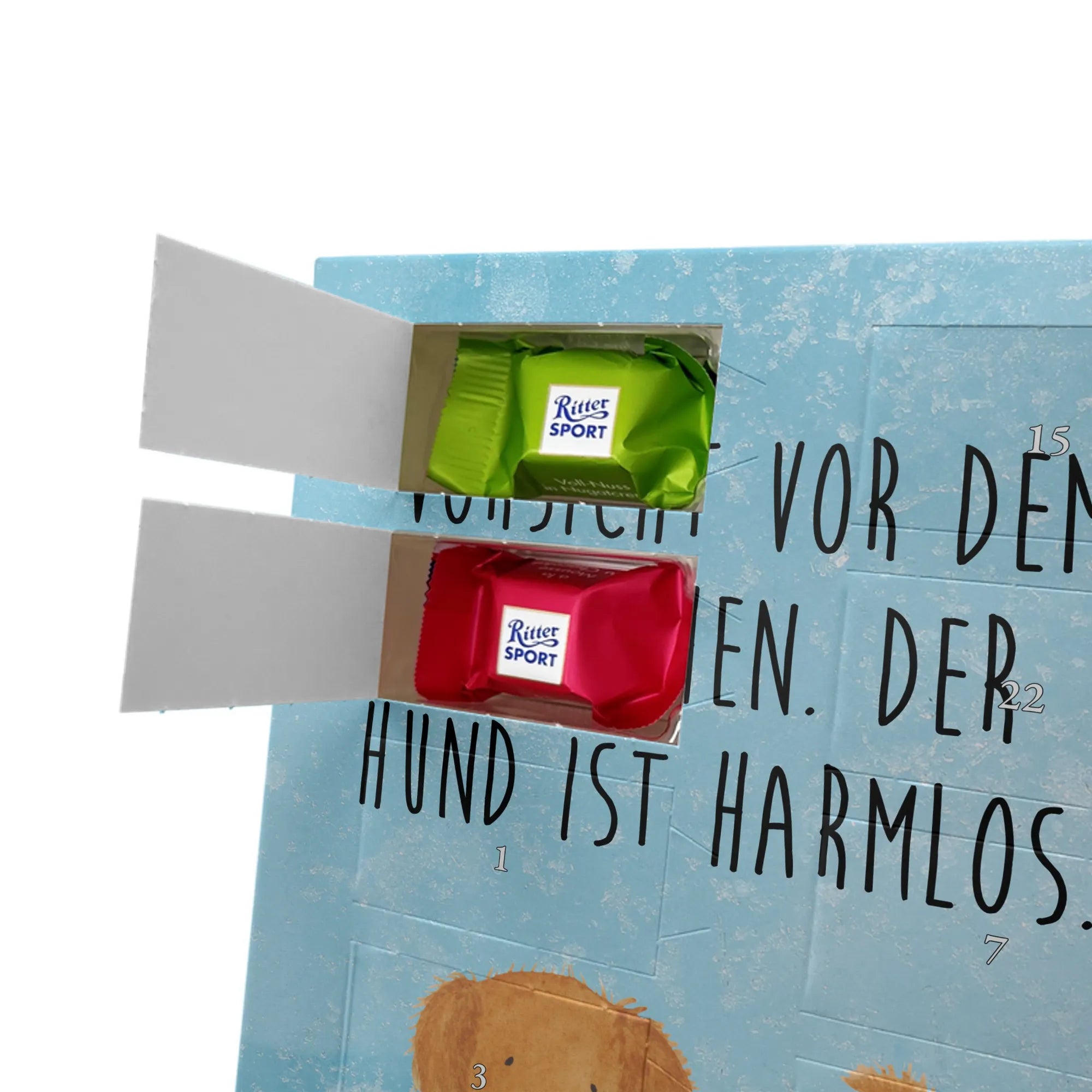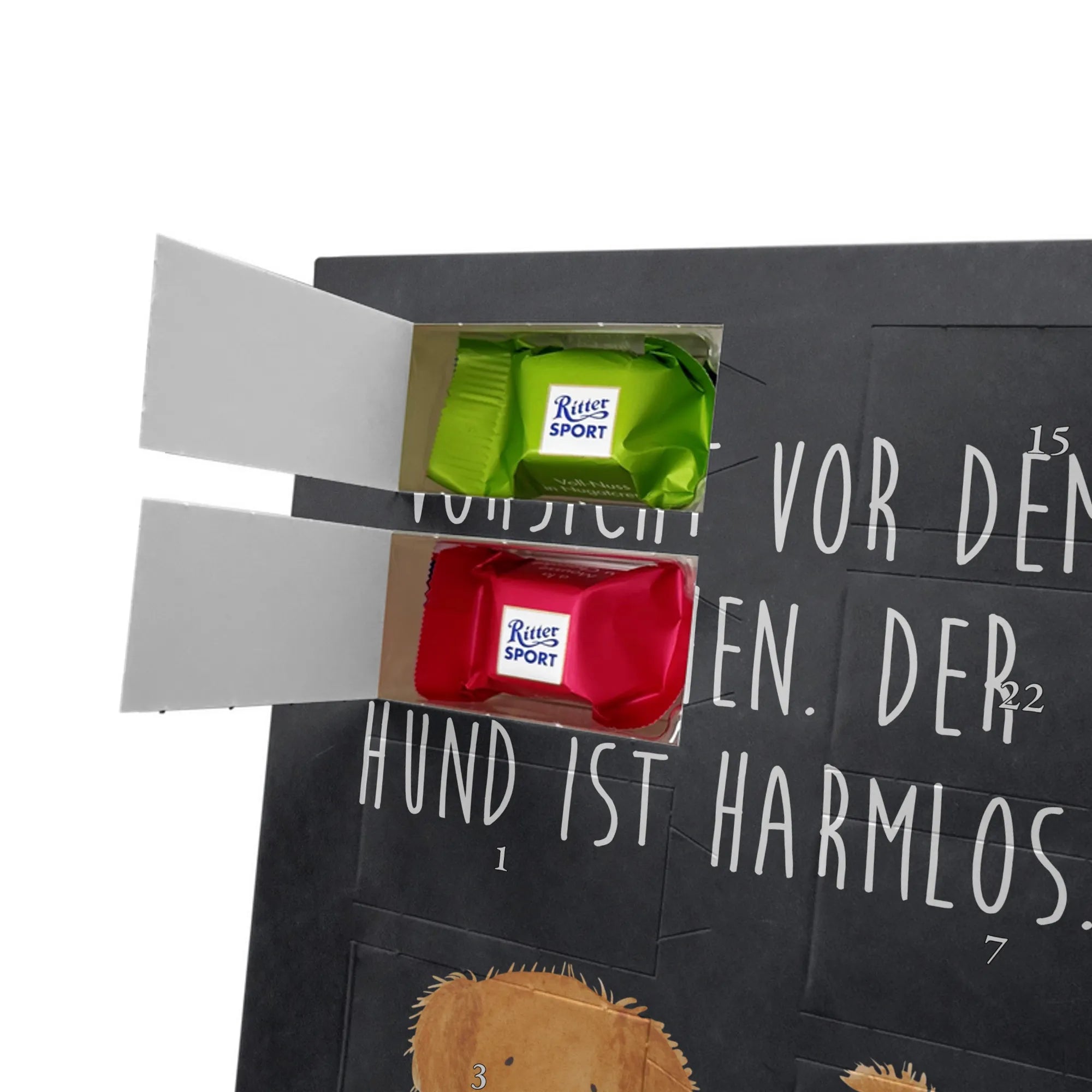 Wunderschöner Personalisierter Schoko Foto Adventskalender von Mr. & Mrs. Panda – das perfekte Geschenk für deine Liebsten! Dieser Adventskalender ist liebevoll gestaltet, bedruckt mit wunderschönen Motiven & Sprüchen von Mr. & Mrs. Panda und personalisierbar mit einem Foto deiner Wahl. Achte bitte auf hohe Auflösung: Lade ein Foto in guter Qualität und ausreichender Auflösung hoch, damit das Druckergebnis klar und brillant wird. Achte auf den richtigen Bildausschnitt, damit keine wichtigen Details abgeschnitten werden. Wir empfehlen, den Kalender-Rahmen vorher anzusehen, um zu wissen, wie dein Foto platziert wird. Lade nur Bilder hoch, bei denen du die Bildrechte besitzt oder die Erlaubnis hast. Die Fotos werden weder aufbereitet noch zugeschnitten. Rücknahme bei personalisierten Foto Artikeln ist ausgeschlossen. Der Kalender besticht durch brillante Druckqualität mit seidenmatter Oberflächenveredelung und bedruckte Seitenflächen. Maße: 325 mm x 225 mm x 27 mm. Besonderheit: Kann aufgehängt oder aufgestellt werden – ganz wie du möchtest. Gefüllt ist der Kalender mit Ritter Sport Schokowürfeln in leckeren Geschmacksrichtungen: Mousse au Chocolat, Schoko Crisp, Voll-Nuss in Nougatcreme, Karamell Duo, Joghurt und Erdbeer-Joghurt. Ein zauberhaftes, persönliches Geschenk, das Vorfreude bereitet und jeden Tag im Advent versüßt!