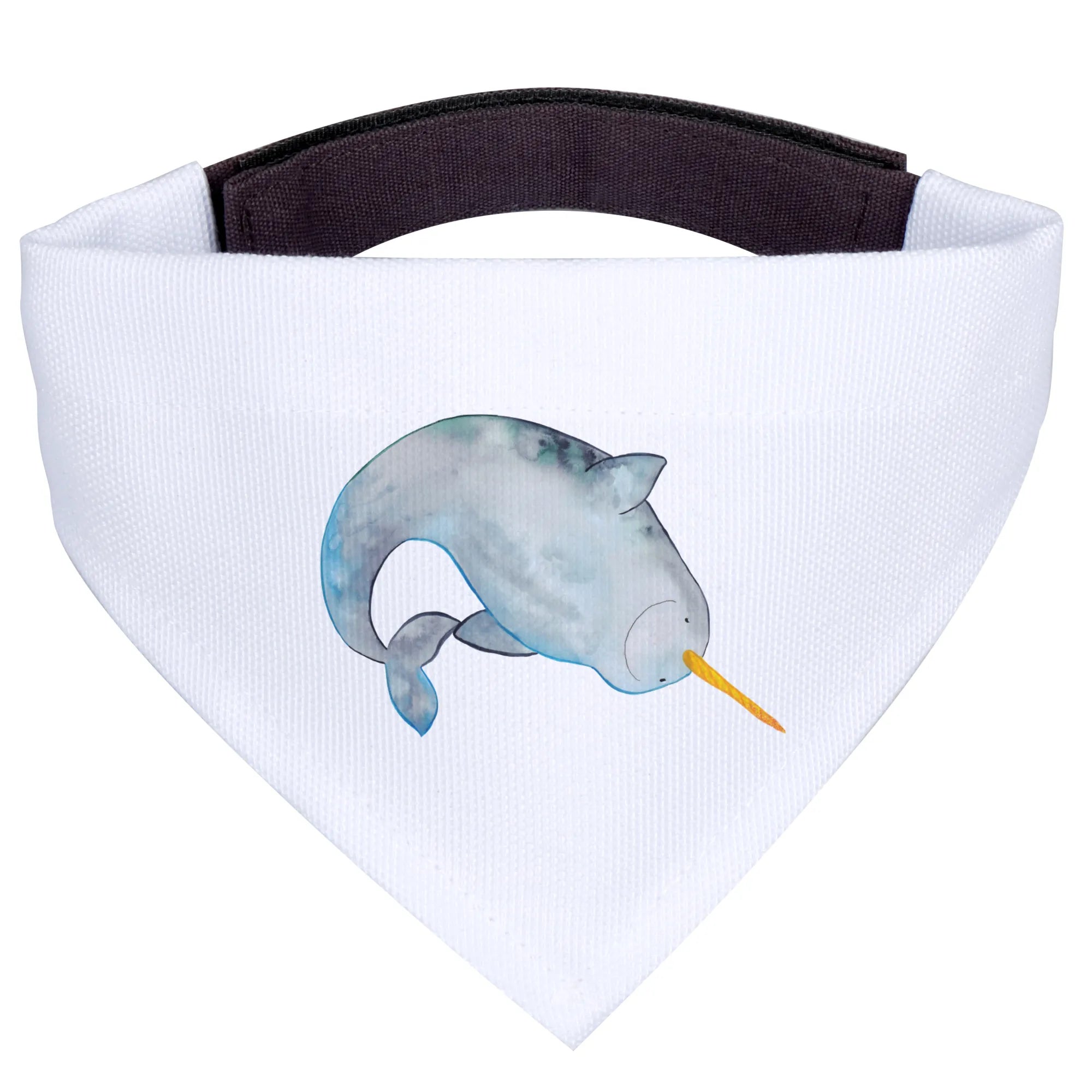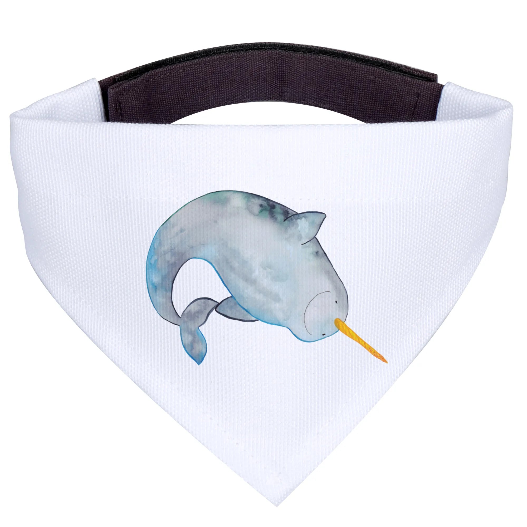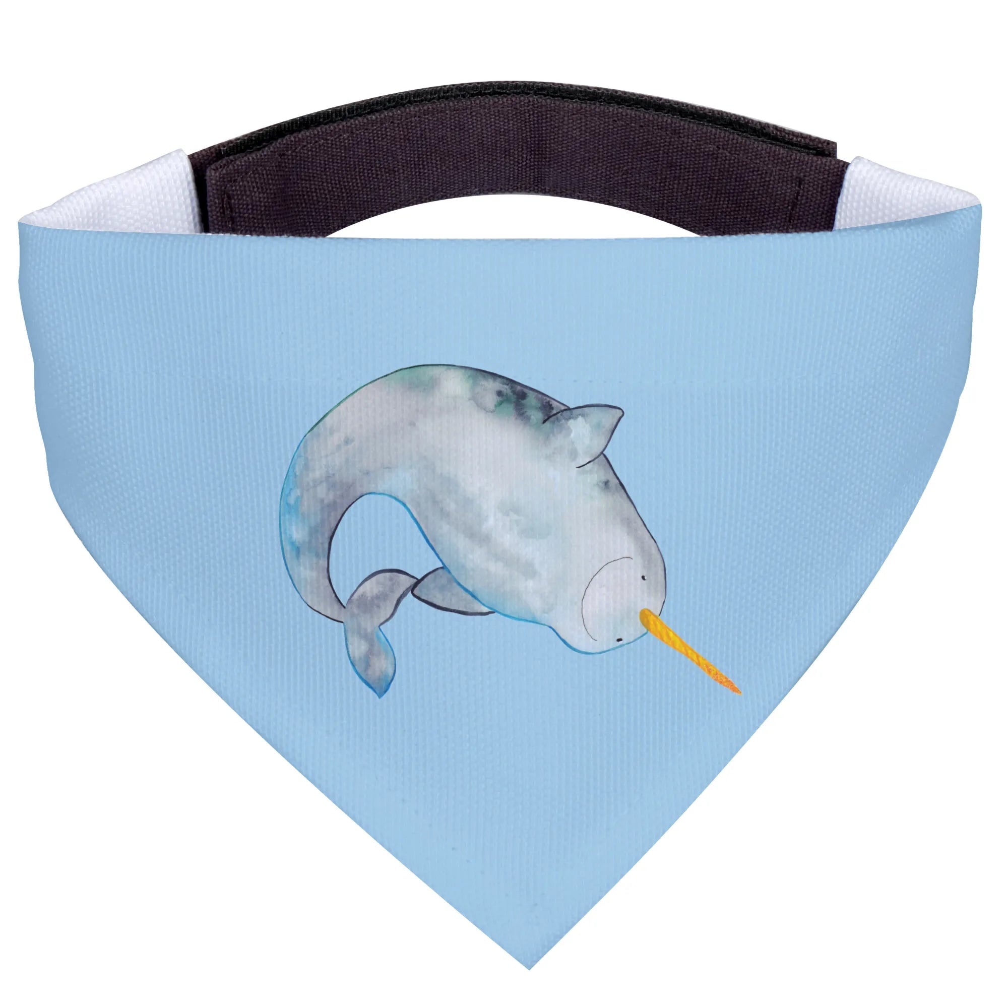 Imagine your beloved companion strutting down the street, wearing this adorable neckerchief featuring a lovingly designed narwhal. With its round face, long, elegant tusk painted in a yellow-orange hue, and a soothing blend of blue and gray tones, this whimsical design brings the beauty of the ocean to your dog's wardrobe.