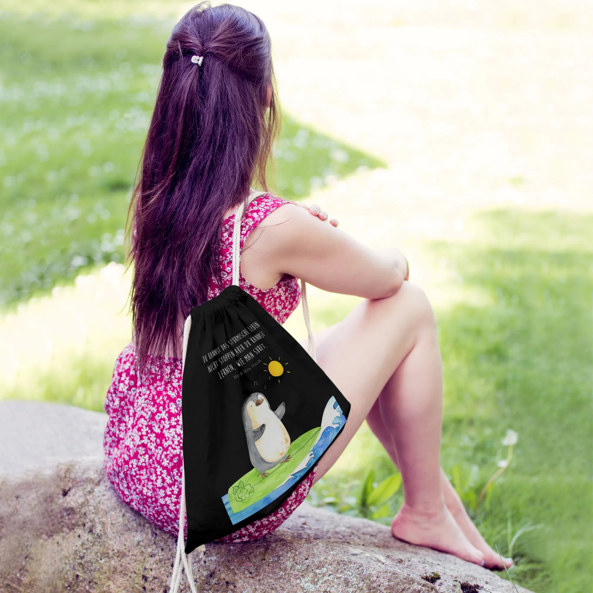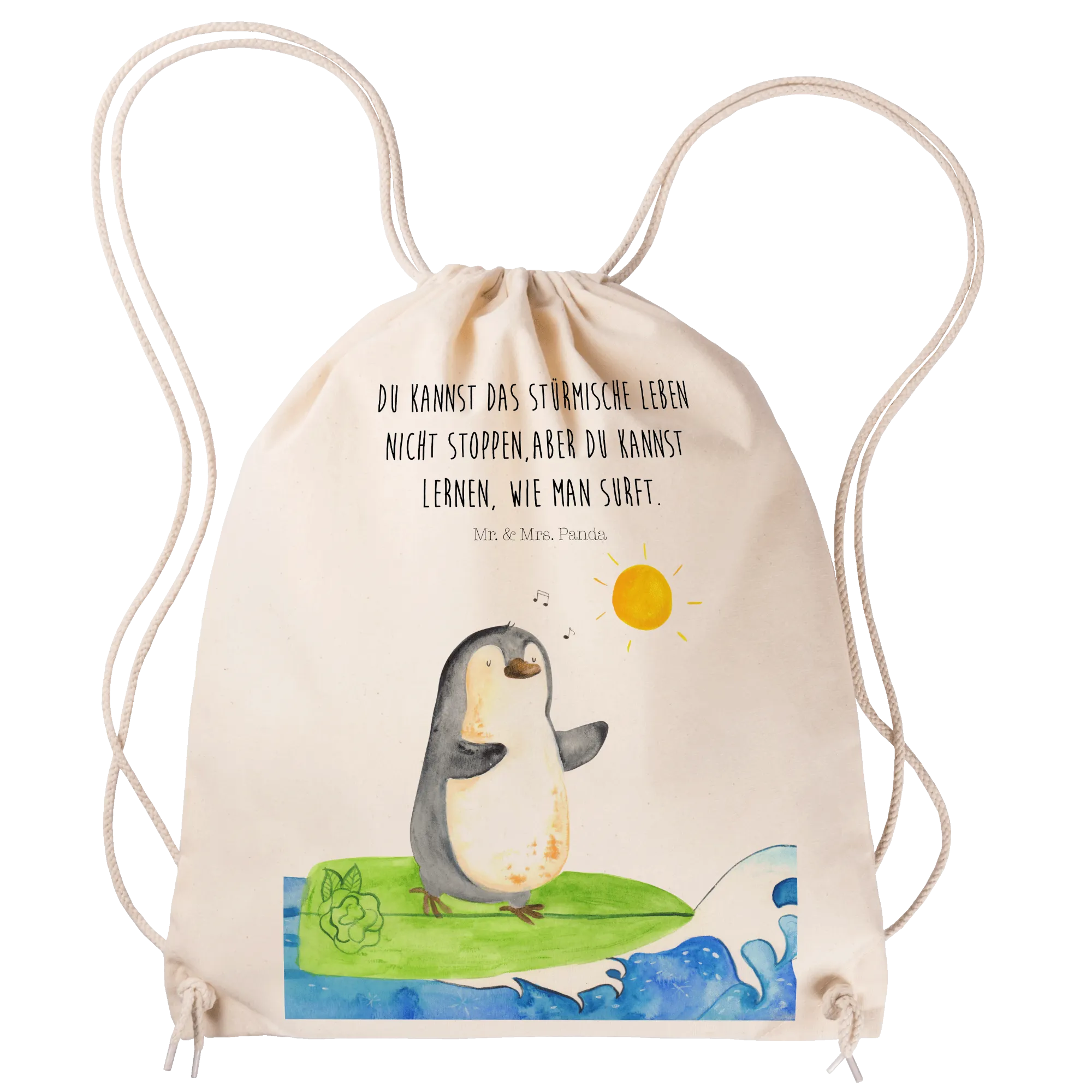 Drawstring bag Penguin surfer - with a saying - Transparent