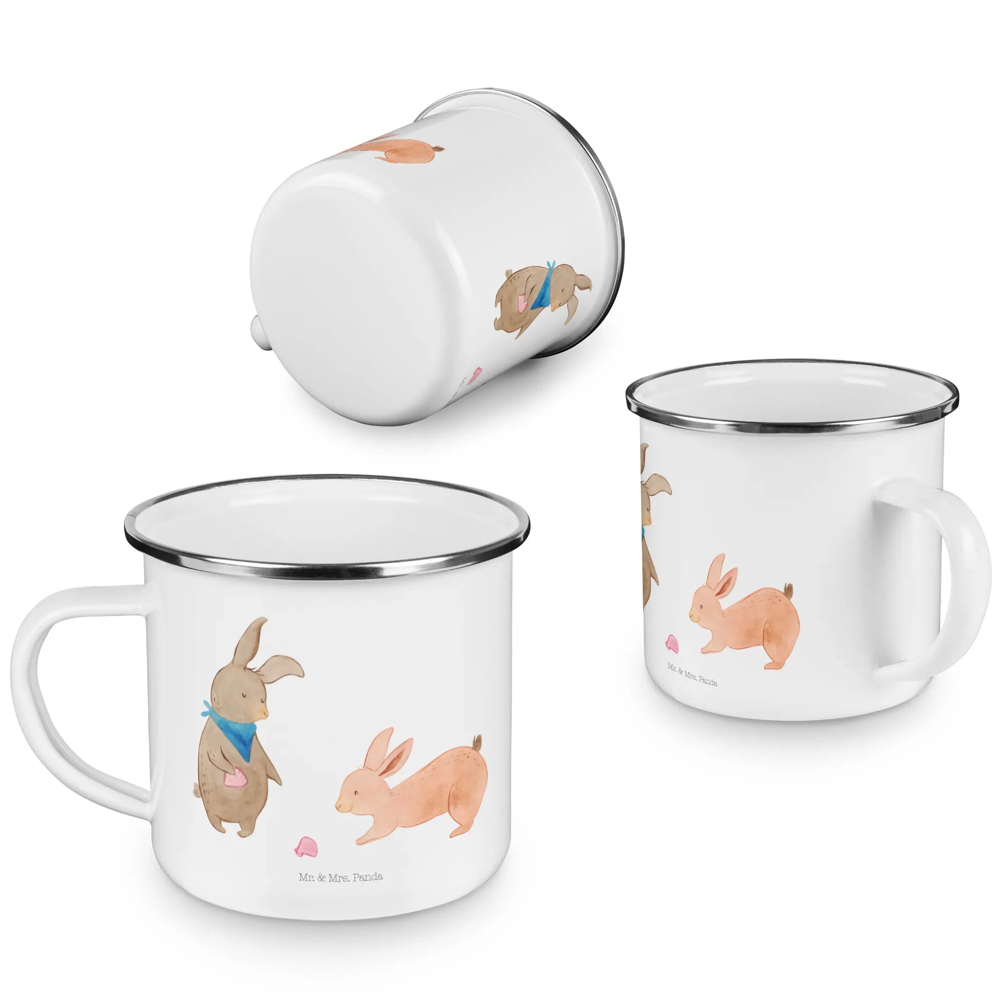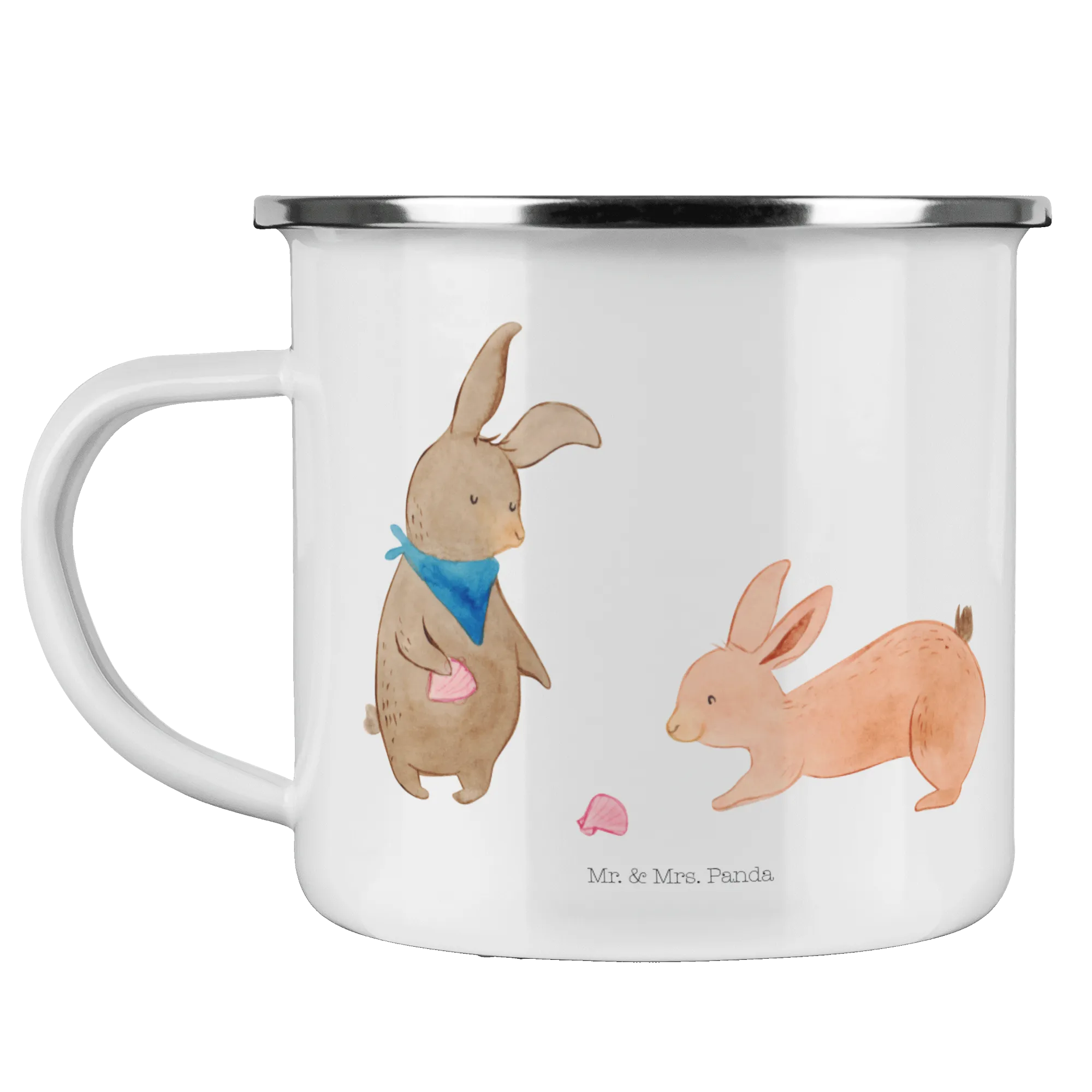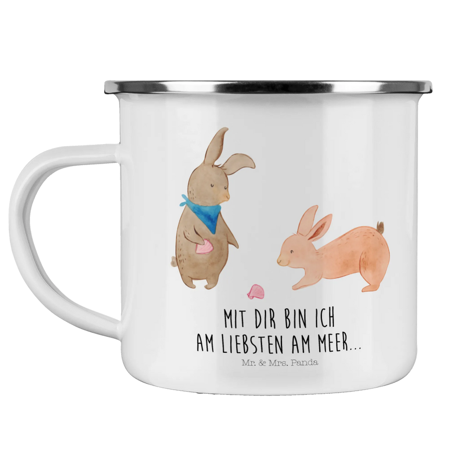 Enamel camping mug Bunnies with seashell - with a saying - White