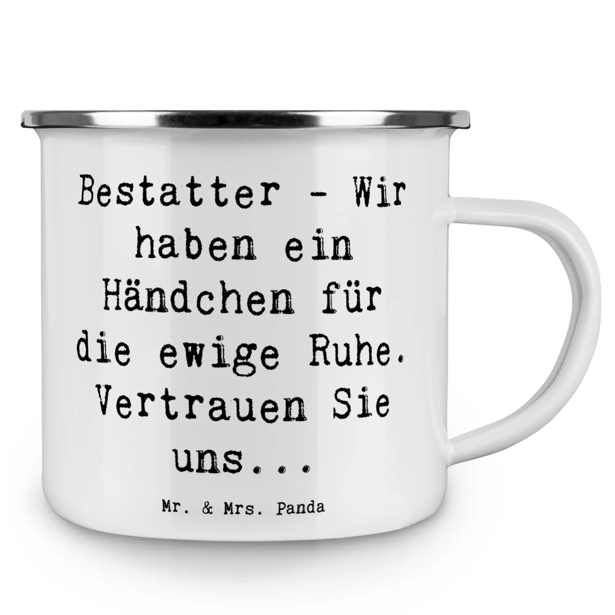Enamel camping mug Saying Bestatter - Wir haben ein Händchen für die ewige Ruhe. Vertrauen Sie uns...