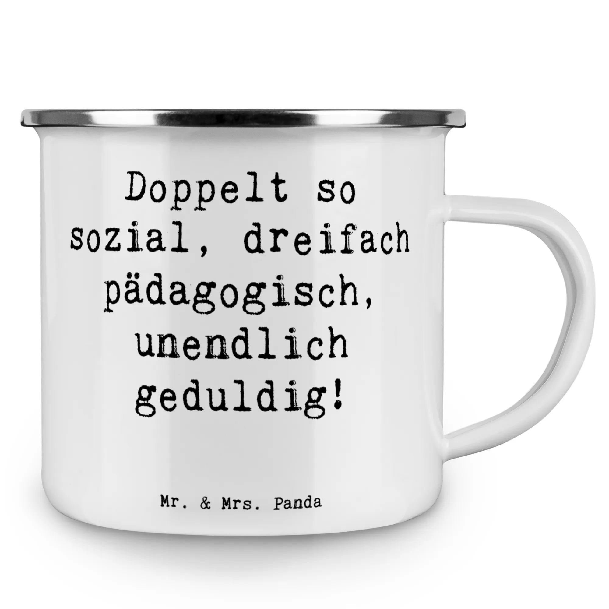 Enamel camping mug Saying Doppelt so sozial, dreifach pädagogisch, unendlich geduldig!