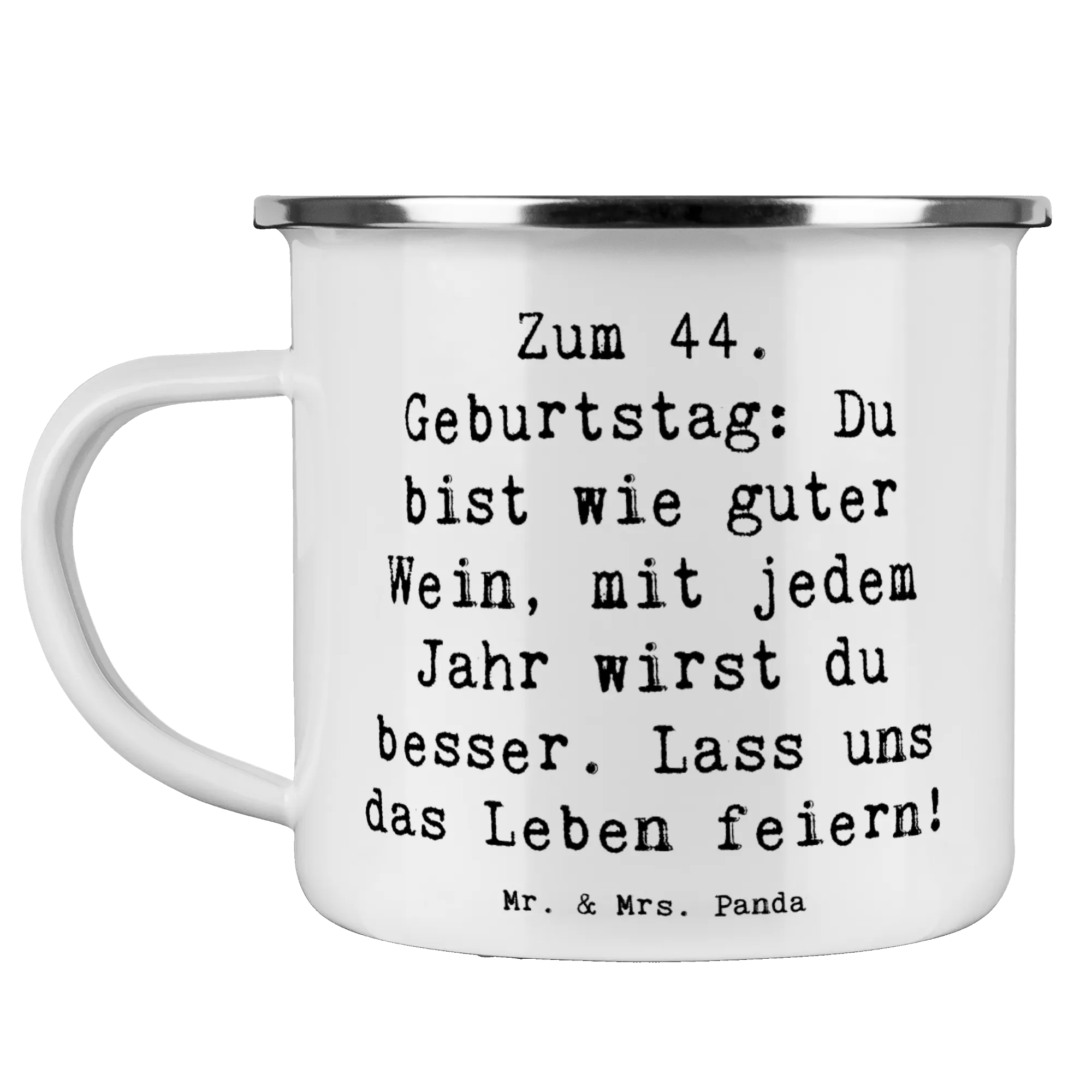 Enamel camping mug Saying Zum 44. Geburtstag: Du bist wie guter Wein, mit jedem Jahr wirst du besser. Lass uns das Leben feiern!