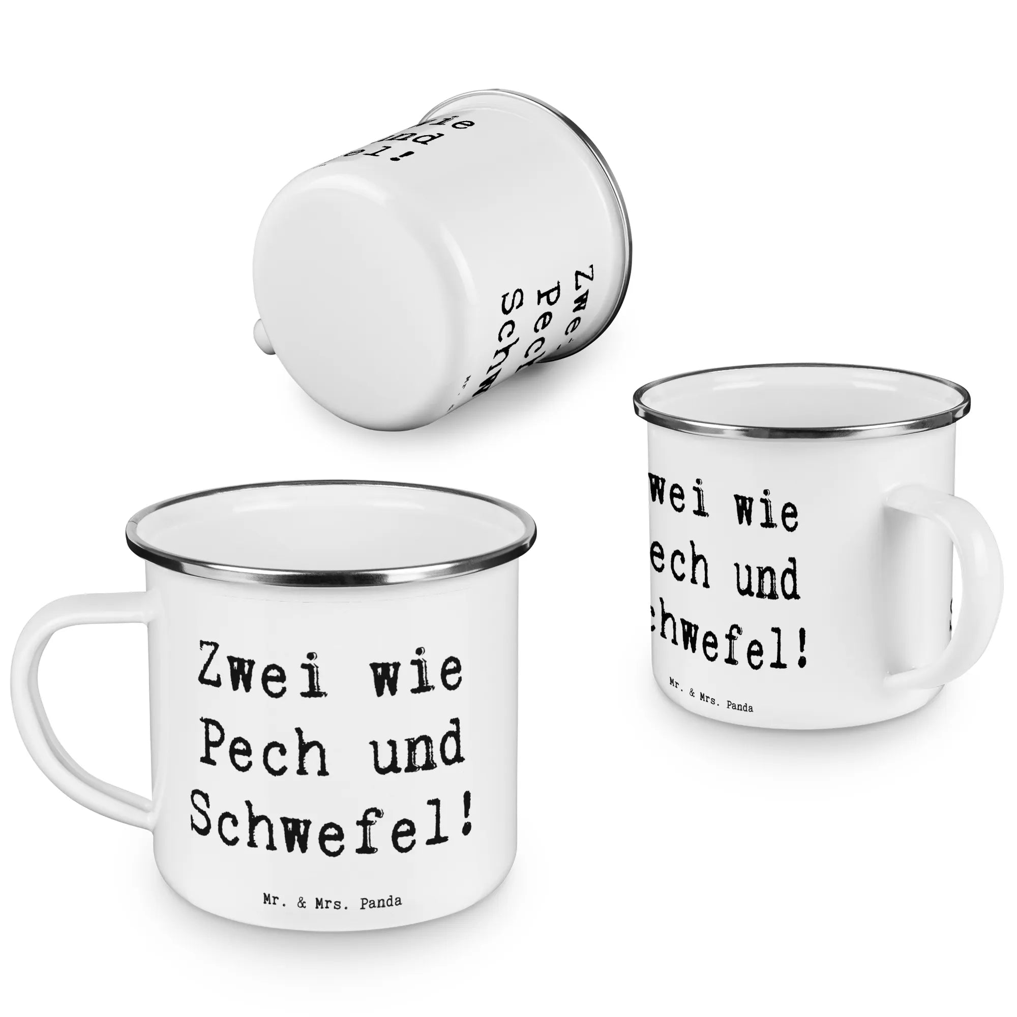 Enamel camping mug Saying Zwei wie Pech und Schwefel!