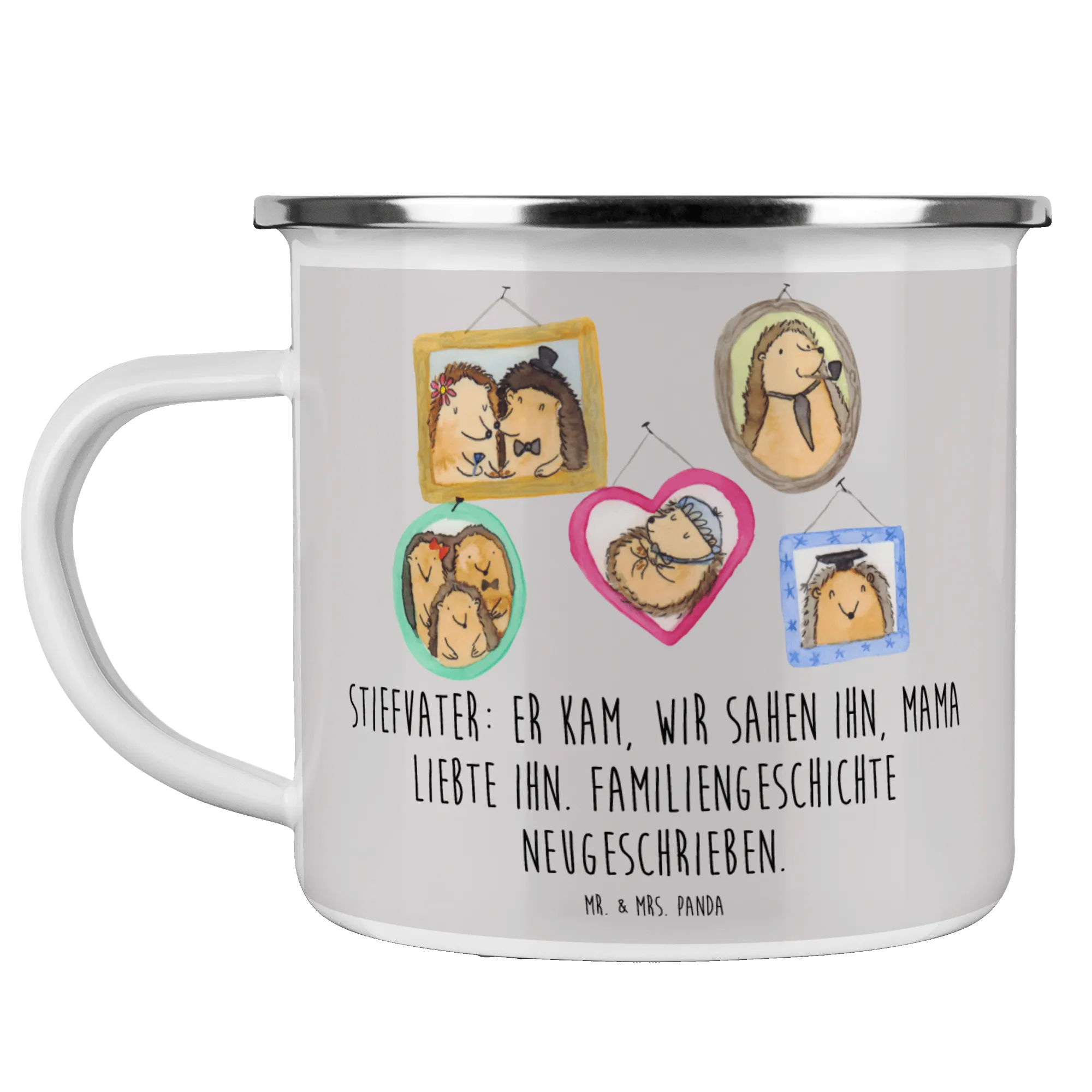 Enamel camping mug Stiefvater: Er kam, wir sahen ihn, Mama liebte ihn. Familiengeschichte neugeschrieben. - White