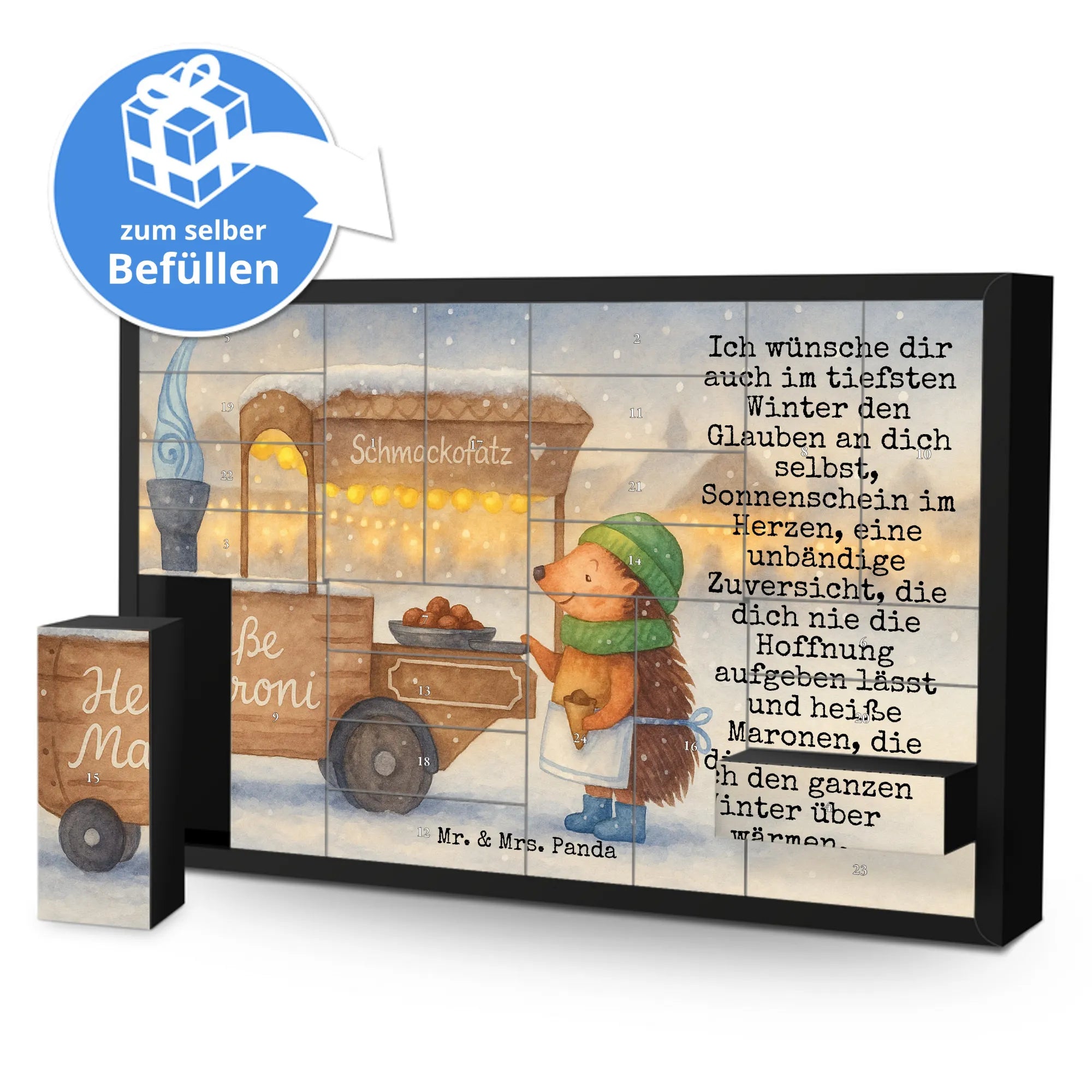 Wunderschöner, befüllbarer Adventskalender von Mr. & Mrs. Panda – perfekt, um die Vorweihnachtszeit ganz persönlich zu gestalten! Dieser liebevoll gestaltete Befüllbarer Adventskalender ist bedruckt mit schönen Sprüchen und zauberhaften Motiven von Mr. & Mrs. Panda. Auf der Frontseite begrüßt dich eine herzliche Zeichnung von Mrs. Panda, die dem Kalender seinen unverwechselbaren Charme verleiht. Der Kalender bietet 24 einzelne Schachteln zum Selbstbefüllen, ideal für kleine Überraschungen, Süßigkeiten oder persönliche Botschaften. Hergestellt aus stabilem Adventskalender Karton, überzeugt er durch brillante Druckqualität mit seidenmatter Oberfläche, die Farben und Details besonders schön zur Geltung bringt. Der Kalender ist nicht personalisierbar und wird ohne Füllung geliefert – so kannst du ihn ganz nach deinen Wünschen befüllen. Die praktische Aufstellvorrichtung sorgt dafür, dass der Kalender sicher und dekorativ steht. Maße: Breite: 619 mm, Höhe: 405 mm, Tiefe: 50 mm. Ob als Geschenk für die Familie, für Freunde oder als hübsche Deko für dein Zuhause – dieser Adventskalender zaubert Vorfreude und ist dabei robust und liebevoll gestaltet. Schenke dir oder deinen Liebsten jeden Tag im Advent ein kleines Lächeln mit diesem charmanten Begleiter von Mr. & Mrs. Panda.