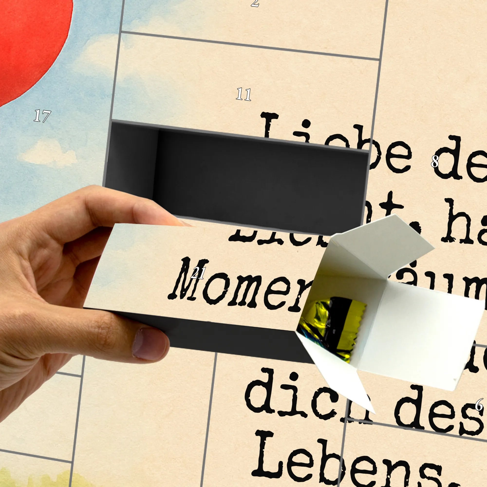 DIY Adventskalender von Mr. & Mrs. Panda – für alle, die ihren Advent individuell gestalten möchten! Dieser DIY Adventskalender überzeugt mit liebevollen Motiven, witzigen und warmherzigen Sprüchen sowie einer charmanten Zeichnung von Mrs. Panda auf der Frontseite. Du bekommst 24 einzelne Schachteln zum Selberbefüllen, sodass jeder Tag im Dezember eine kleine Überraschung bereithält. Der stabile Adventskalender Karton sorgt für Langlebigkeit, während die brillante Druckqualität und die seidenmatte Oberfläche dem Kalender eine hochwertige Optik verleihen. Bitte beachte: Der Kalender ist nicht personalisierbar und wird ohne Füllung geliefert. Die Aufstellvorrichtung ist inklusive und macht das Dekorieren besonders einfach. Maße: Breite: 619 mm, Höhe: 405 mm, Tiefe: 50 mm. Ob als Bastelprojekt mit den Kindern oder als liebevolles Geschenk für Freundinnen und Familie – dieser DIY Adventskalender bringt Kreativität in die Adventszeit und sorgt für unvergessliche, täglich kleine Glücksmomente.