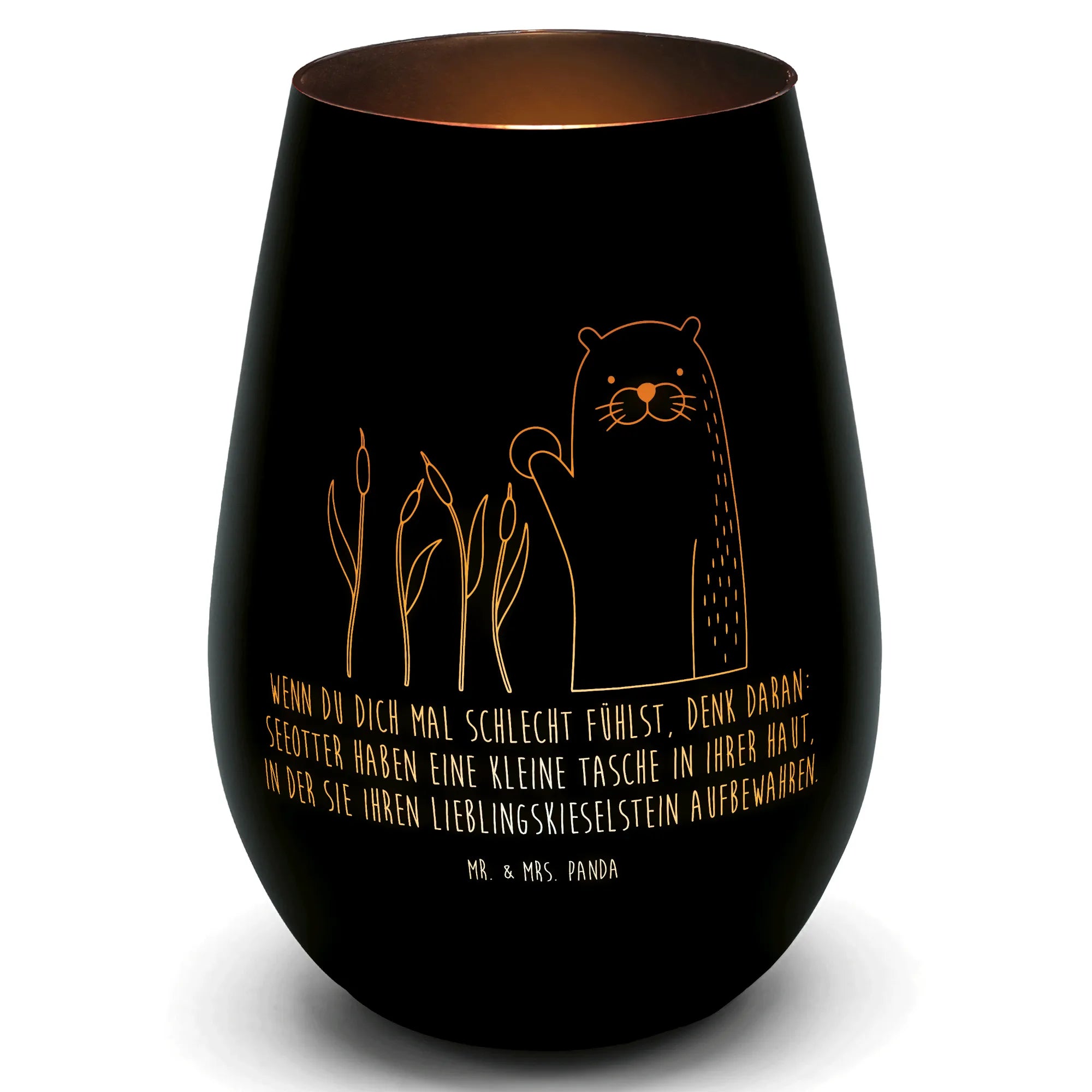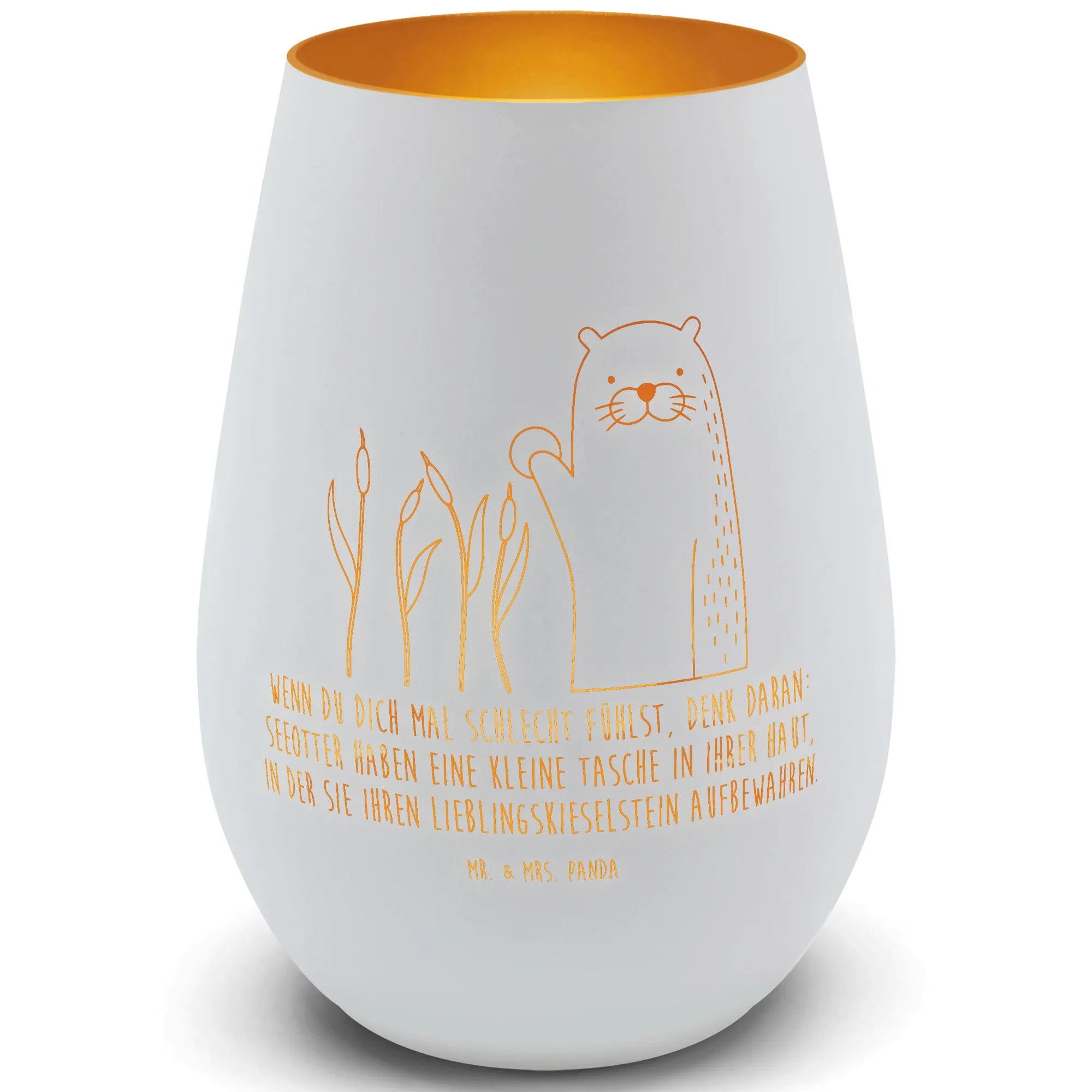 Für Otter-Fans, Naturfreunde, Verliebte oder Menschen, die ein aufmunterndes Mitbringsel gebrauchen können: Dieses goldene Windlicht ist ein wunderschönes Geschenk, das Wärme, Stimmung und ein Lächeln schenkt. Mr. & Mrs. Panda haben das Motiv mit viel Herz gestaltet – perfekt, um kleine Glücksmomente zu teilen. ❤️