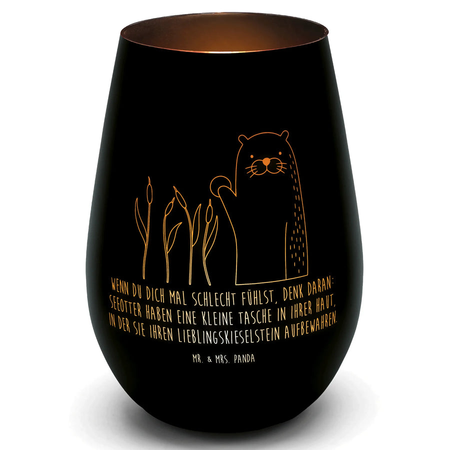 Unser edles Windlicht aus der Otter - Kollektion von Mr. & Mrs. Panda vereint warmes Gold-Design mit einem liebevollen Otter-Motiv. Der süße Seeotter hält seinen Lieblingskieselstein hoch und der charmante Spruch erinnert: „Wenn du dich mal schlecht fühlst, denk daran: Seeotter haben eine kleine Tasche in ihrer Haut, in der sie ihren Lieblingskieselstein aufbewahren.“ Dieses Windlicht ist nicht nur Deko, es ist ein kleiner Mutmacher für dein Zuhause. ✨
