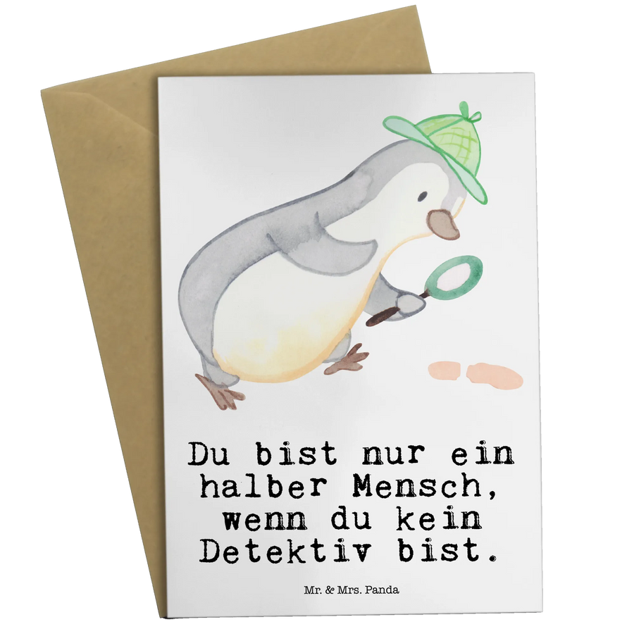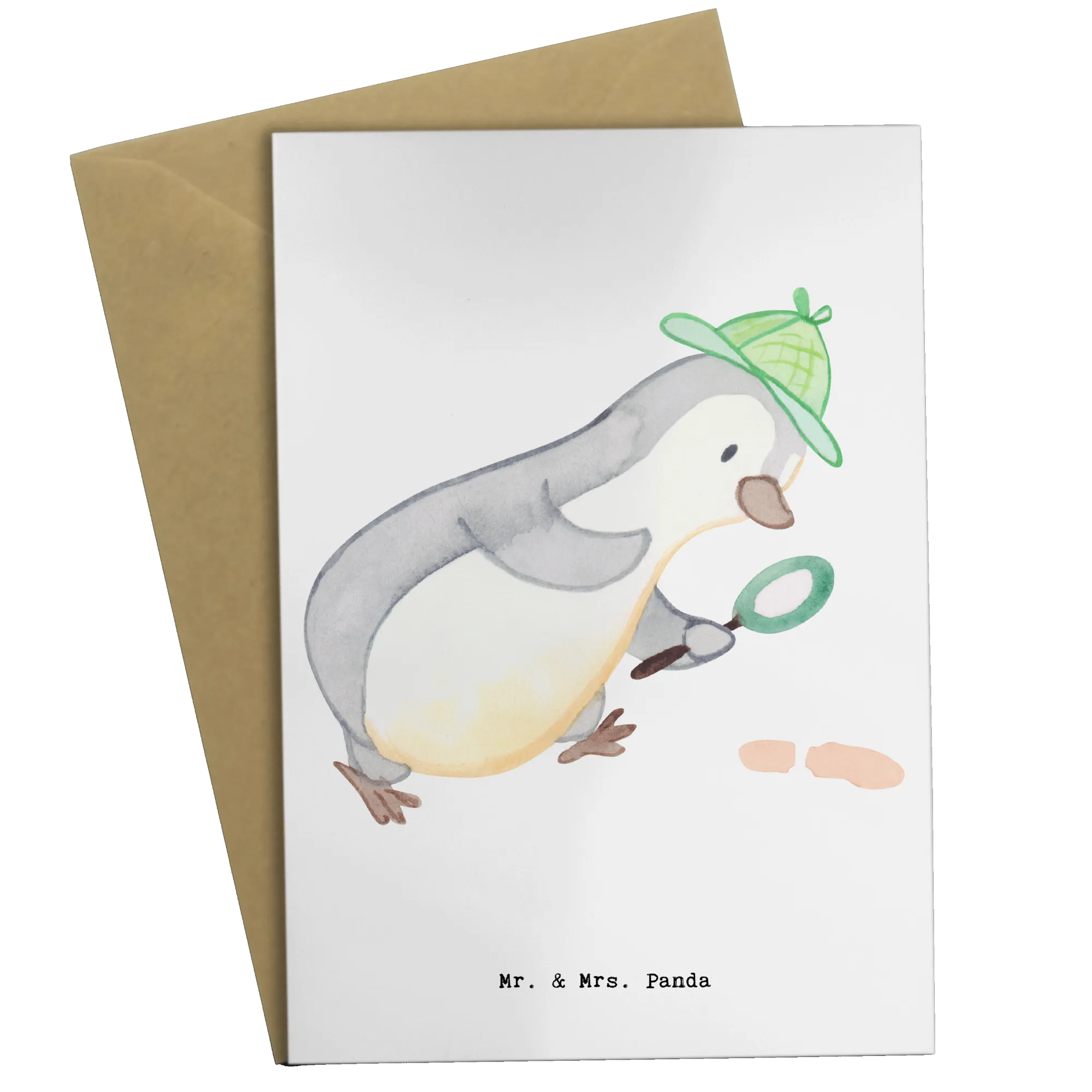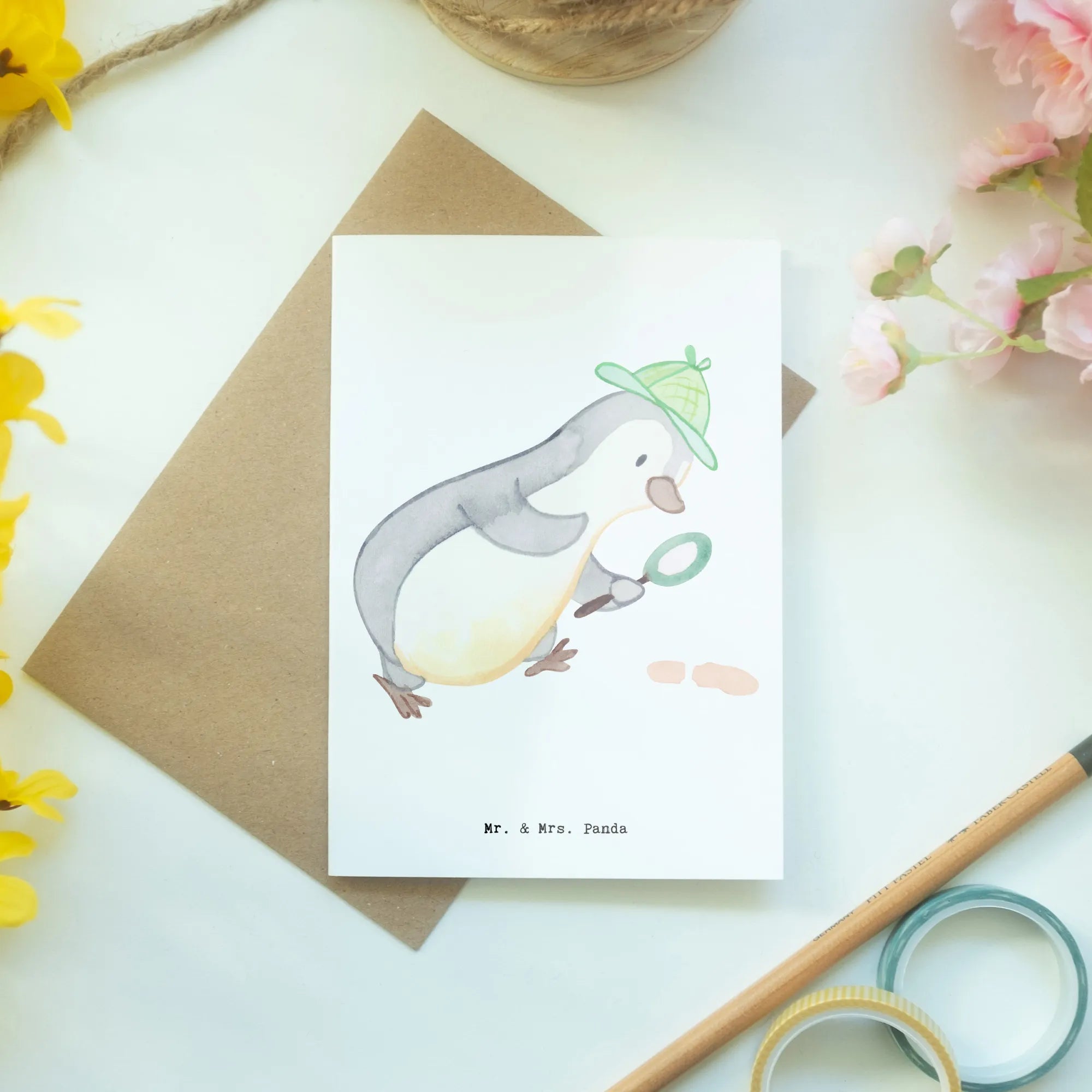Our card, measuring 148 mm x 105 mm, is crafted from high-quality 300-gram cardboard, which gives it an elegant and noble appearance. But what truly makes this card a gem is its beautifully illustrated cover featuring a charming little penguin detective, complete with a magnifying glass, diligently following clues. The visual is complemented by the perfect phrase: "Is life even worth living if you're not a detective?" - a cheeky little thought that adds a playful wink to your greeting.