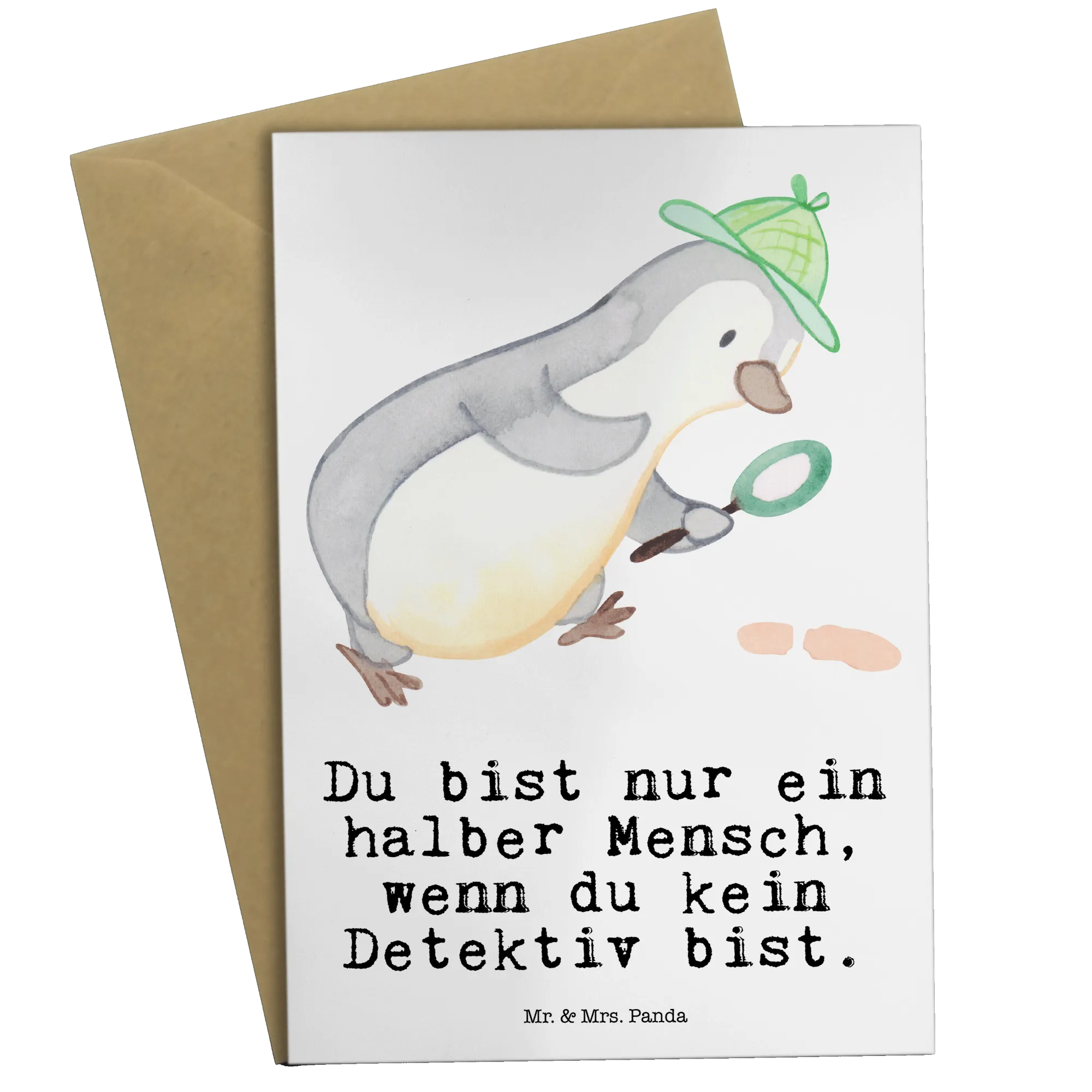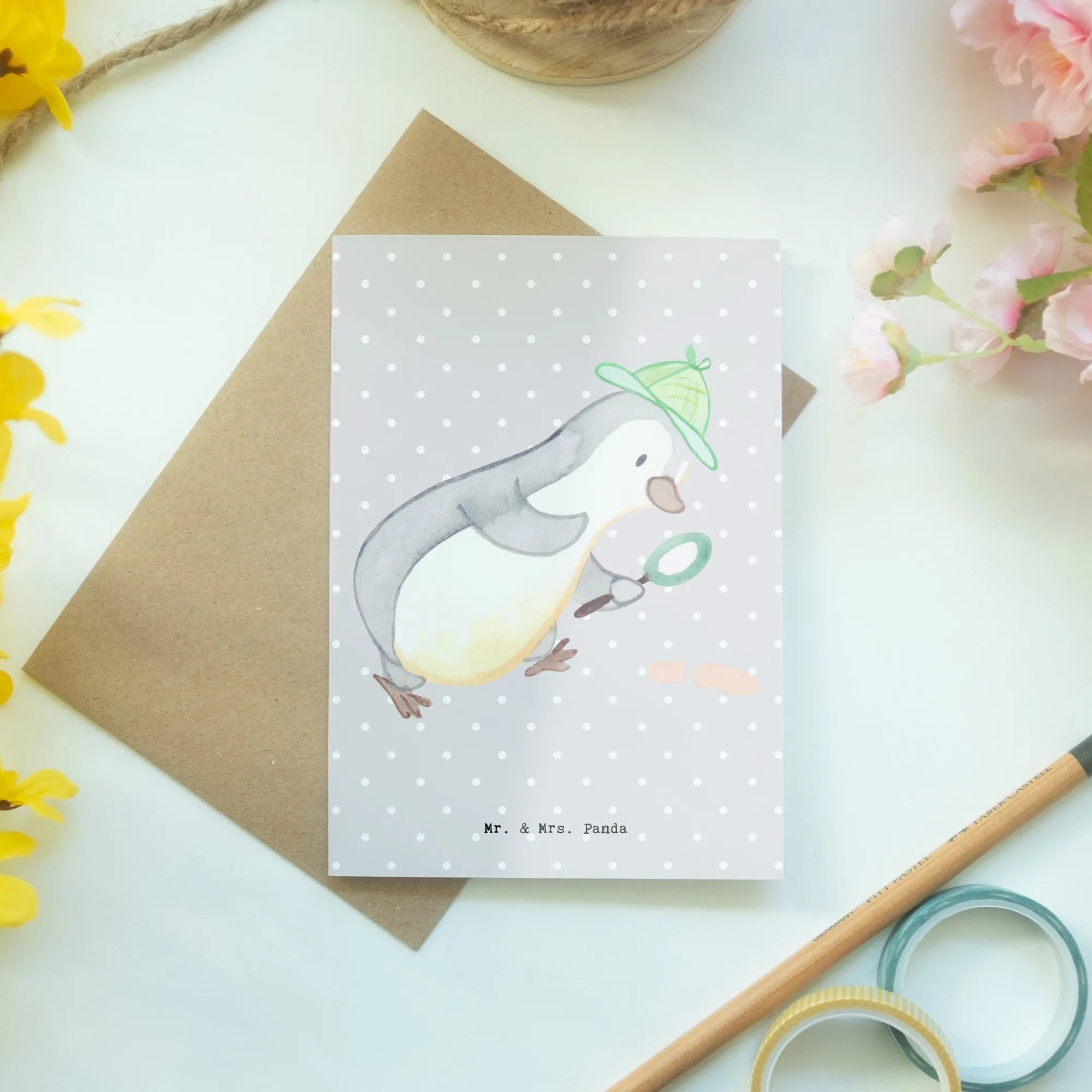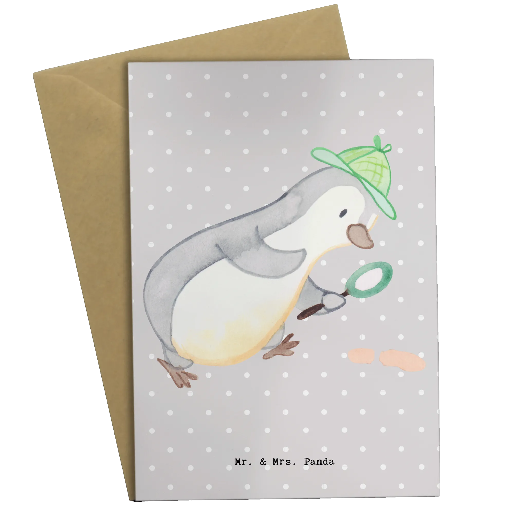 Our card, measuring 148 mm x 105 mm, is crafted from high-quality 300-gram cardboard, which gives it an elegant and noble appearance. But what truly makes this card a gem is its beautifully illustrated cover featuring a charming little penguin detective, complete with a magnifying glass, diligently following clues. The visual is complemented by the perfect phrase: "Is life even worth living if you're not a detective?" - a cheeky little thought that adds a playful wink to your greeting.