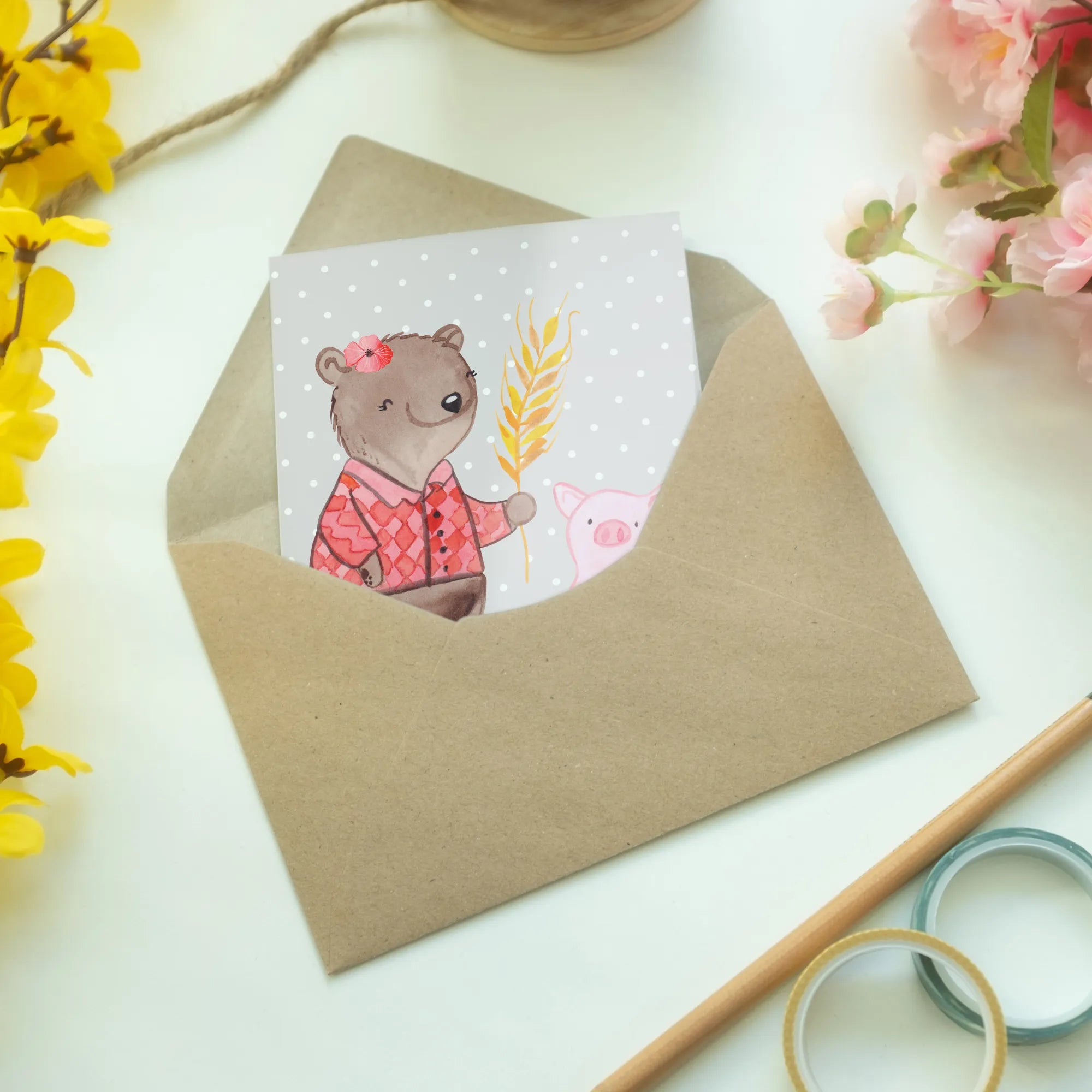 This beautifully designed card features a charming illustration of a female farmer, complete with her checked shirt and a handful of grains, sitting alongside a cheerful pig. With a high-quality glossy finish on the front and back, this card stands out beautifully while maintaining a matte inside for your heartfelt messages.