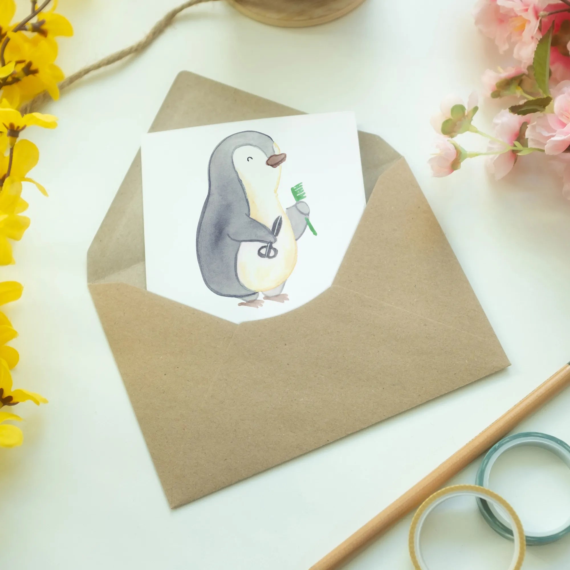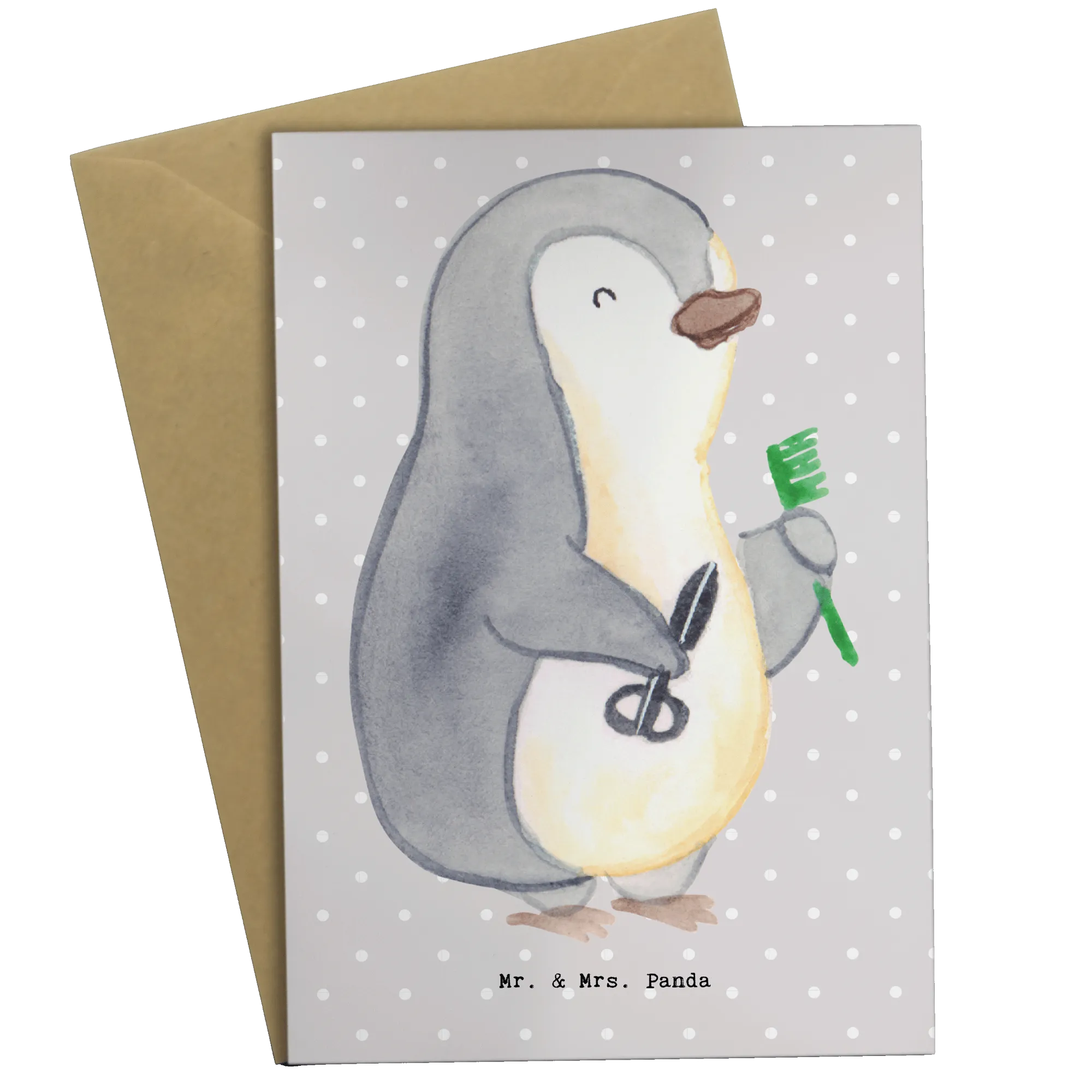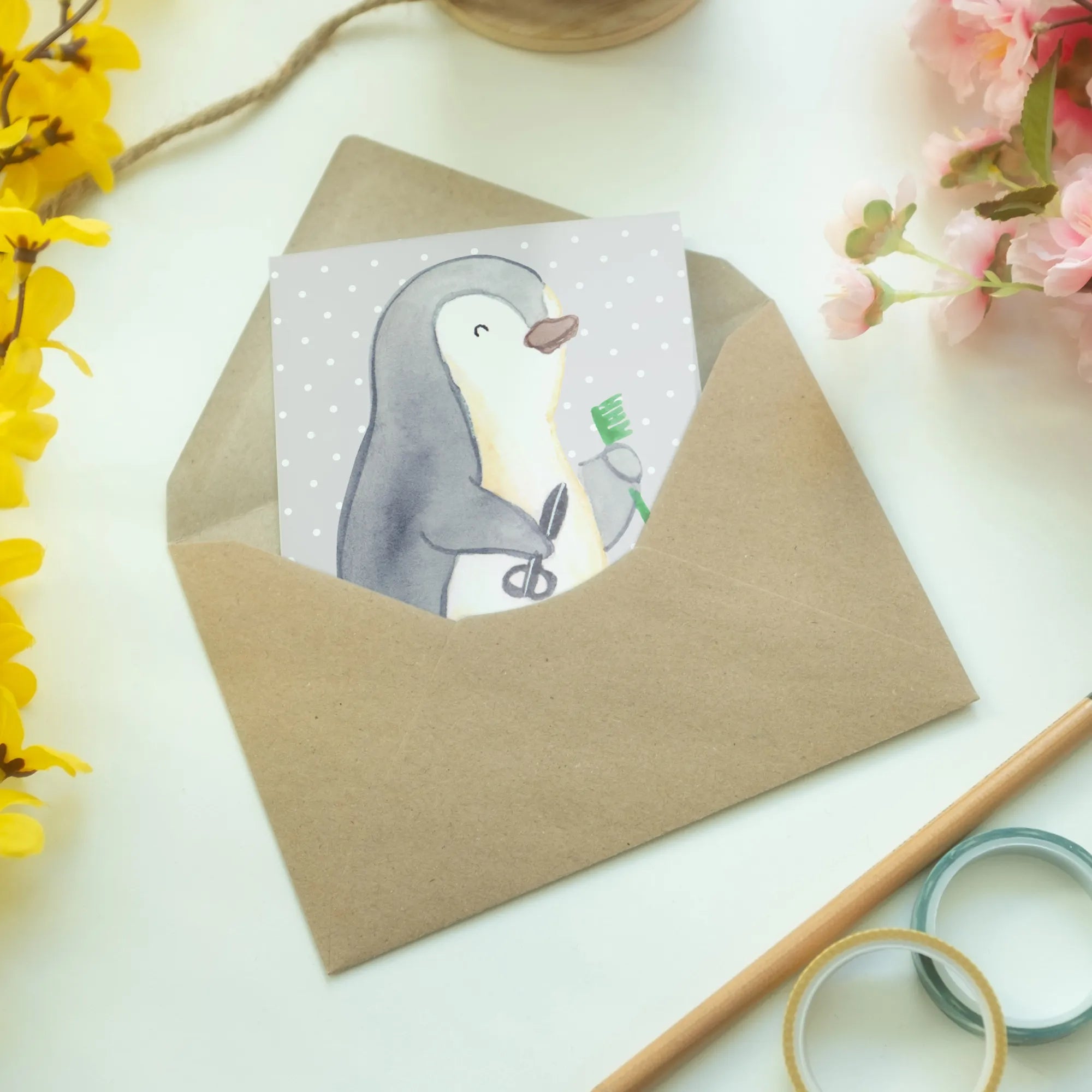 The adorable design features a cheerful penguin holding scissors and a comb, symbolizing the fun, quirky nature of the hairdressing profession. It's perfect for your favorite hairstylist or a close friend who just opened a new salon. The card comes with an elegant envelope, ready for your warmest wishes. Did a friend just ace their hairstyling exams? Or maybe you want to surprise a retiring hairdresser with a heartfelt send-off? This card fits the bill beautifully!