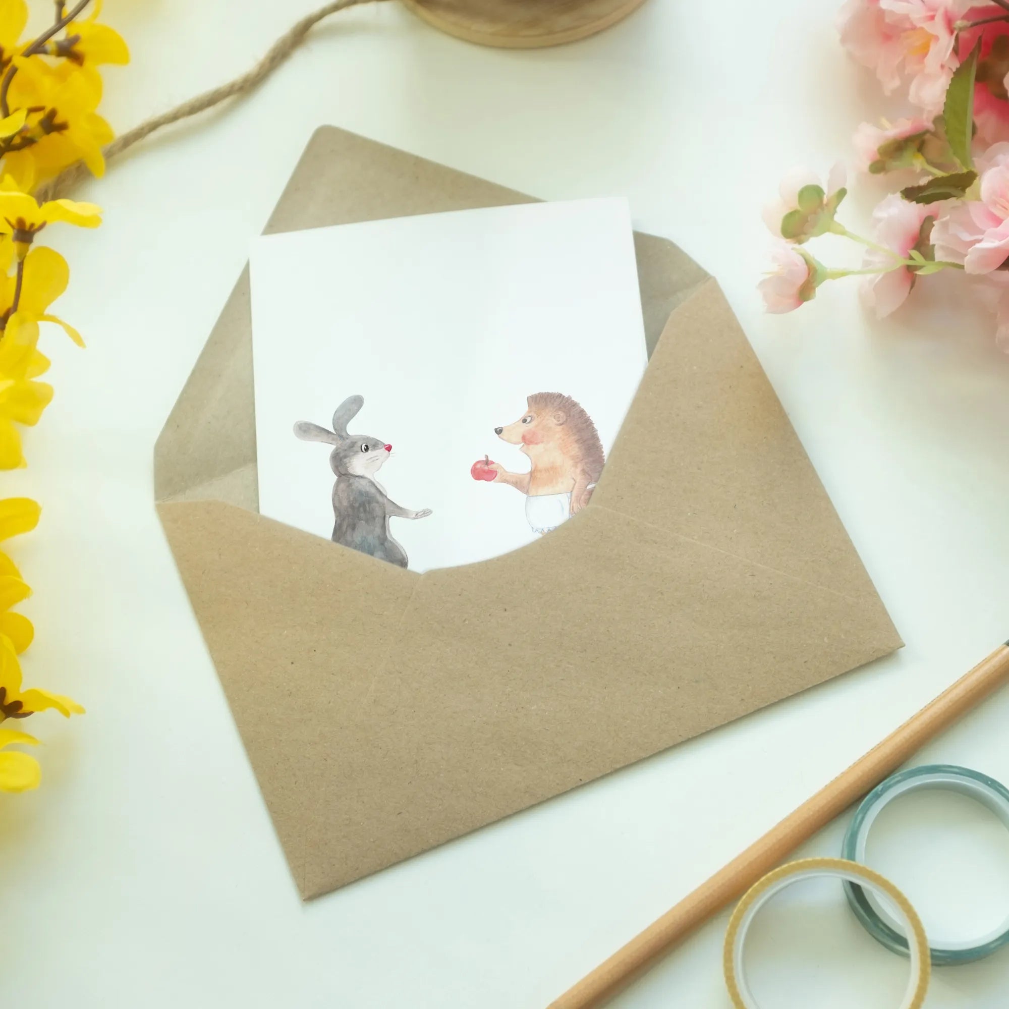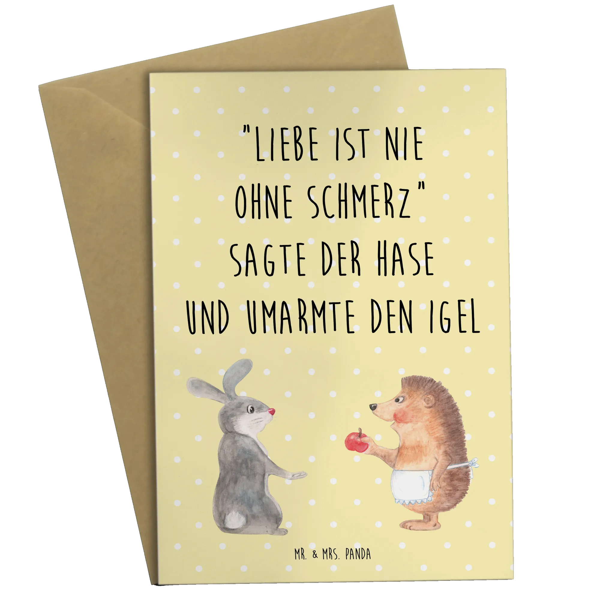Introducing the delightful Mr. & Mrs. Panda Greetings Card, designed especially for those moments when life and love present us with a little heartache. The charming motif features a sweet hedgehog and a lovable hare, wrapped in a tender embrace. This card beautifully captures the sentiment of romantic love, complete with the heartwarming quote: “When it comes to love, there’s always a little pain involved,” said the rabbit before embracing the hedgehog.