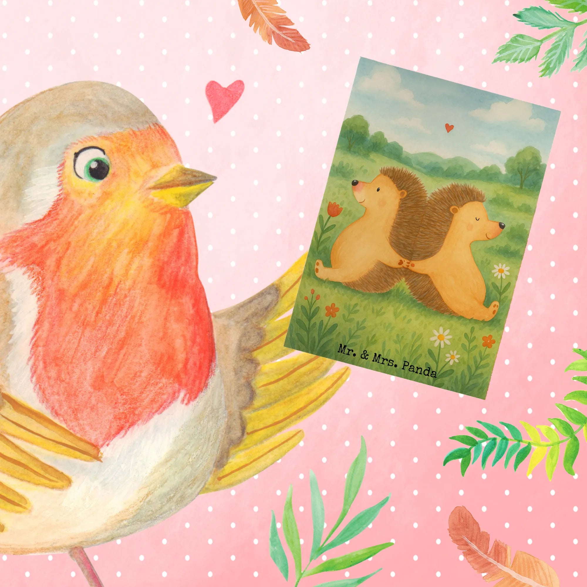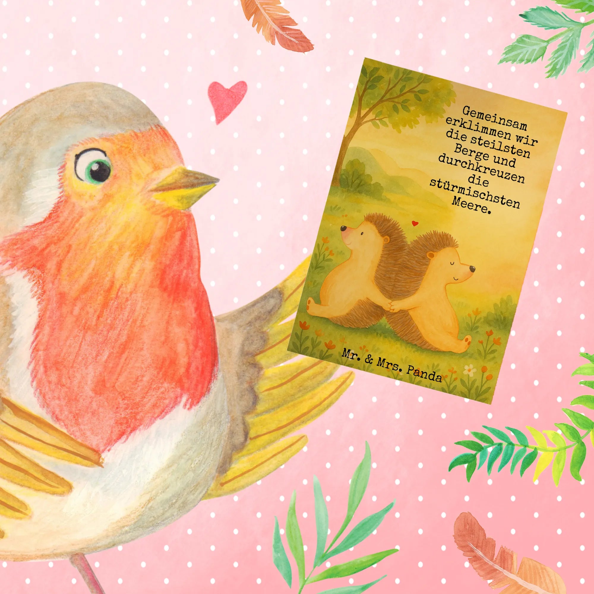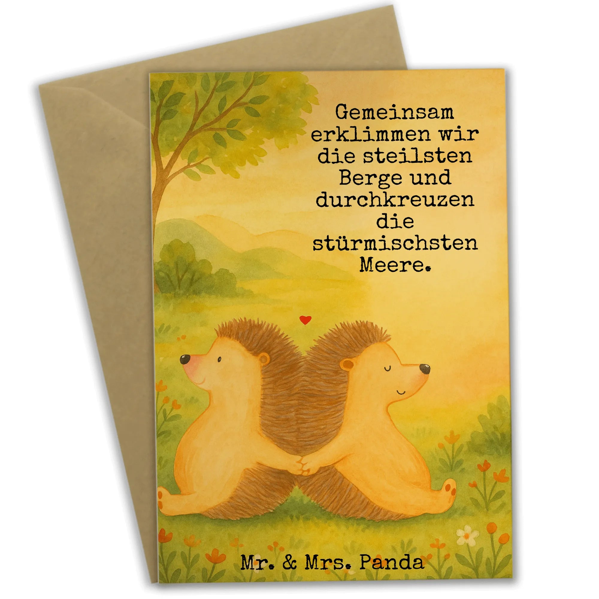 Mr. & Mrs. Panda Grußkarte „Igel händchenhaltend“ – eine zärtliche Liebesbotschaft zum Verschenken. Das handgemalte Motiv zeigt zwei Igel, die Händchen halten, Rücken an Rücken sitzen und ein kleines rotes Herz zwischen sich tragen. Dieses liebevolle Bild steht für Nähe, Gemeinsamkeit und die Bereitschaft, alle Herausforderungen zusammen zu meistern.