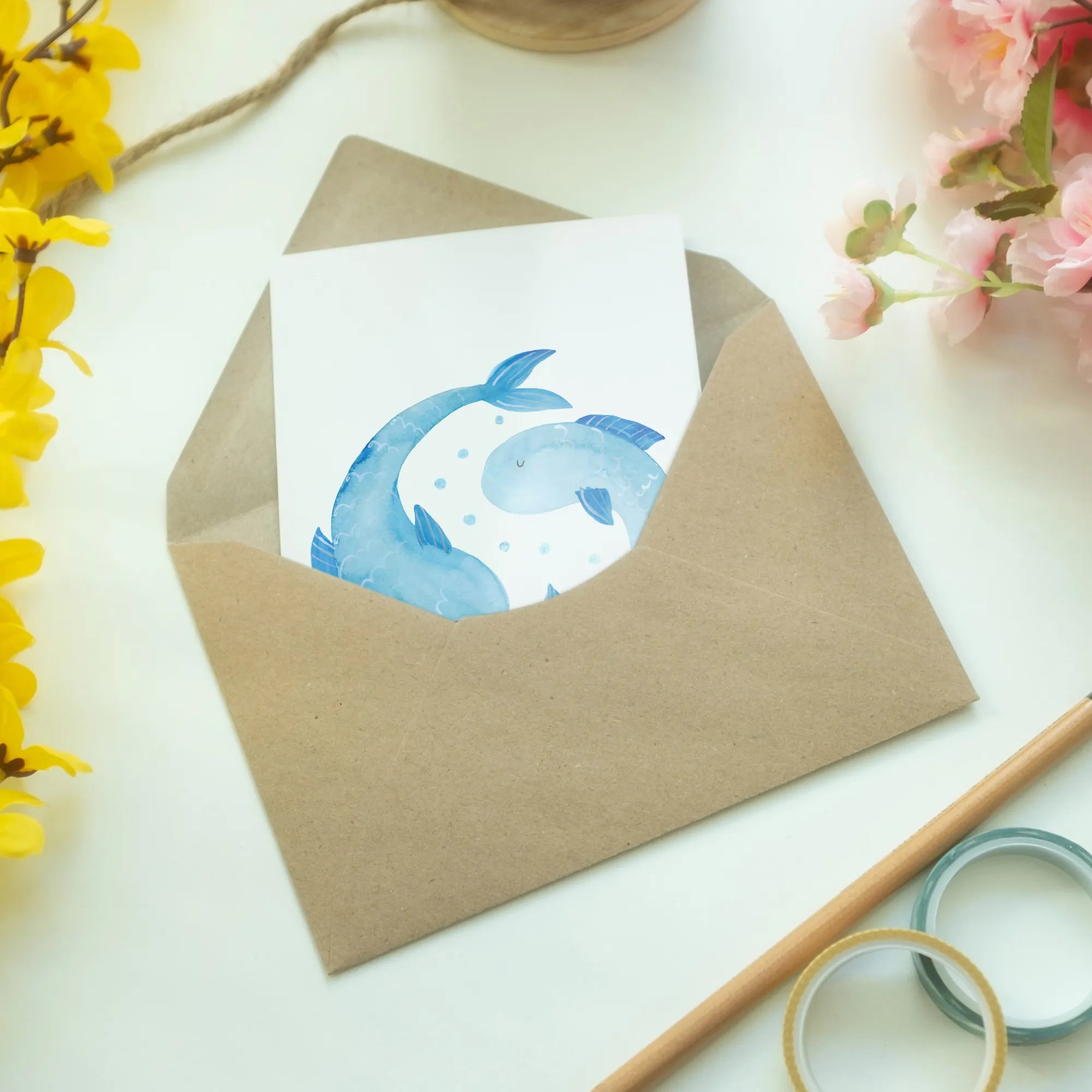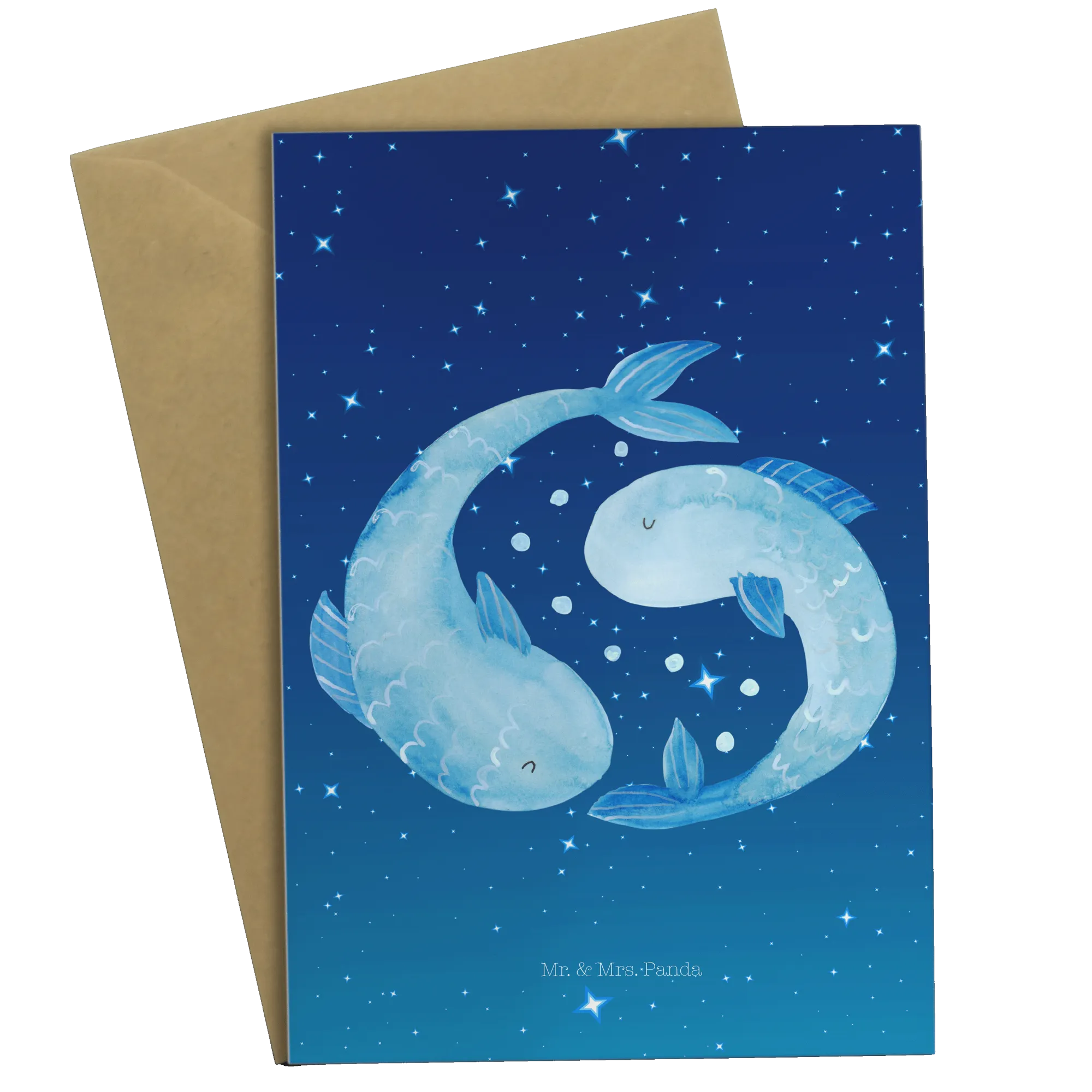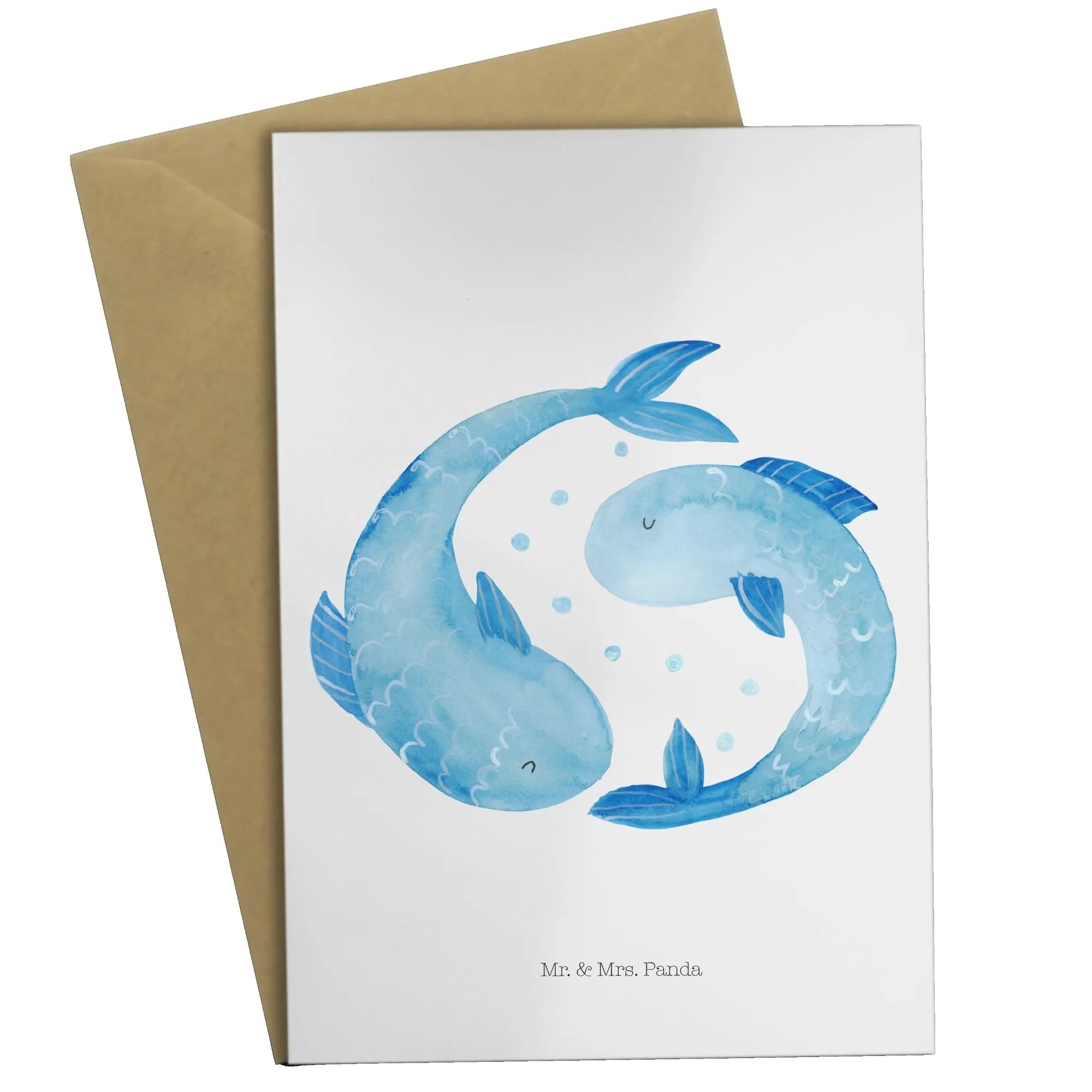 Introducing the charming Zodiac sign of Pisces greeting card from the delightful collection by Mr. & Mrs. Panda! At 148 mm by 105 mm, this beautifully crafted card is made from 300 grams of high-quality cardboard, ensuring that it feels as special as it looks. The stunning artwork showcases two whimsical fish swimming in harmony, capturing the essence of Pisces who are dreamy and empathic souls.