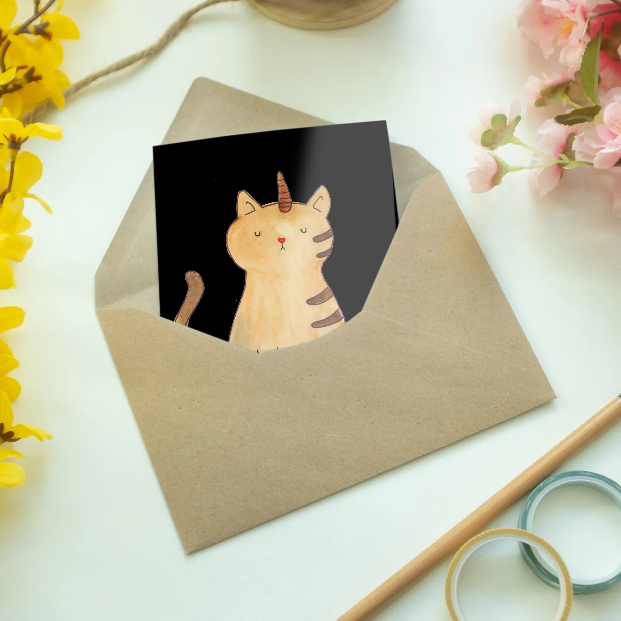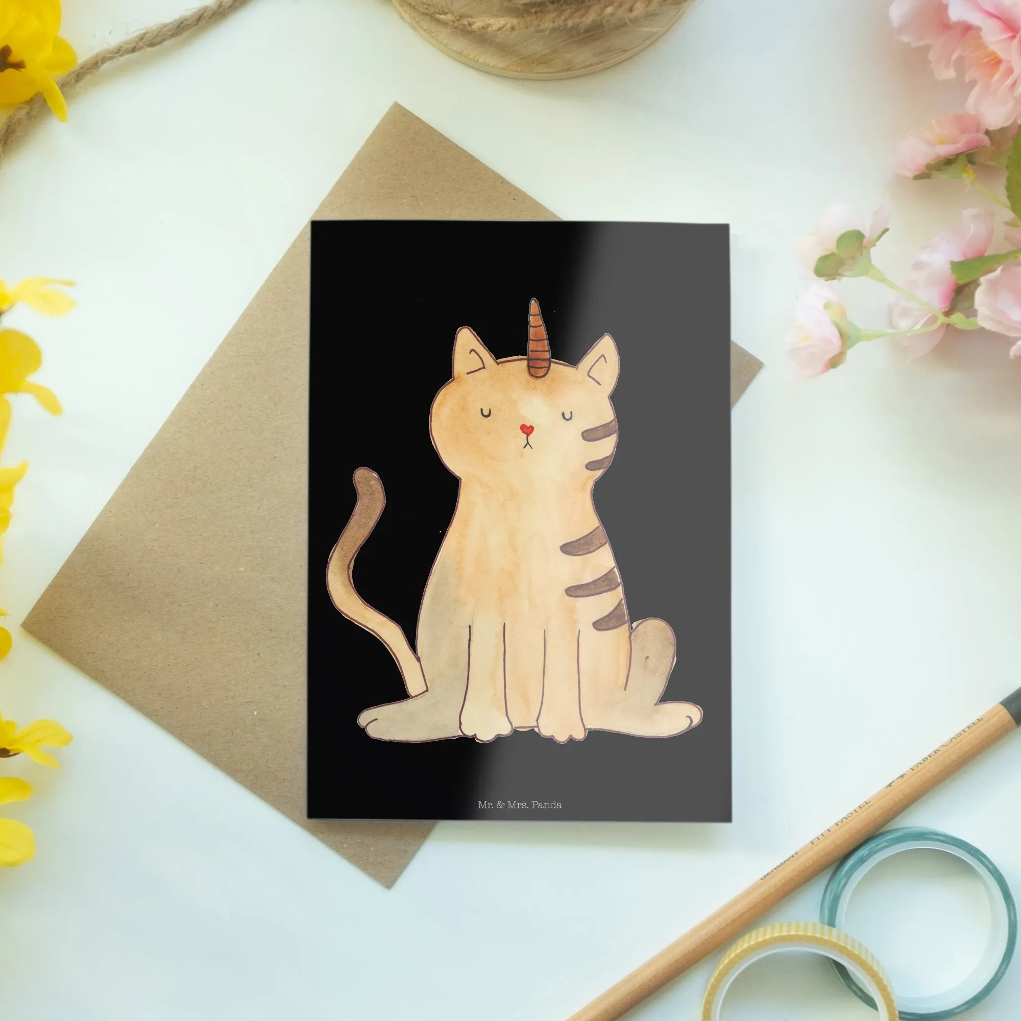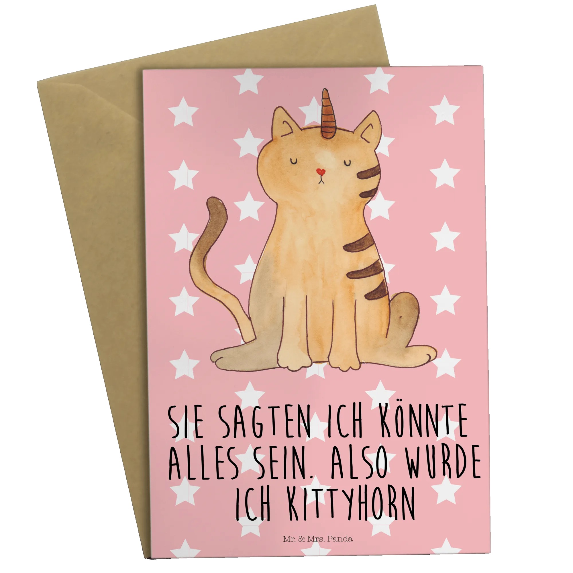 Mr. & Mrs. Panda have curated this design with the utmost love and care. Each motif is hand-drawn by the talented Mrs. Panda in Hanover, Germany, creating a unique color experience that appeals to both children and adults. Just imagine the smile on a friend’s face when they receive a card featuring the whimsical design of a kittycorn, coupled with the message, "Sie sagten, ich könnte alles sein. Also wurde ich Kittyhorn". This enchanting slogan encapsulates the spirit of believing in magic and imagination.