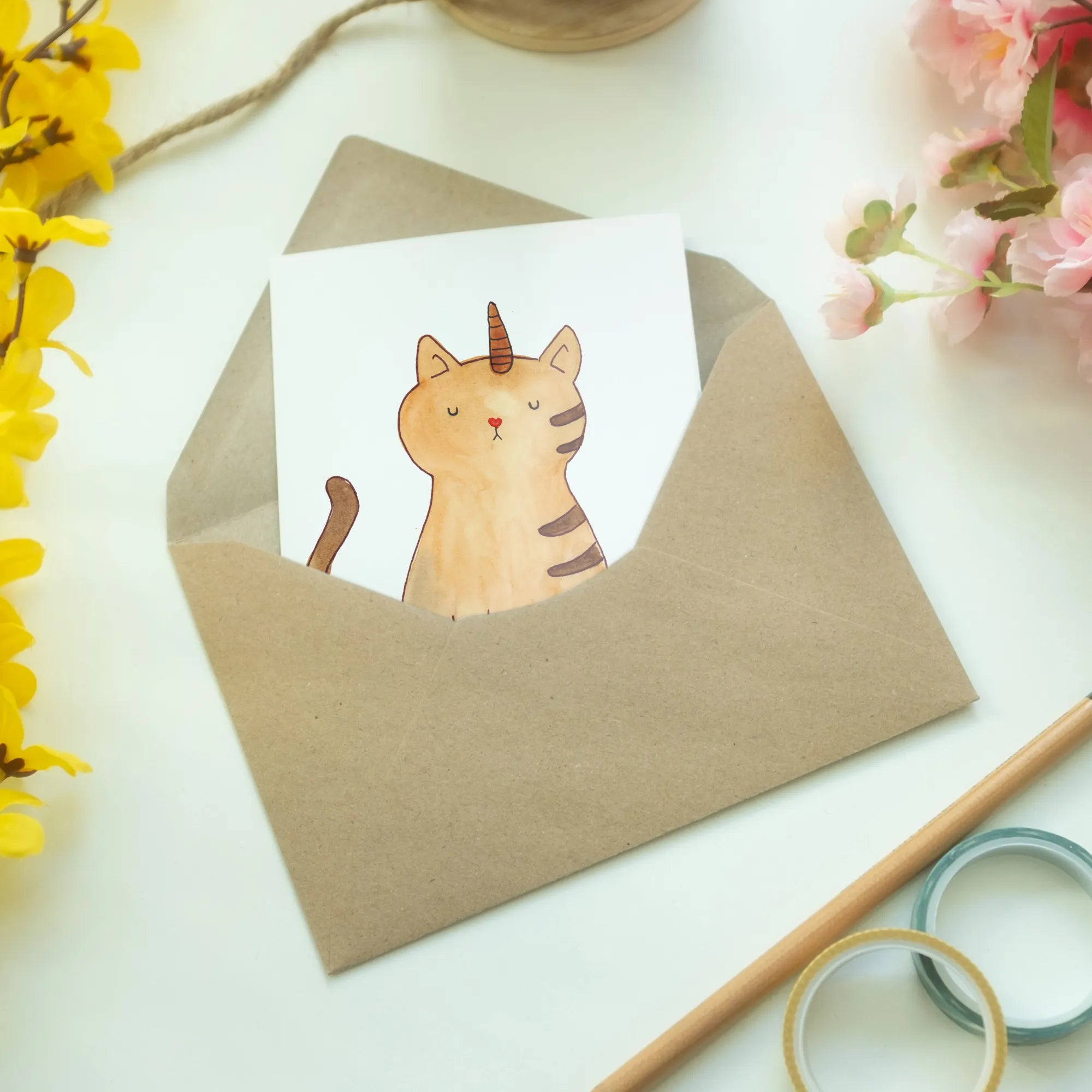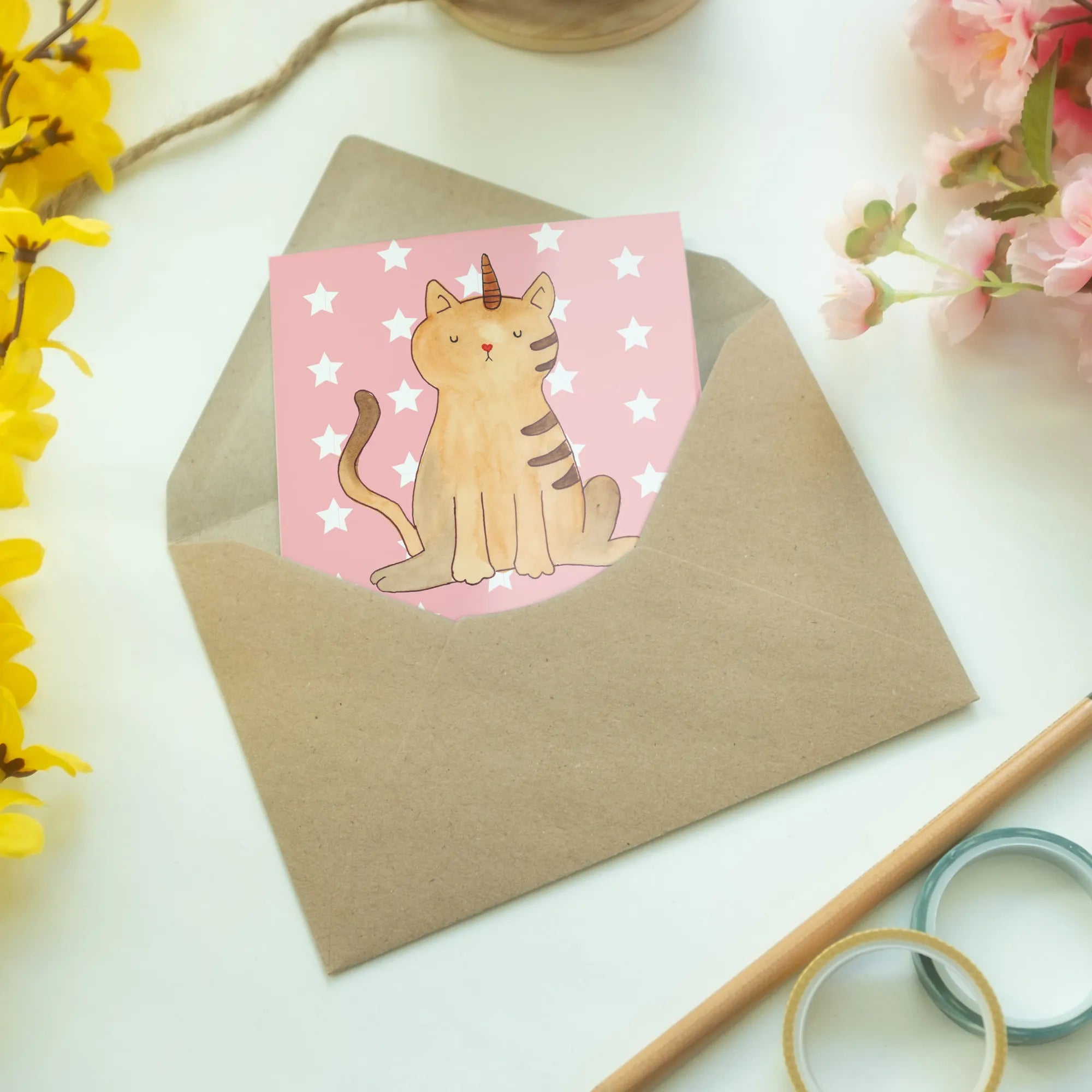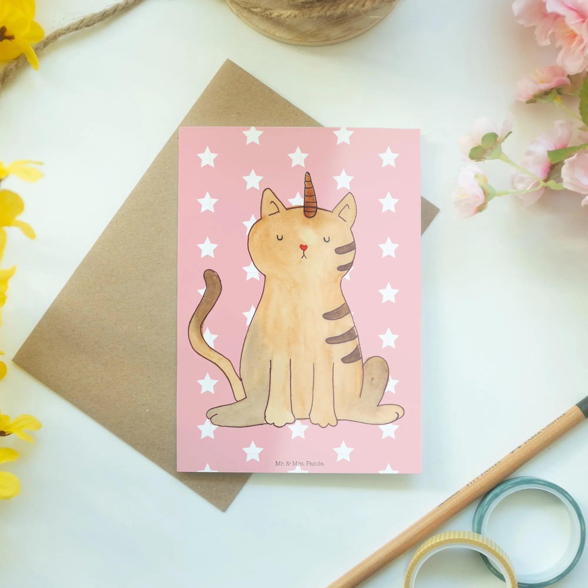 Mr. & Mrs. Panda have curated this design with the utmost love and care. Each motif is hand-drawn by the talented Mrs. Panda in Hanover, Germany, creating a unique color experience that appeals to both children and adults. Just imagine the smile on a friend’s face when they receive a card featuring the whimsical design of a kittycorn, coupled with the message, "Sie sagten, ich könnte alles sein. Also wurde ich Kittyhorn". This enchanting slogan encapsulates the spirit of believing in magic and imagination.