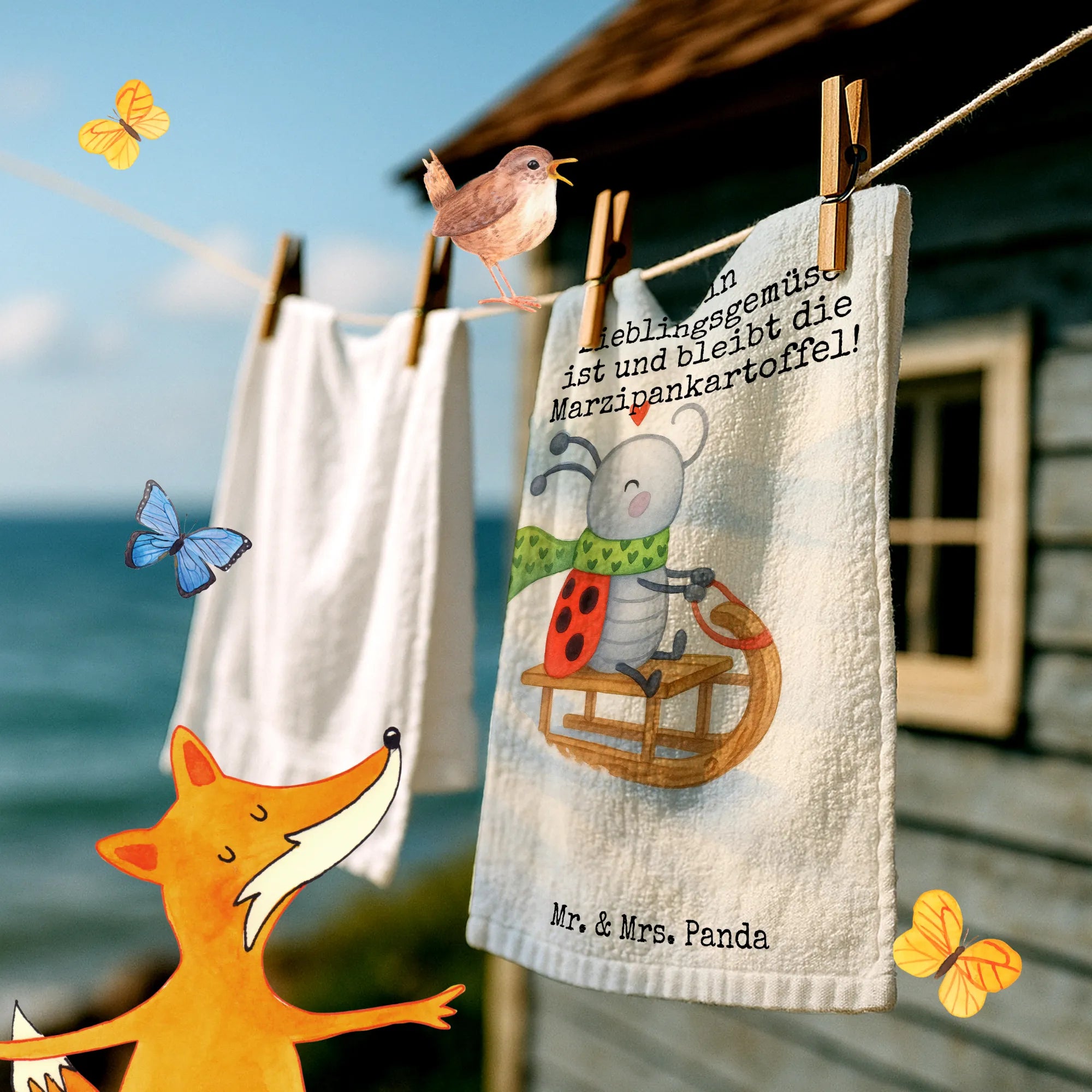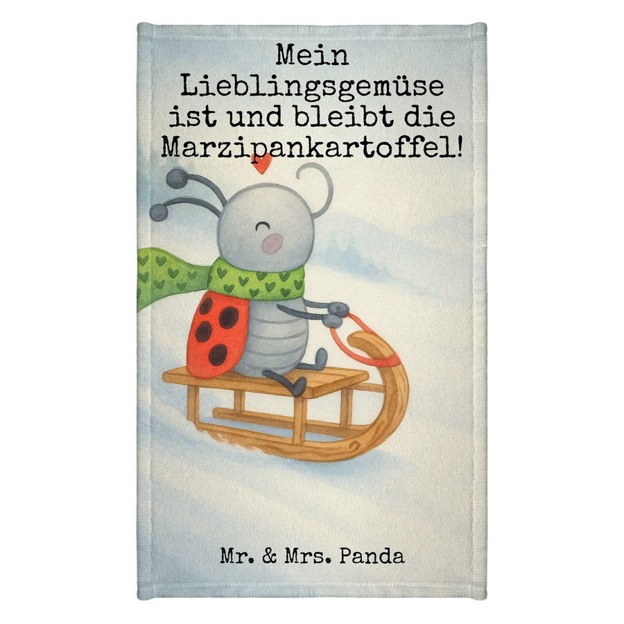 Picture this: a smiling ladybug, cozy in its green heart-patterned scarf, gleefully sledding through pristine snow, embodying the pure bliss of winter activities. With its joyful expression and a floating heart above, it's a celebration of fun, laughter, and those delicious marzipan moments that make our hearts flutter. This motif, together with the slogan 'Mein Lieblingsgemüse ist und bleibt die Marzipankartoffel!', beautifully blends nostalgia and sweetness, reminding us to find joy and warmth even in the coldest of seasons. Embrace the sledding spirit and the sweetness of marzipan as you navigate through winter’s chilly embrace.