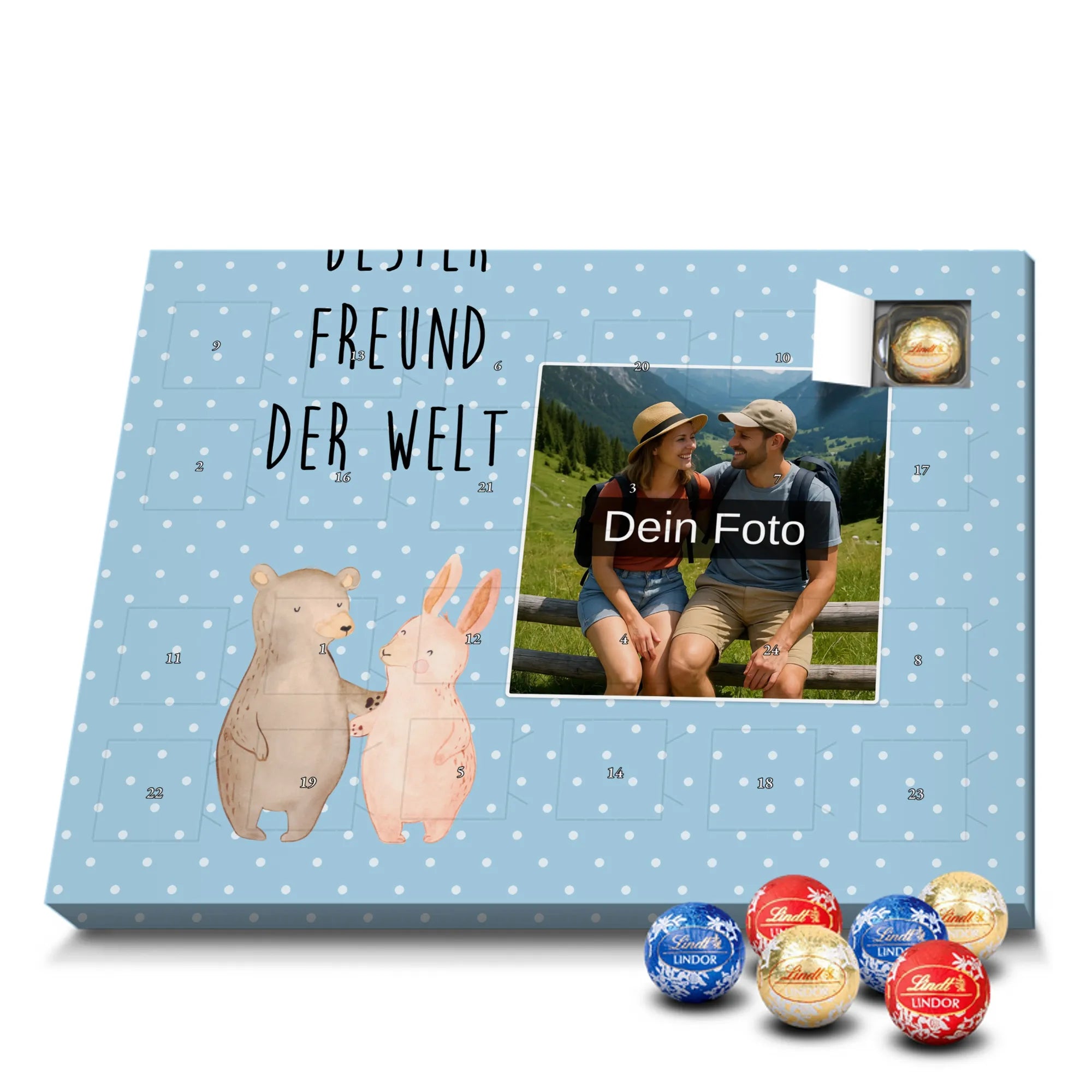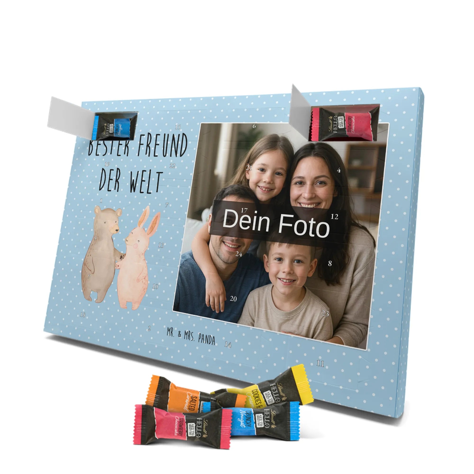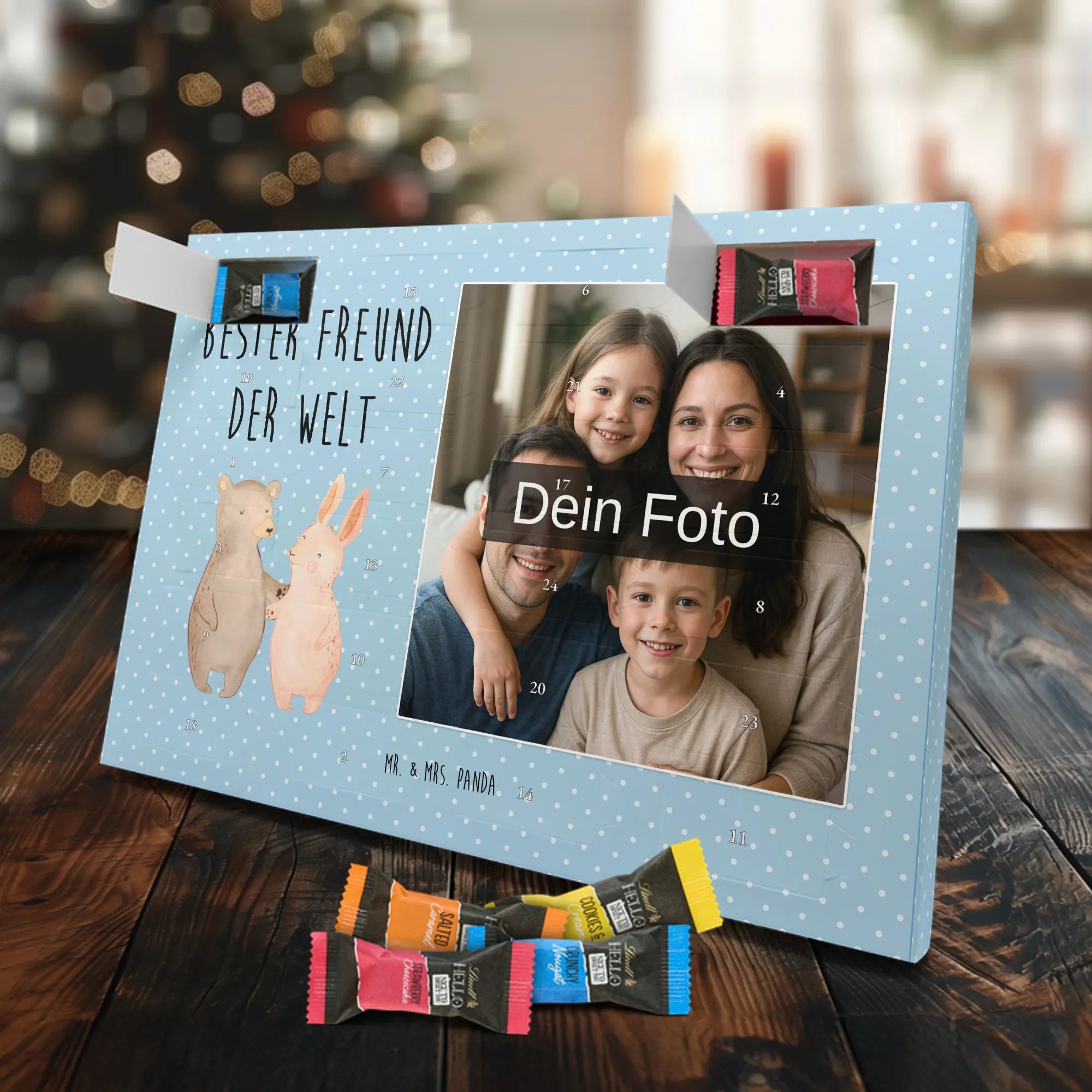 Discover the magic of waiting for Christmas with our exclusive Personalized Chocolate Photo Advent Calendar from Mr. & Mrs. Panda. This unique gift can be personalized with your own photo and is surrounded by beautiful designs and quotes. Enjoy a high-quality chocolate sphere in a variety of colors each day during the Advent season, while the silver sheen of the photo print in brilliant quality enchants your room. Perfect for capturing special moments and enhancing the anticipation of Christmas.
