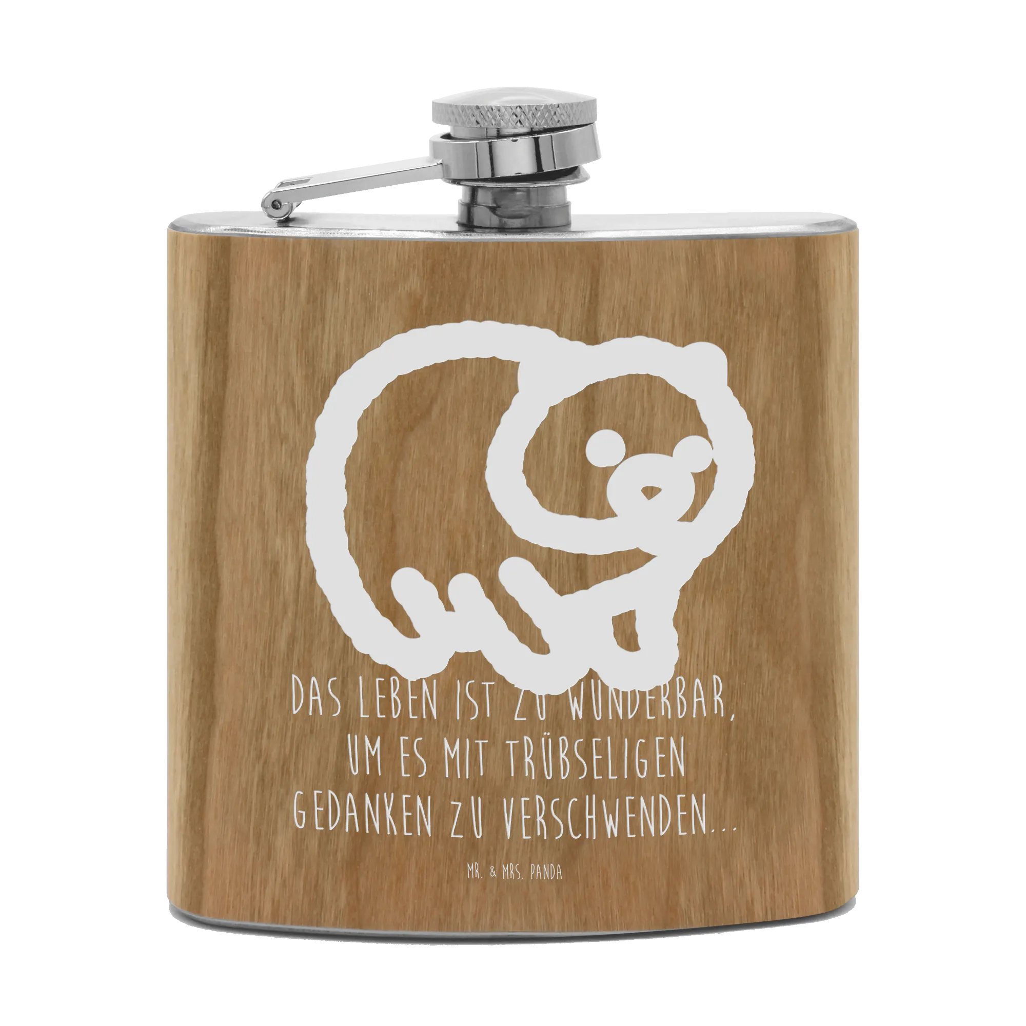 Discover the Mr. & Mrs. Panda Hipflask, the ultimate blend of style and practicality! Constructed from high-grade stainless steel and sleek wood laminate, this hipflask offers a generous capacity of 150 ml (5 oz). Compactly measuring 109 mm (4 inch) in height, 93 mm (4 inch) in width, and 22 mm (1 inch) in depth, it's perfect for your adventures. Adorned with lovely engravings and playful sayings, this flask is perfect for a night out or a nature walk. Lightweight and easy to grip, it features a secure screw cap for your peace of mind. To keep your flask looking great, avoid the dishwasher and simply rinse it with hot water! Whether gifting or keeping, this Mr. & Mrs. Panda Hipflask is sure to impress!