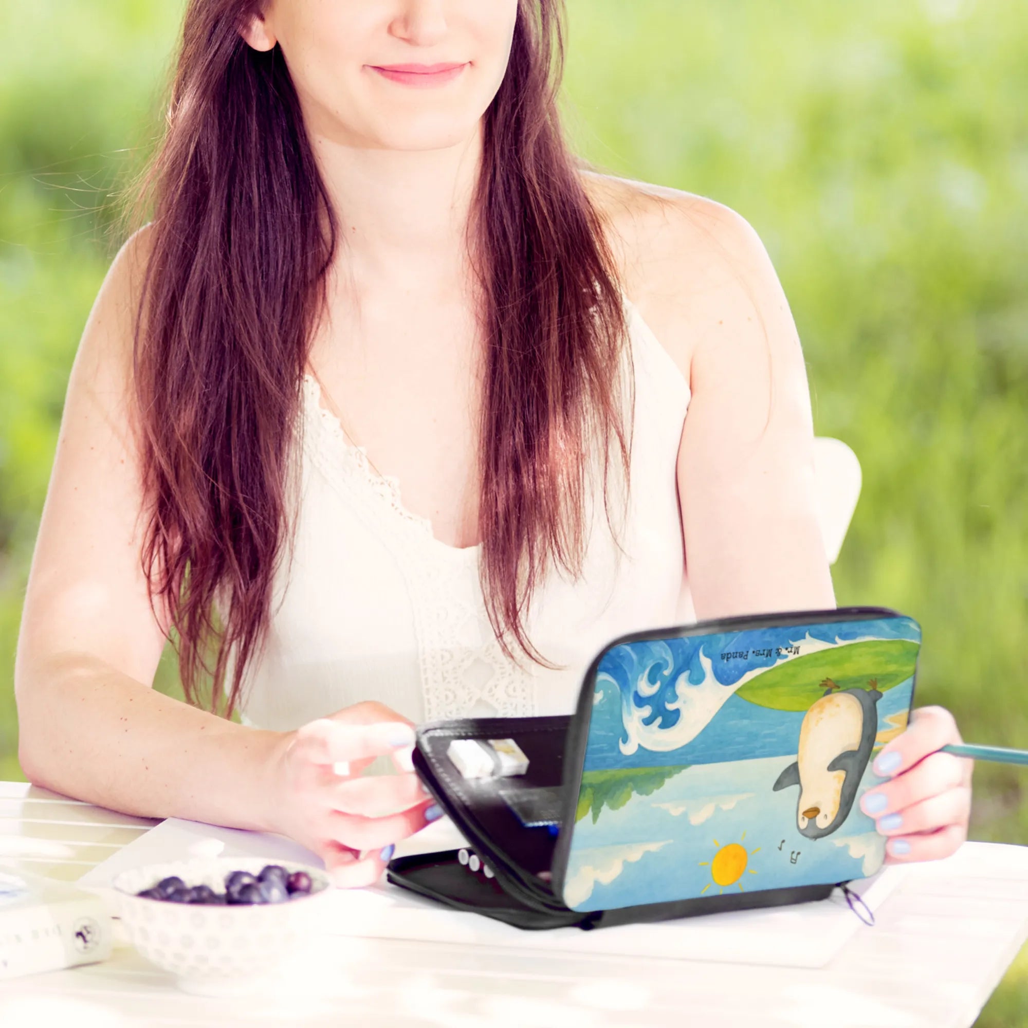 Leather folder Penguin surfer Design - with a saying