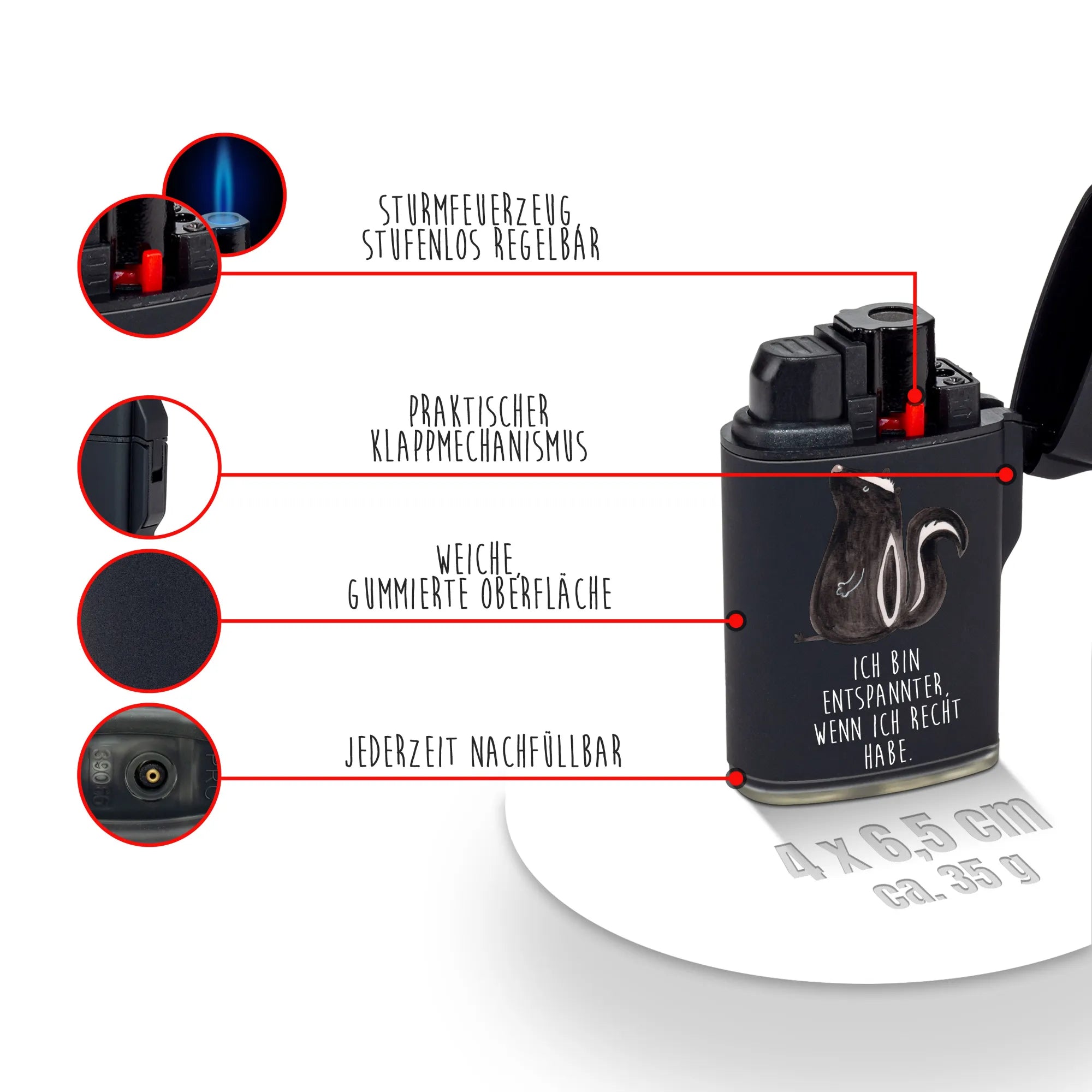 Imagine giving this lighter to a friend who’s always ready for spontaneous adventures or perhaps to that know-it-all colleague who loves to spark conversations at the office! The slogan, "Ich bin entspannter, wenn ich Recht habe," which translates to "I am more relaxed when I am right," humorously encapsulates the sentiment of those who are a bit stubborn — it’s a lighthearted poke at stubbornness that everyone can relate to!