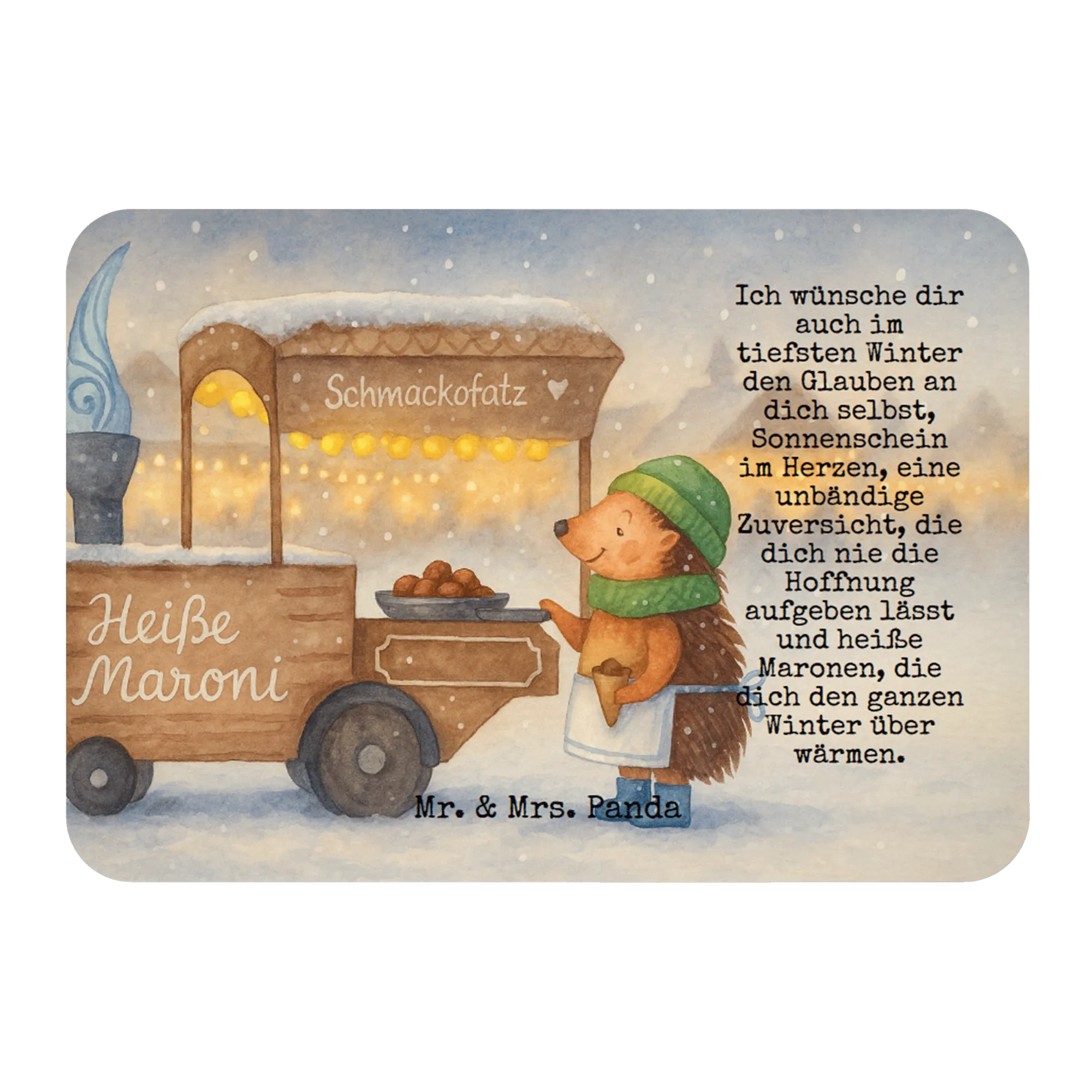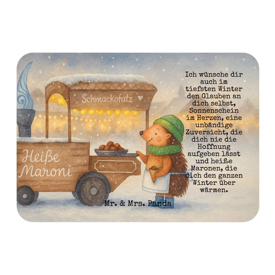 Imagine walking through a bustling Weihnachtsmarkt, the air filled with the sweet fragrance of roasting Maronen. There, under twinkling lights, stands our little hedgehog, surrounded by the warmth of his humble stall. With each delicious chestnut he serves, he shares a piece of joy, spreading warmth not just through food, but through heartfelt words. "Ich wünsche dir auch im tiefsten Winter den Glauben an dich selbst, Sonnenschein im Herzen, eine unbändige Zuversicht, die dich nie die Hoffnung aufgeben lässt und heiße Maronen, die dich den ganzen Winter über wärmen." These words resonate deeply, reminding us to hold onto hope and self-belief, no matter how cold the world gets. Let's embrace that warmth together, letting it guide us through the winter months, just like those perfect Maronen that nourish our bodies and souls.