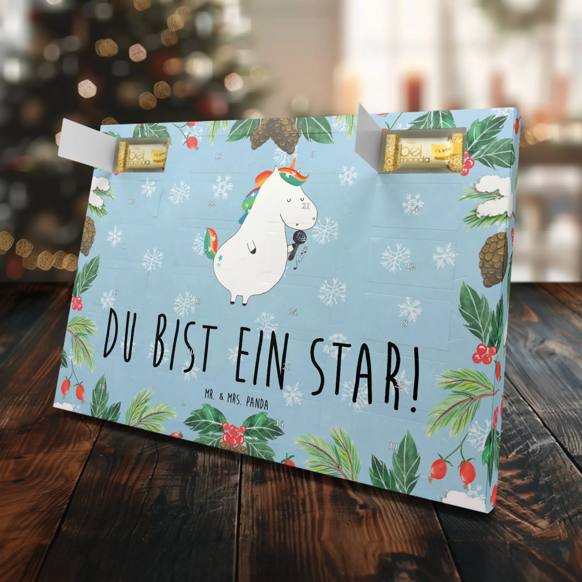 Der Marzipan Adventskalender Einhorn Sänger von Mr. & Mrs. Panda ist der perfekte Adventsbegleiter für alle Einhorn-Liebhaber und Feen, die sich in die zauberhafte Welt der Einhörner träumen! Mit einem bezaubernd handgezeichneten Einhorn, das fröhlich in ein Mikrofon singt, und dem liebevollen Motto 'Du bist ein Star!', bringt dieser Adventskalender jeden Tag im Dezember ein bisschen Glitzer und Freude in dein Zuhause.